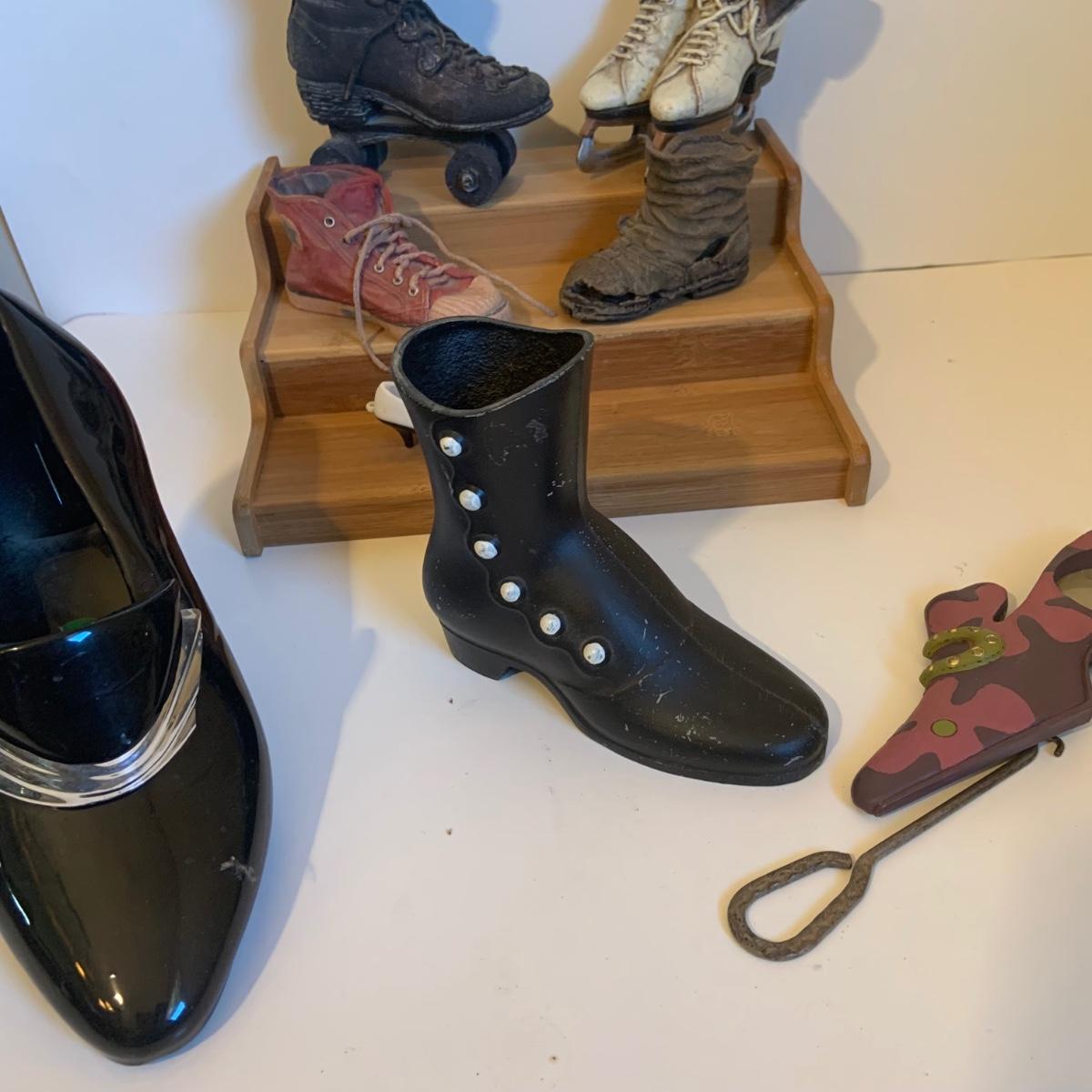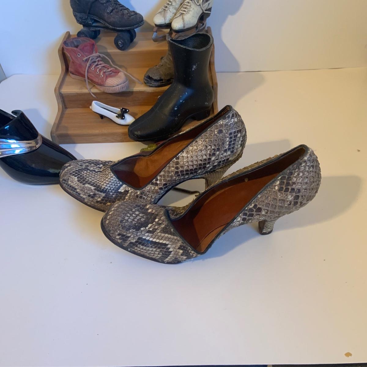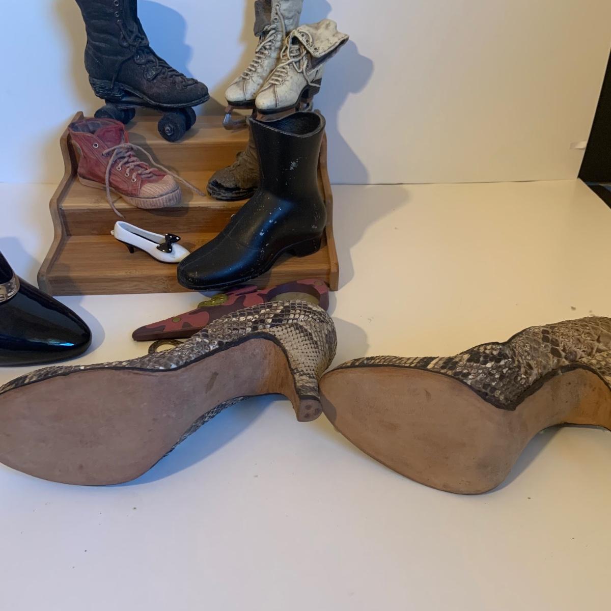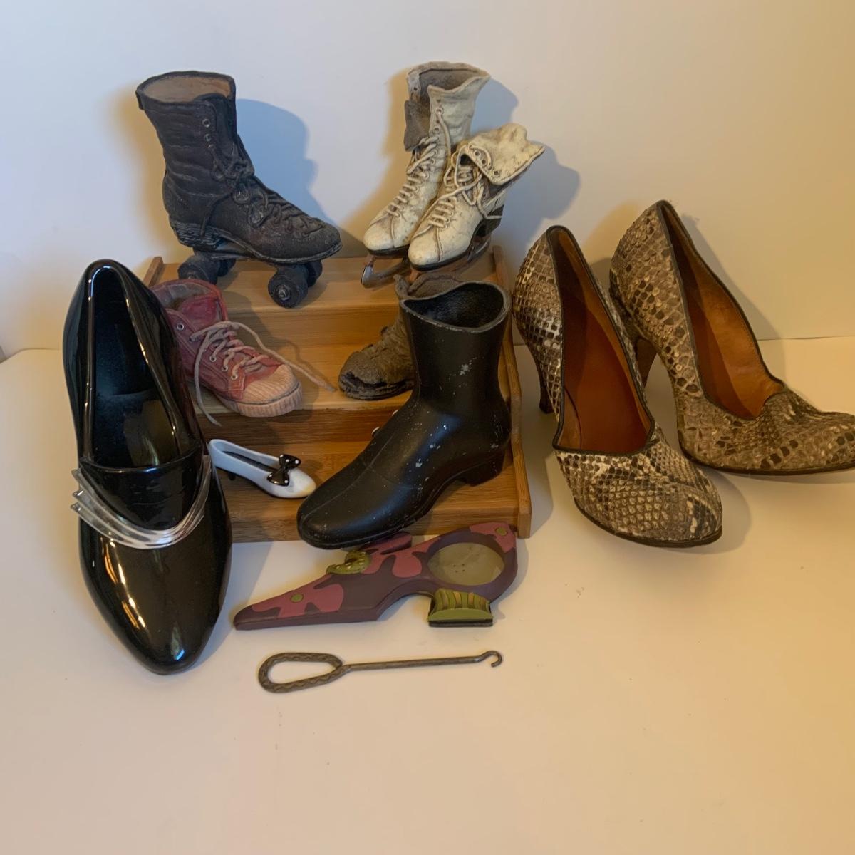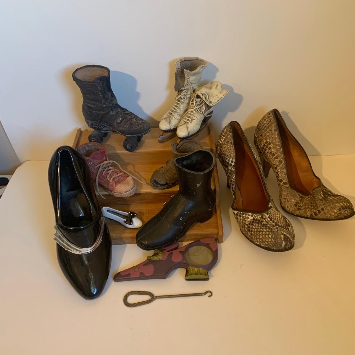 LOT:51G: Decorative Shoes Incluing Skates and Mann Black Cermanic Pumps, Buttonhook and a Pair of Vintage Snakeskin Pumps