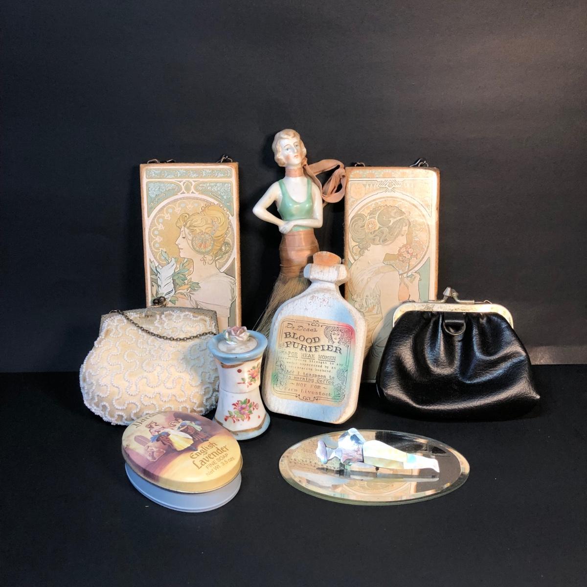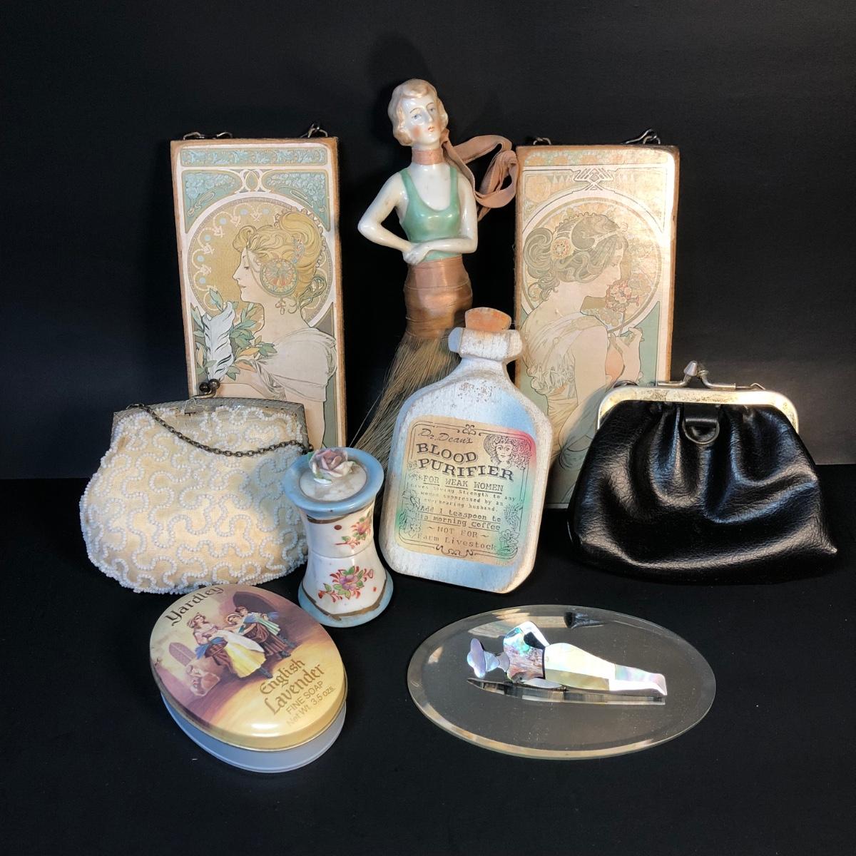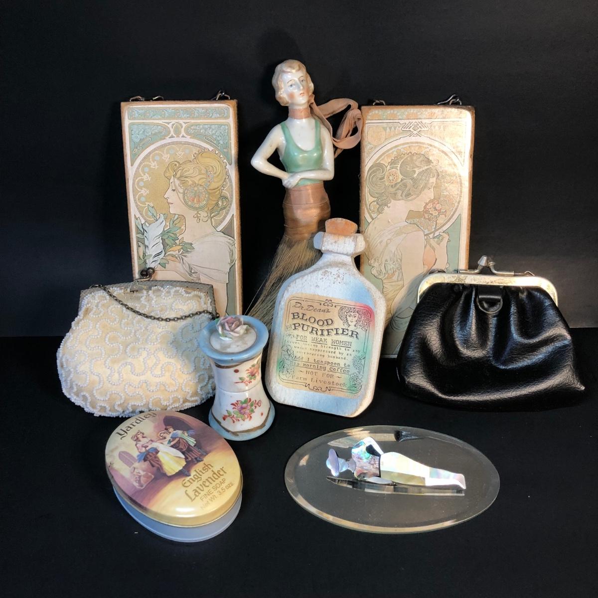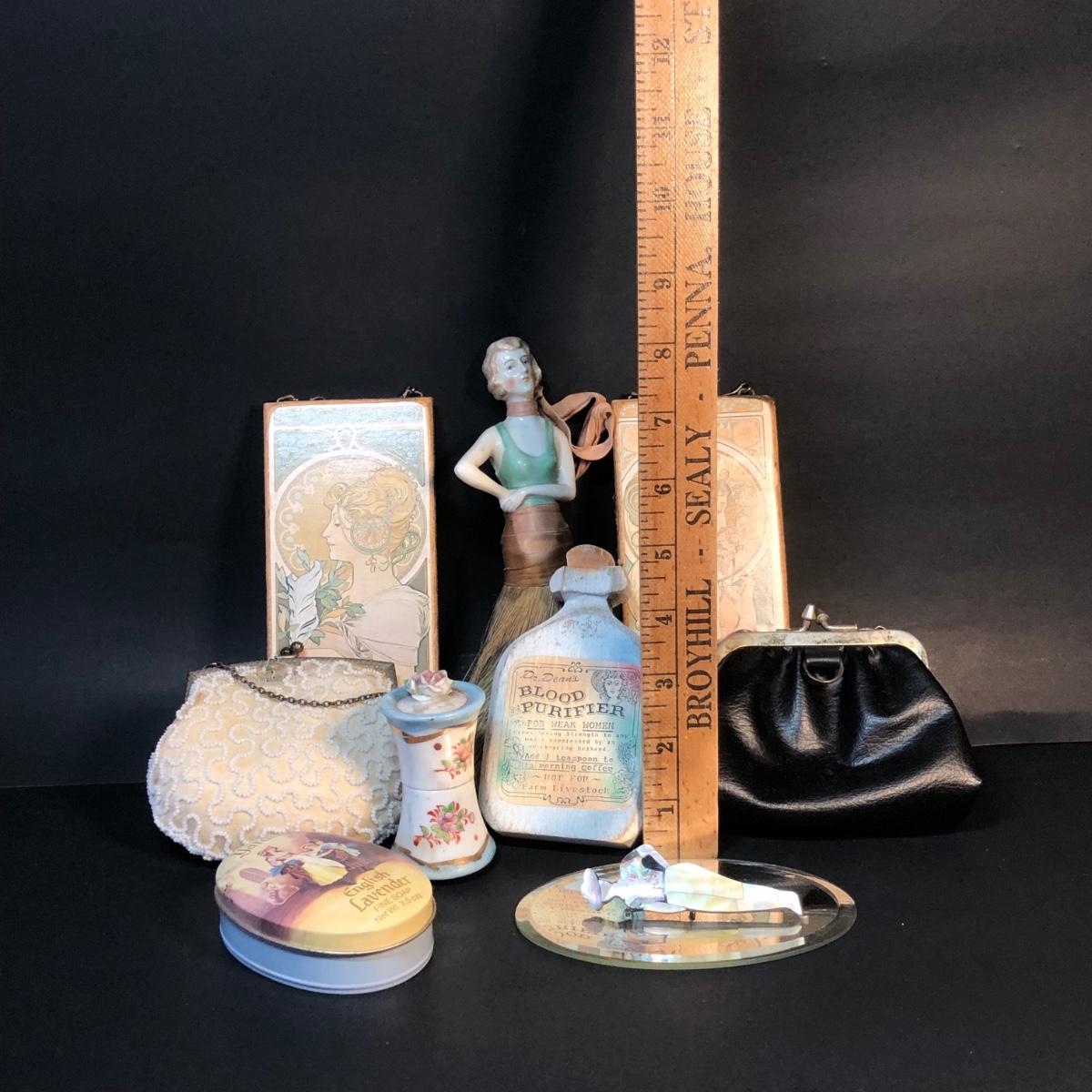 LOT 64M: Roaring 20's Decor Collection - Yardley Lavender Soap, Woman Figure w/ Hat Pin, Antique/Vintage Boudoir Brush Half Ceramic Doll Handle, Wooden Decor Pieces & Vintage Porcelain Floral Lighter