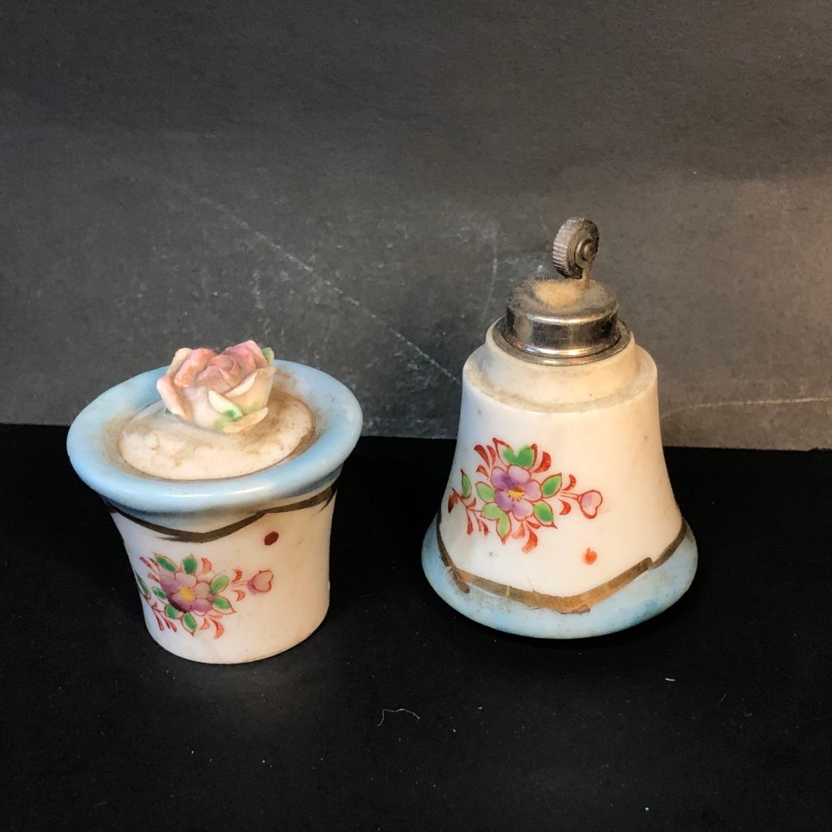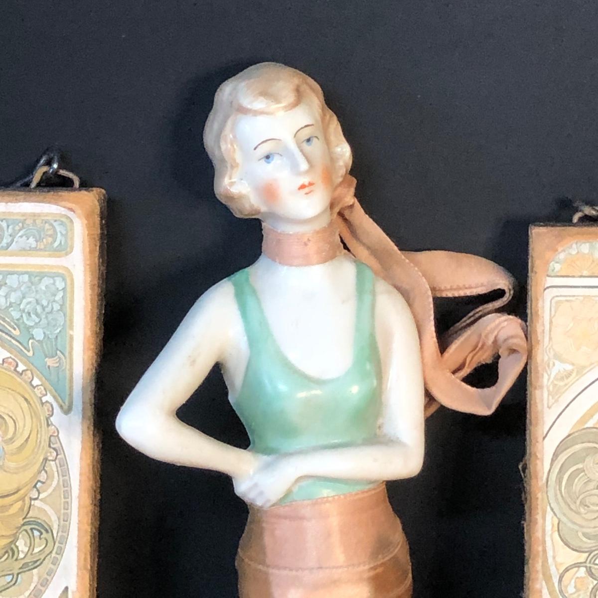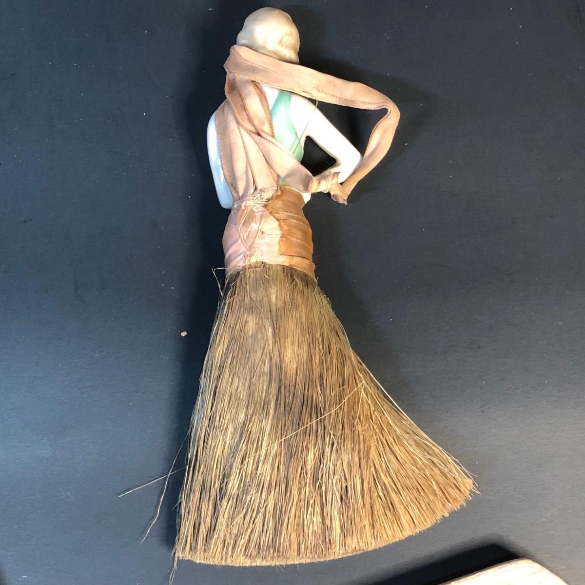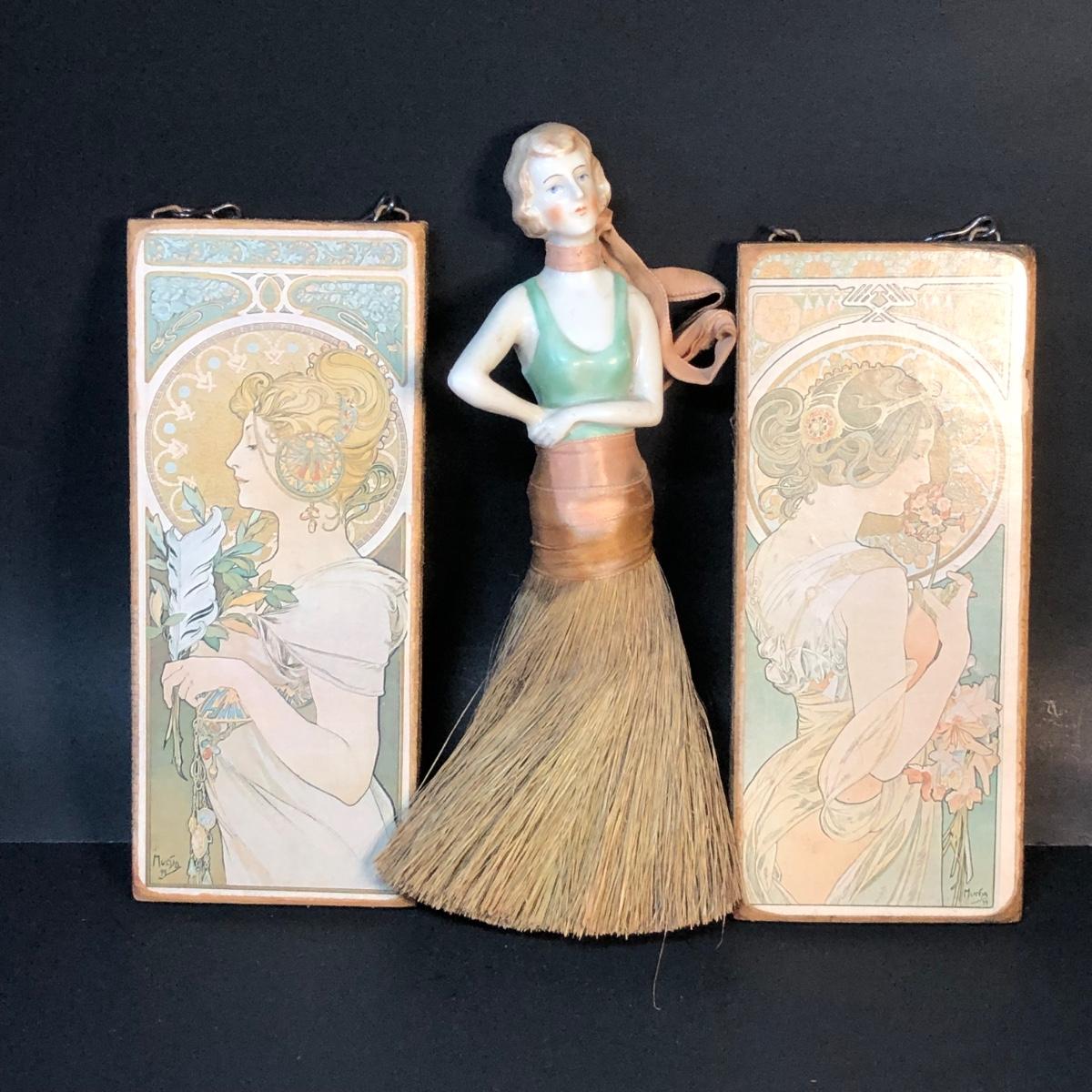 LOT 64M: Roaring 20's Decor Collection - Yardley Lavender Soap, Woman Figure w/ Hat Pin, Antique/Vintage Boudoir Brush Half Ceramic Doll Handle, Wooden Decor Pieces & Vintage Porcelain Floral Lighter