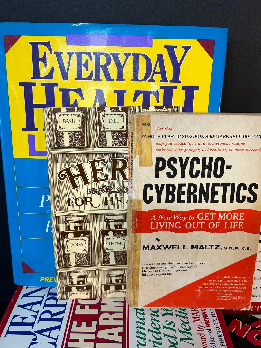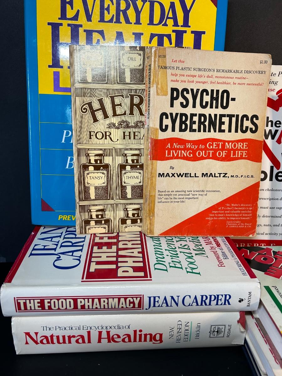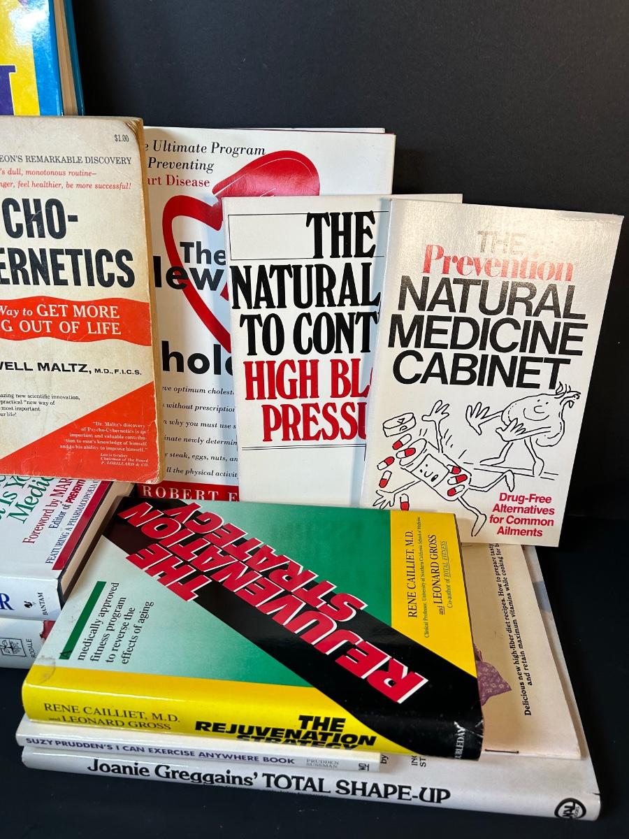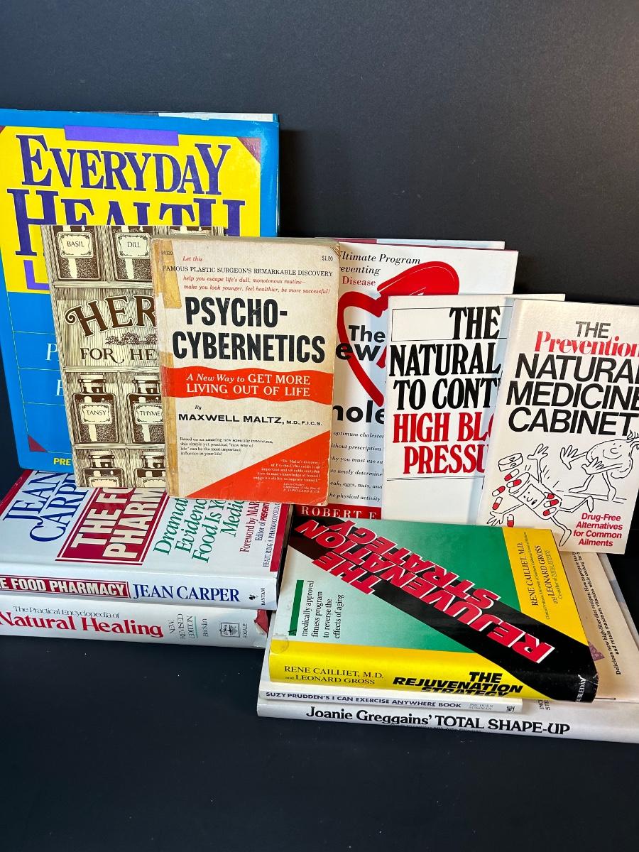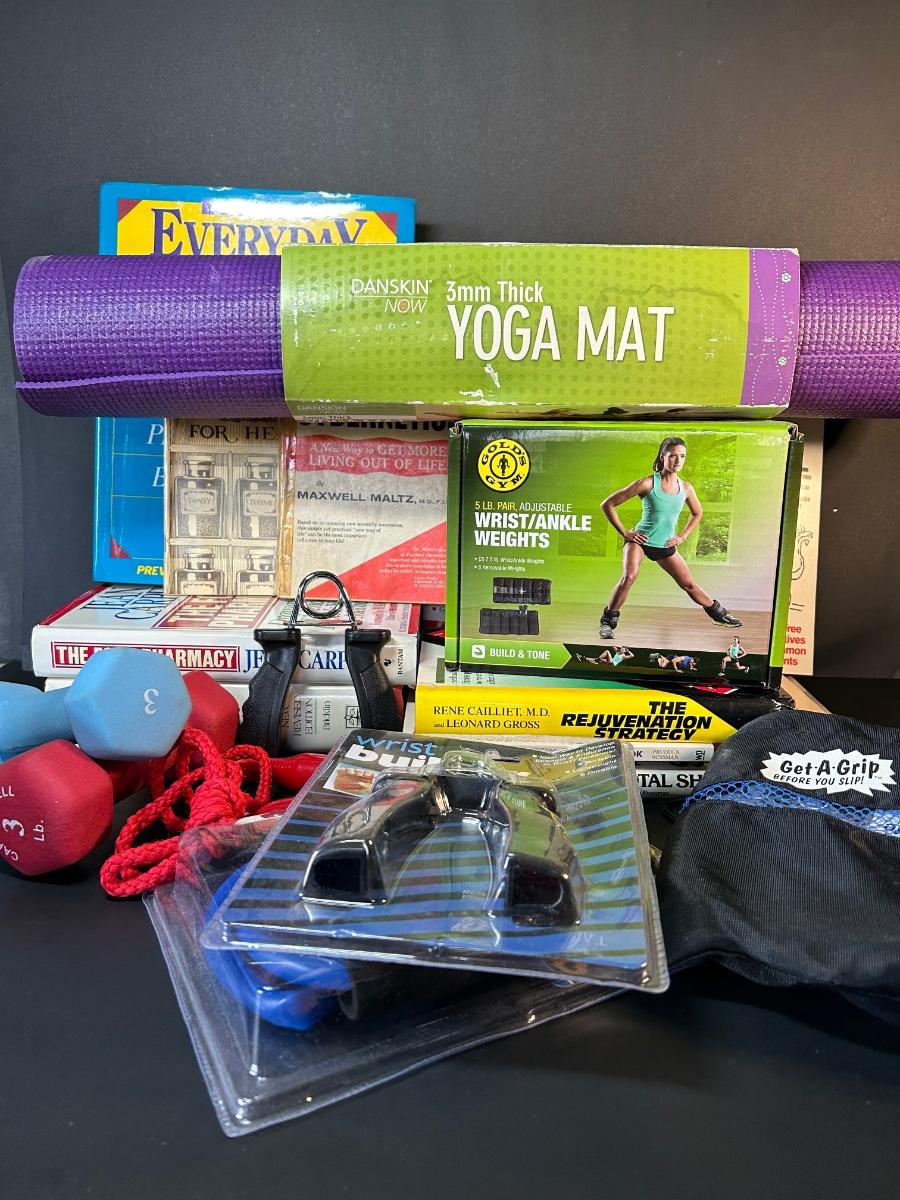 Collection of books about health, 3mm Yoga mat, ankle wights, hand grips and more.