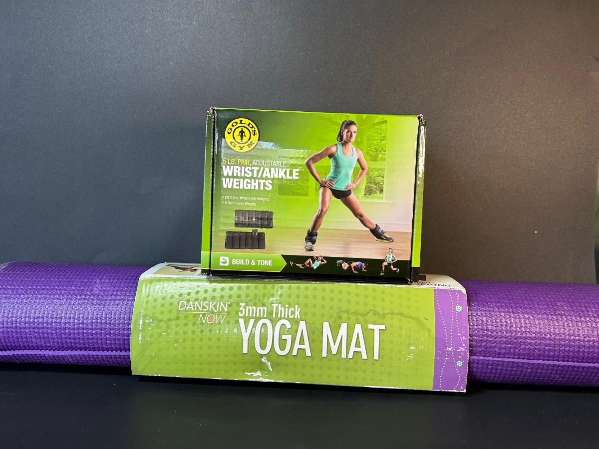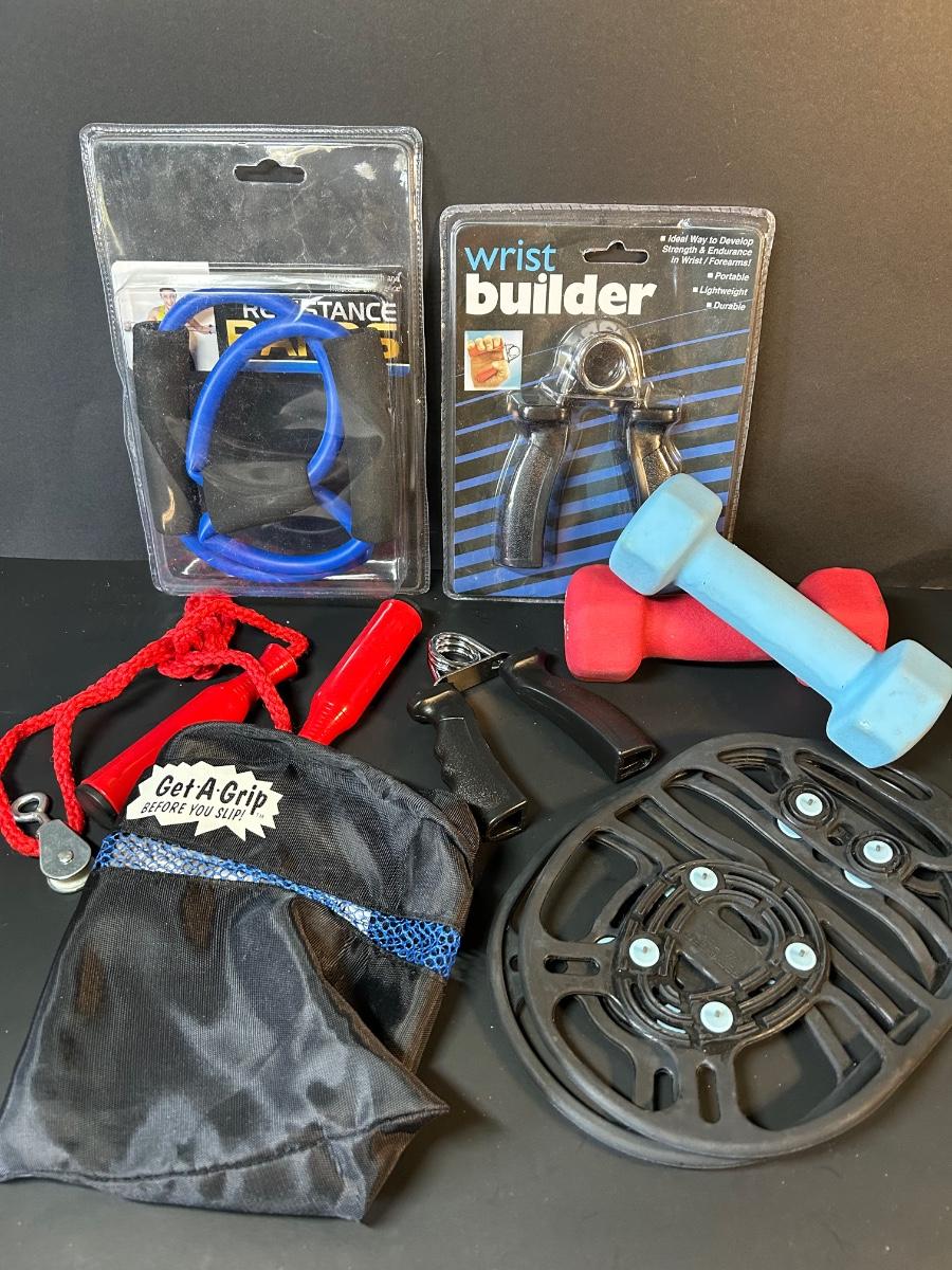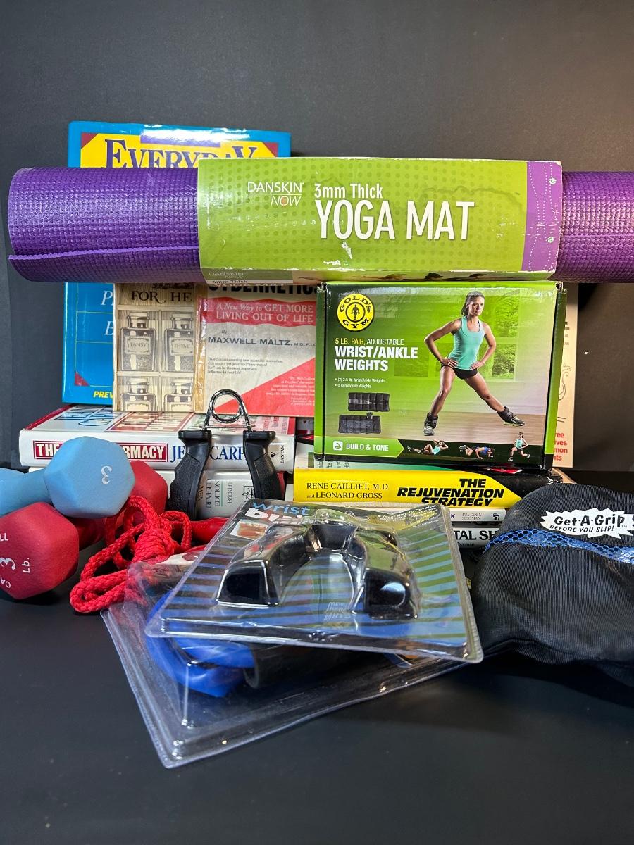 LOT 69C: Weights, Hand Grips, Yoga Mat, Books And More