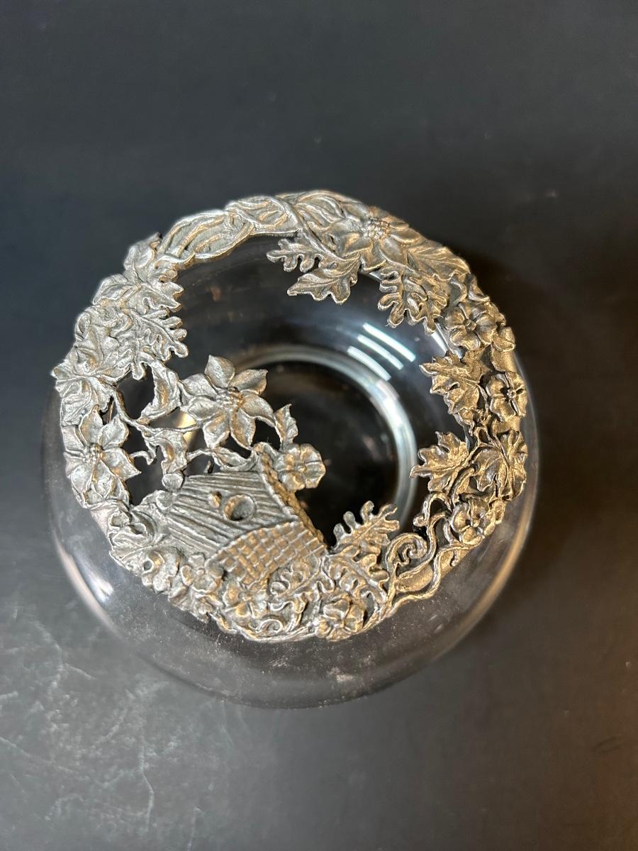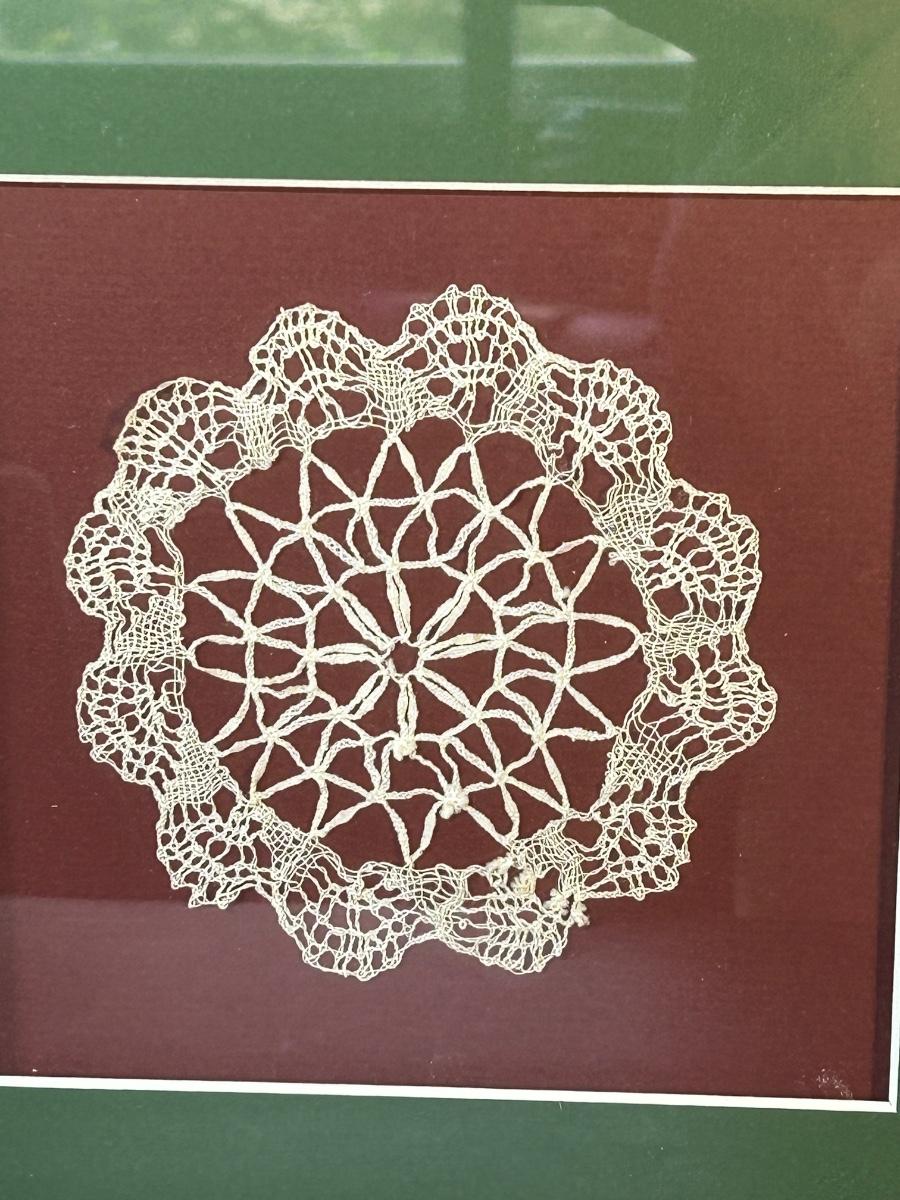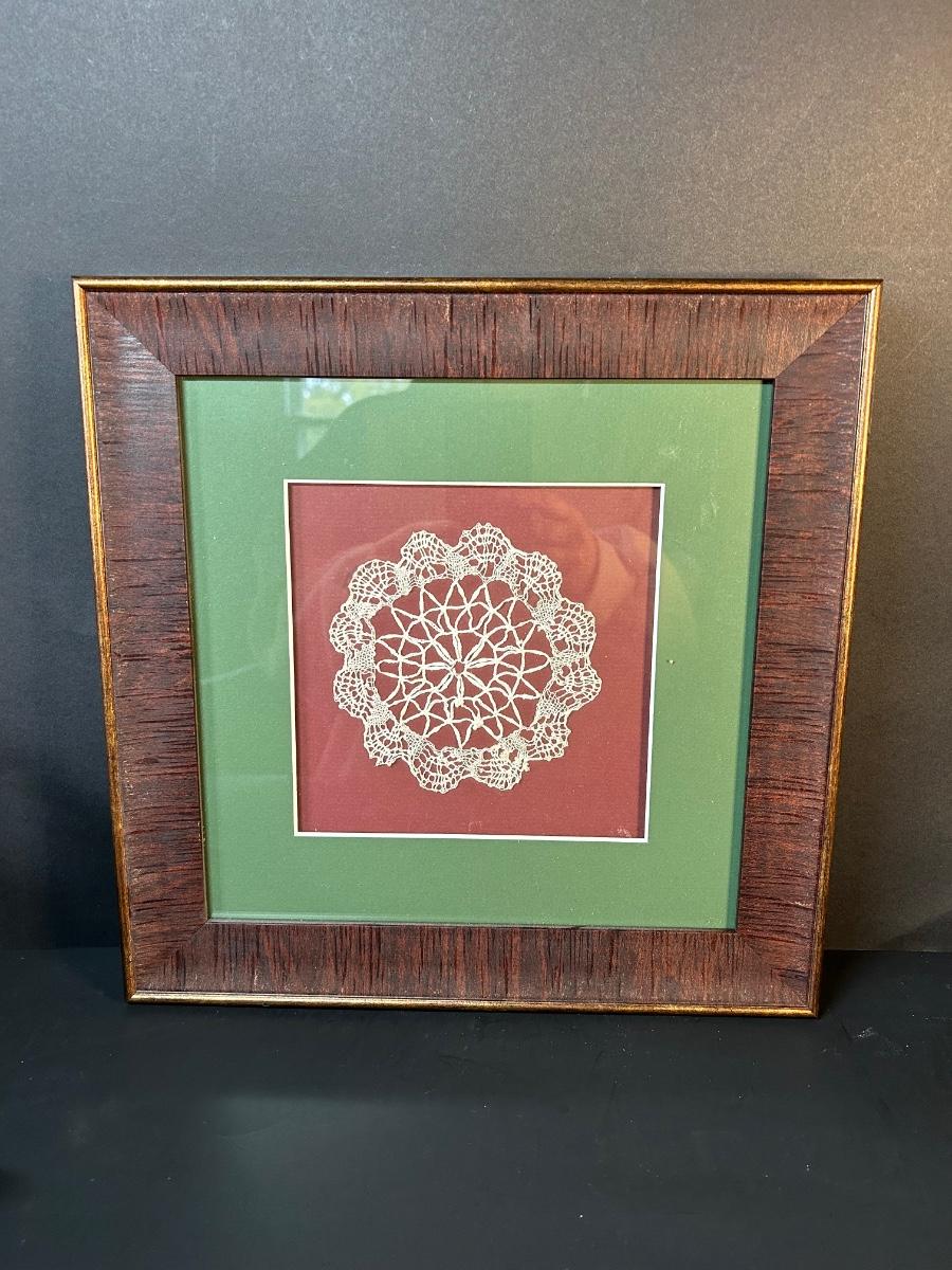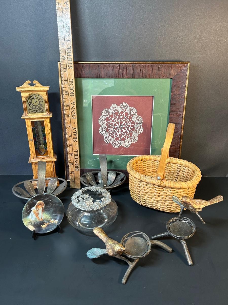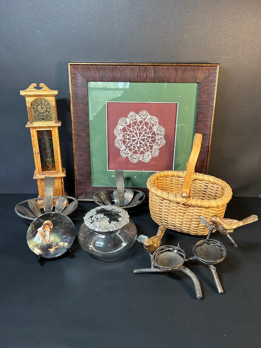 Collection of home decor and details. Framed doily, bird & nest candle holders, Silver baskets, glass and silver trinket bowl, clock and plate to warm up your home.