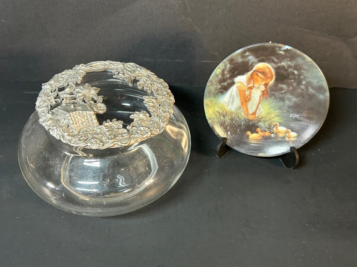 LOT 72C: Framed Art, Silver Baskets, Silver Candleholders, Clock, Plate And More