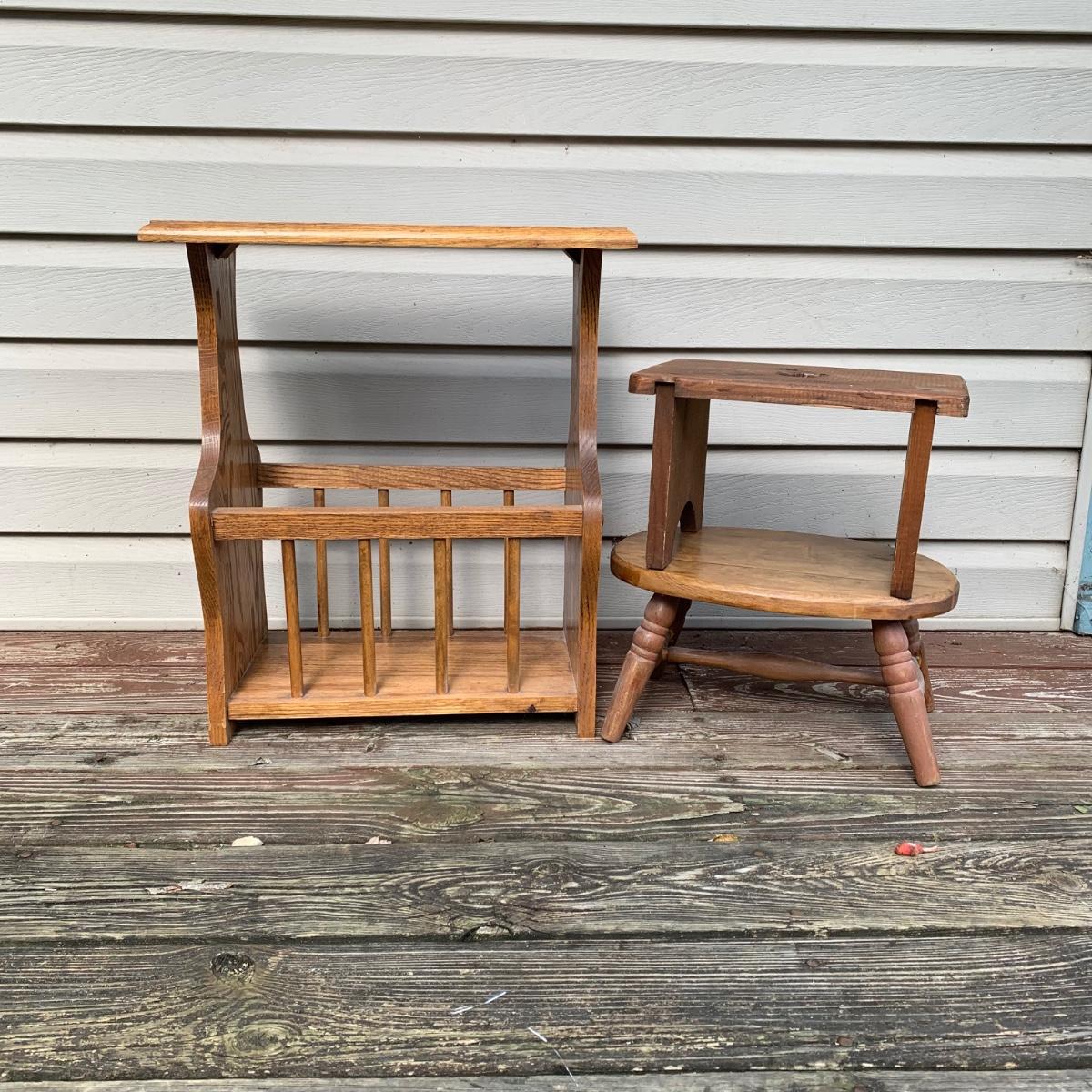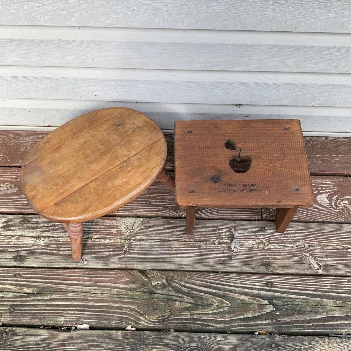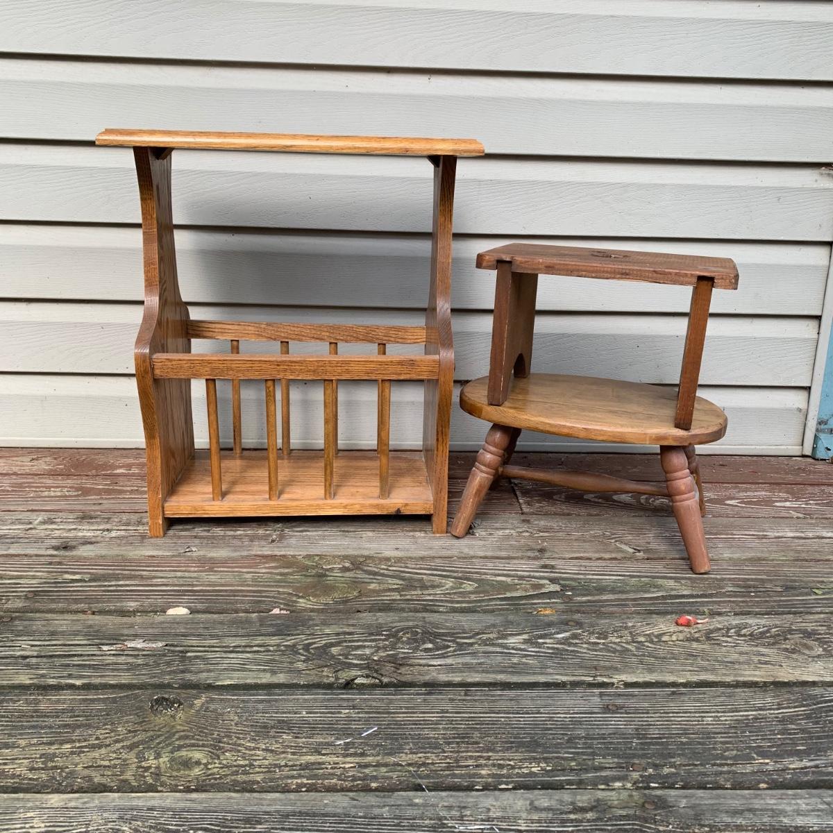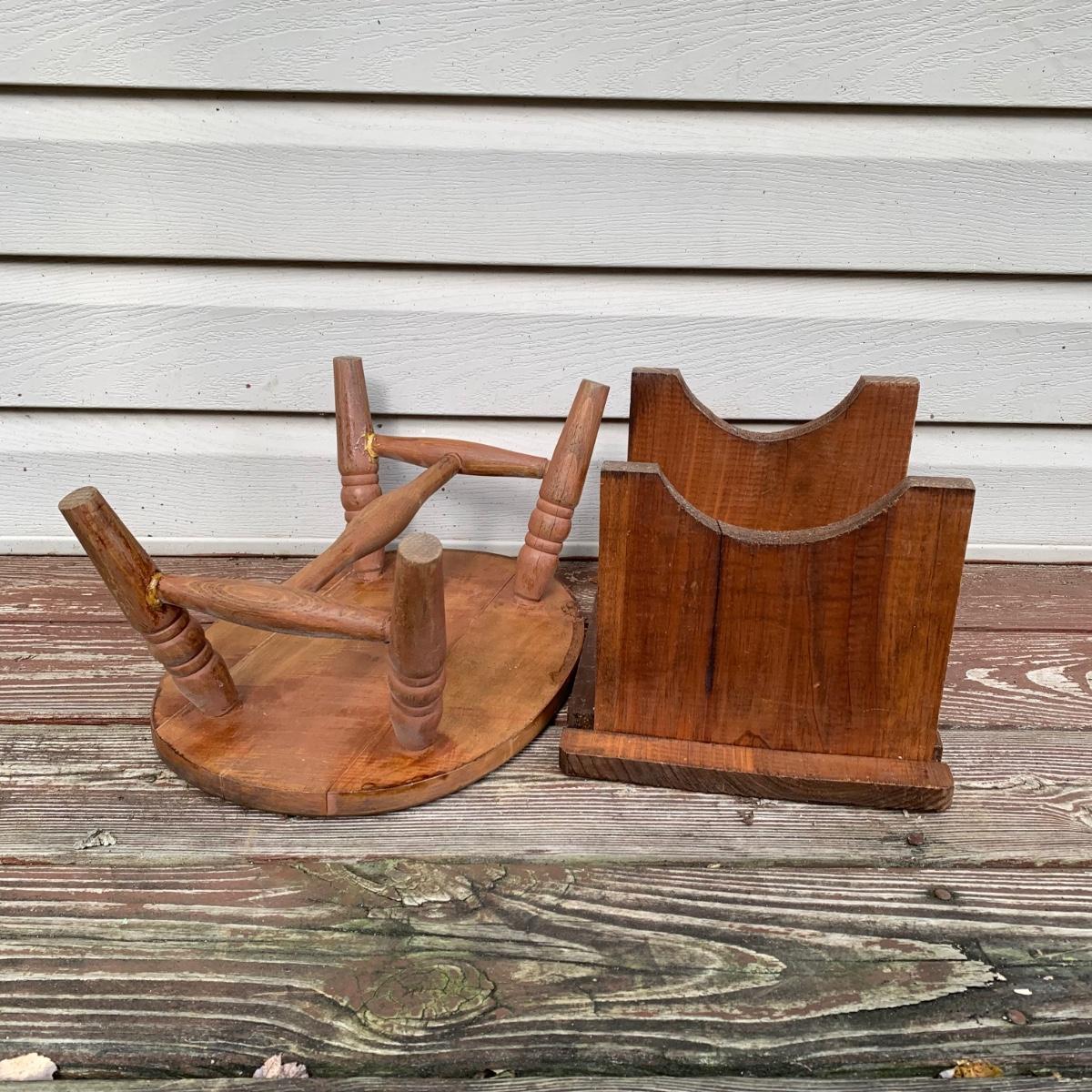 LOT 83R: Vermont Shaker Stool w/Apple Cutout, Primitive Wooden Oval Stool & Wooden Accent Table/Magazine Holder