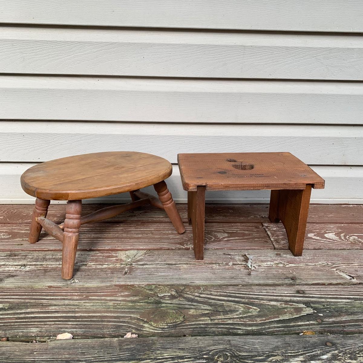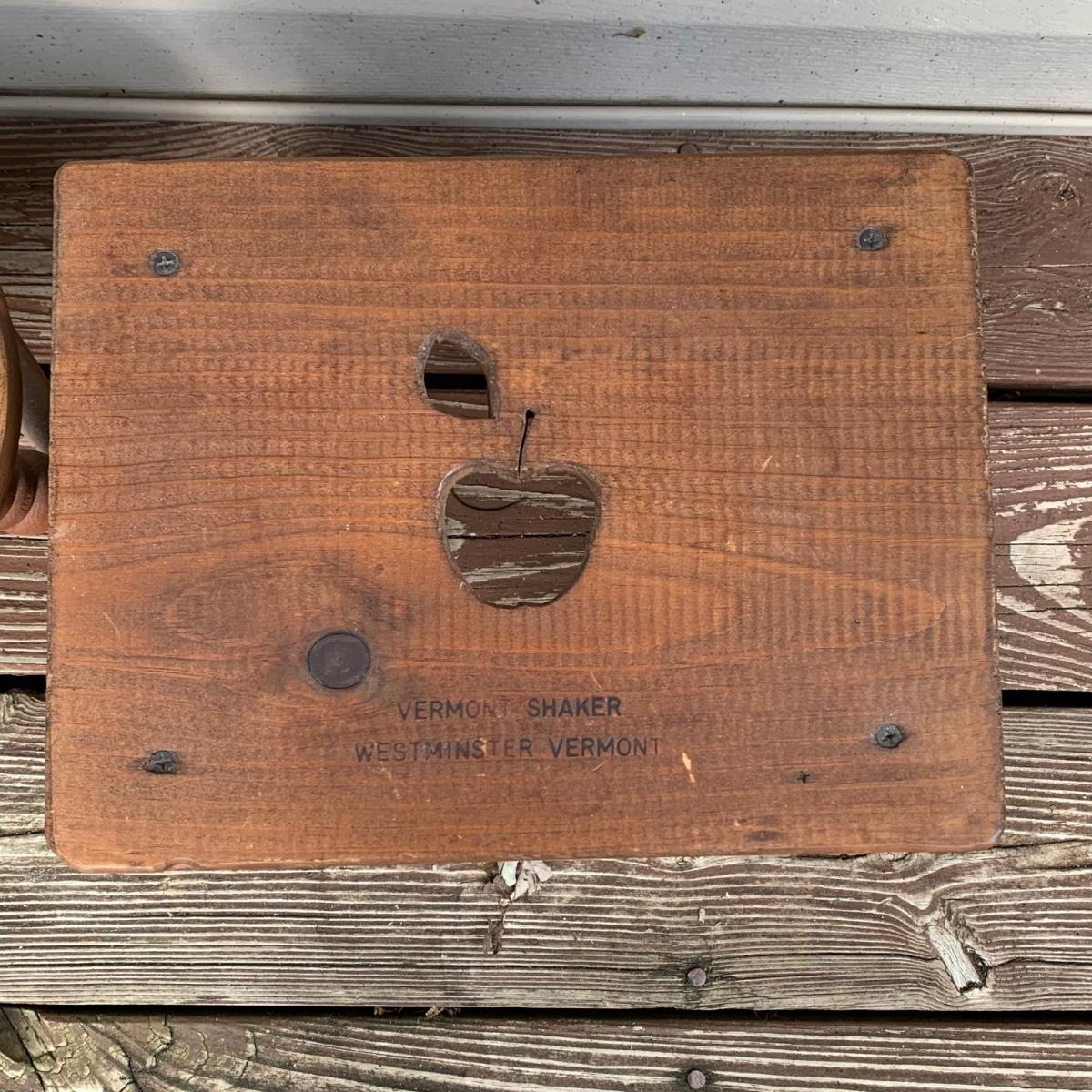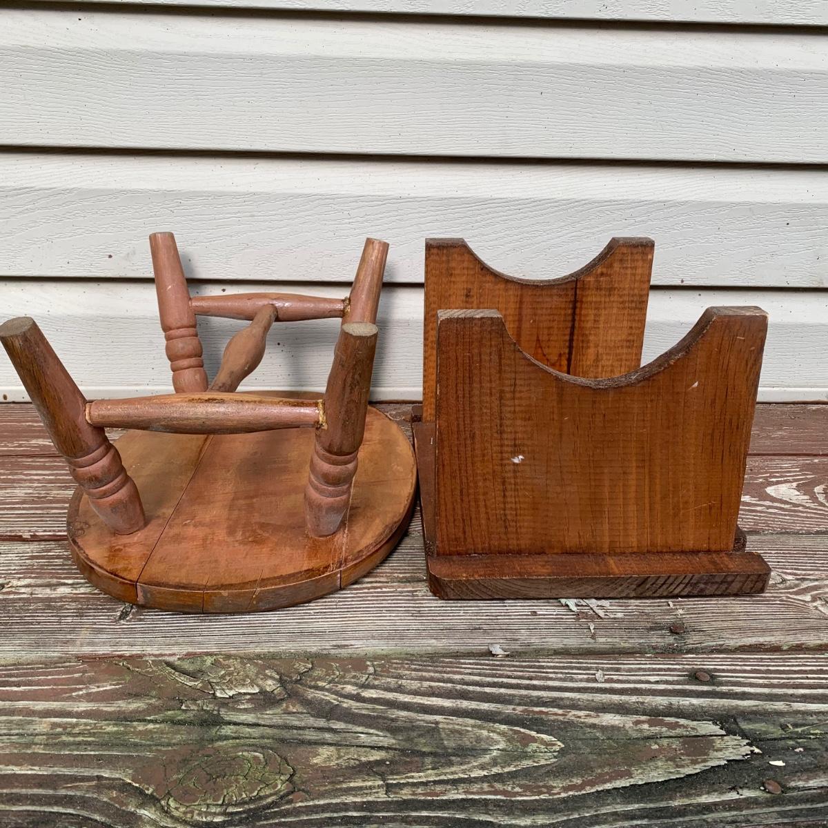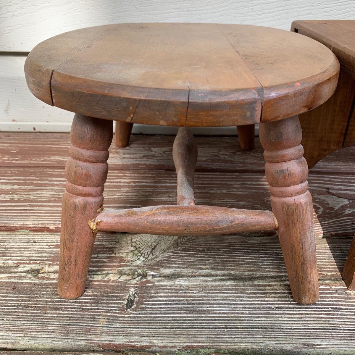 LOT 83R: Vermont Shaker Stool w/Apple Cutout, Primitive Wooden Oval Stool & Wooden Accent Table/Magazine Holder