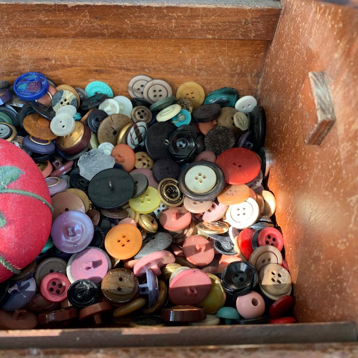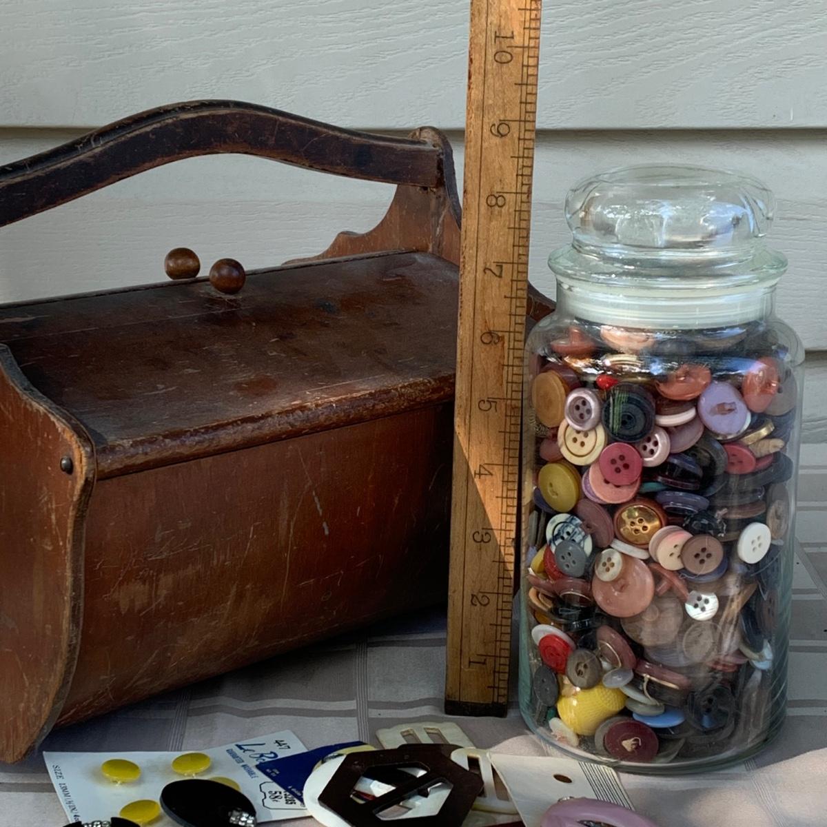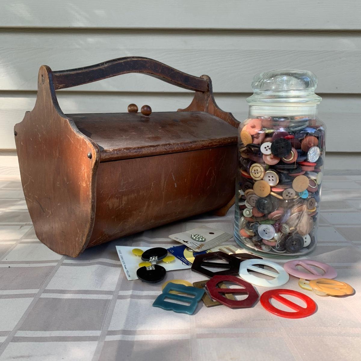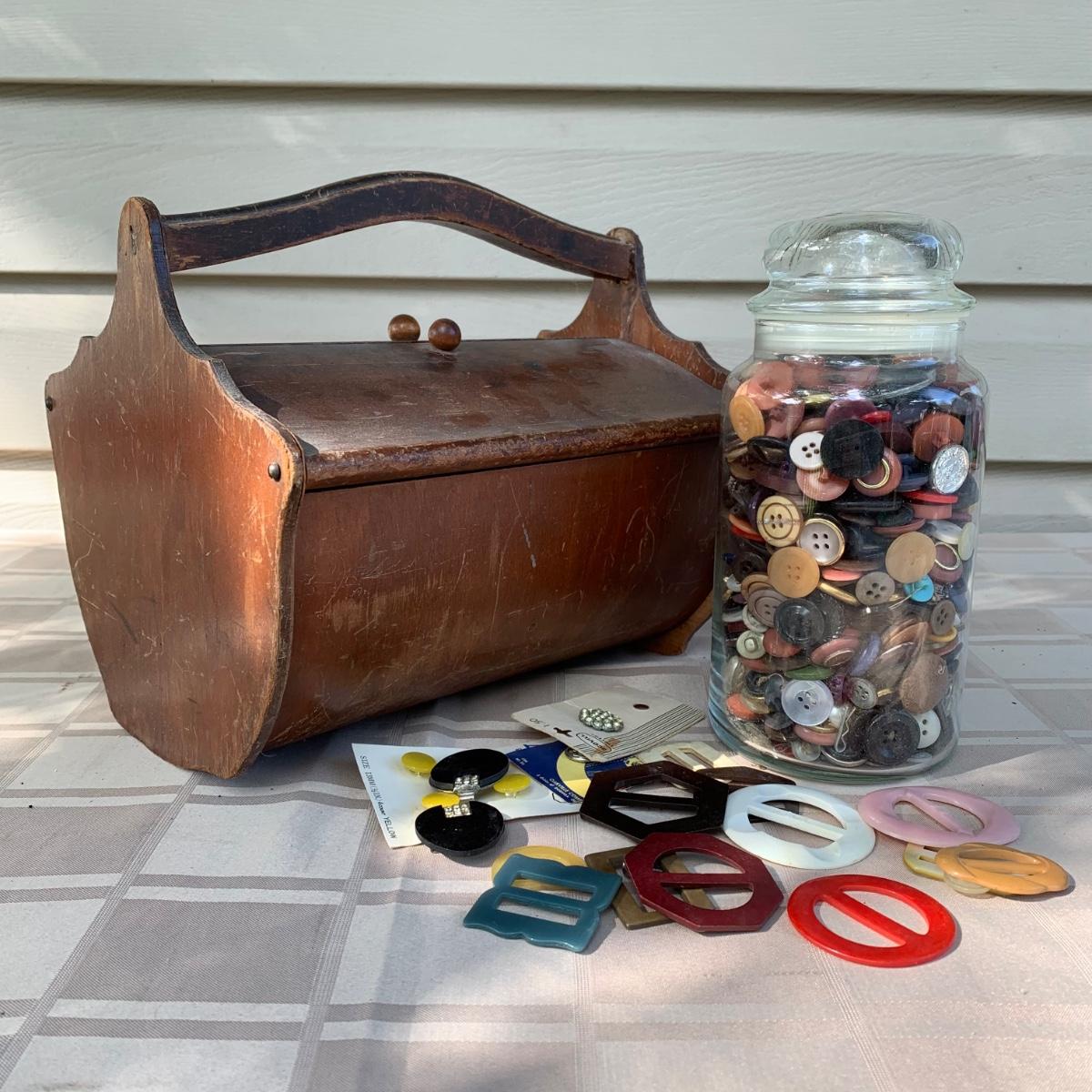LOT 92R: Vintage Wooden Sewing Box Filled w/Buttons, Jar of Buttons & Belt Slides/Buckles