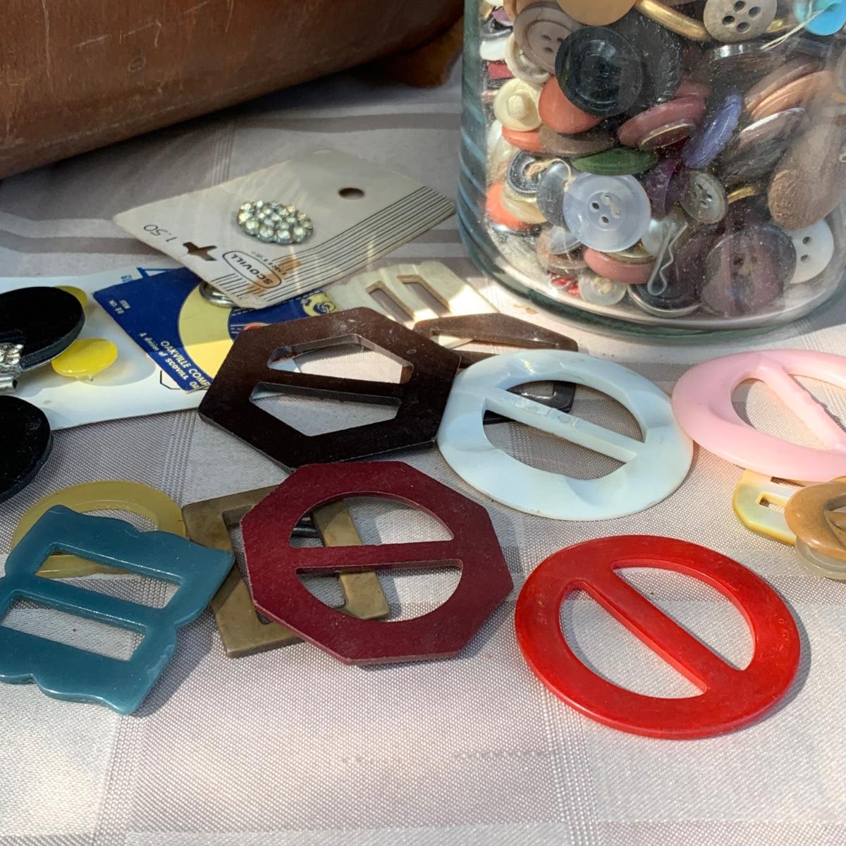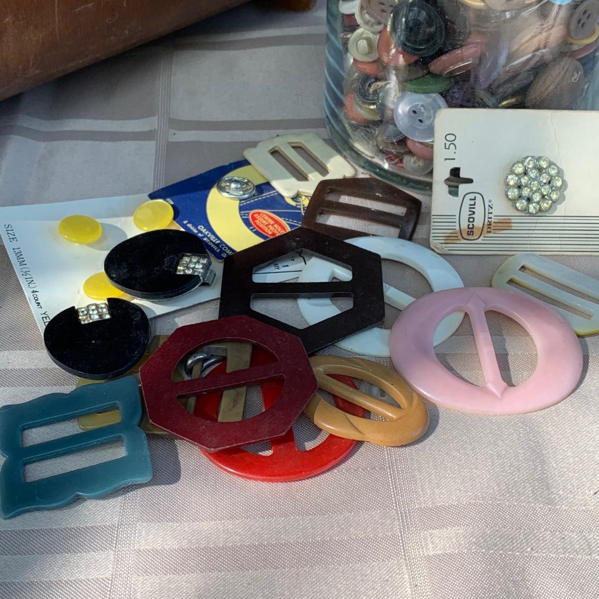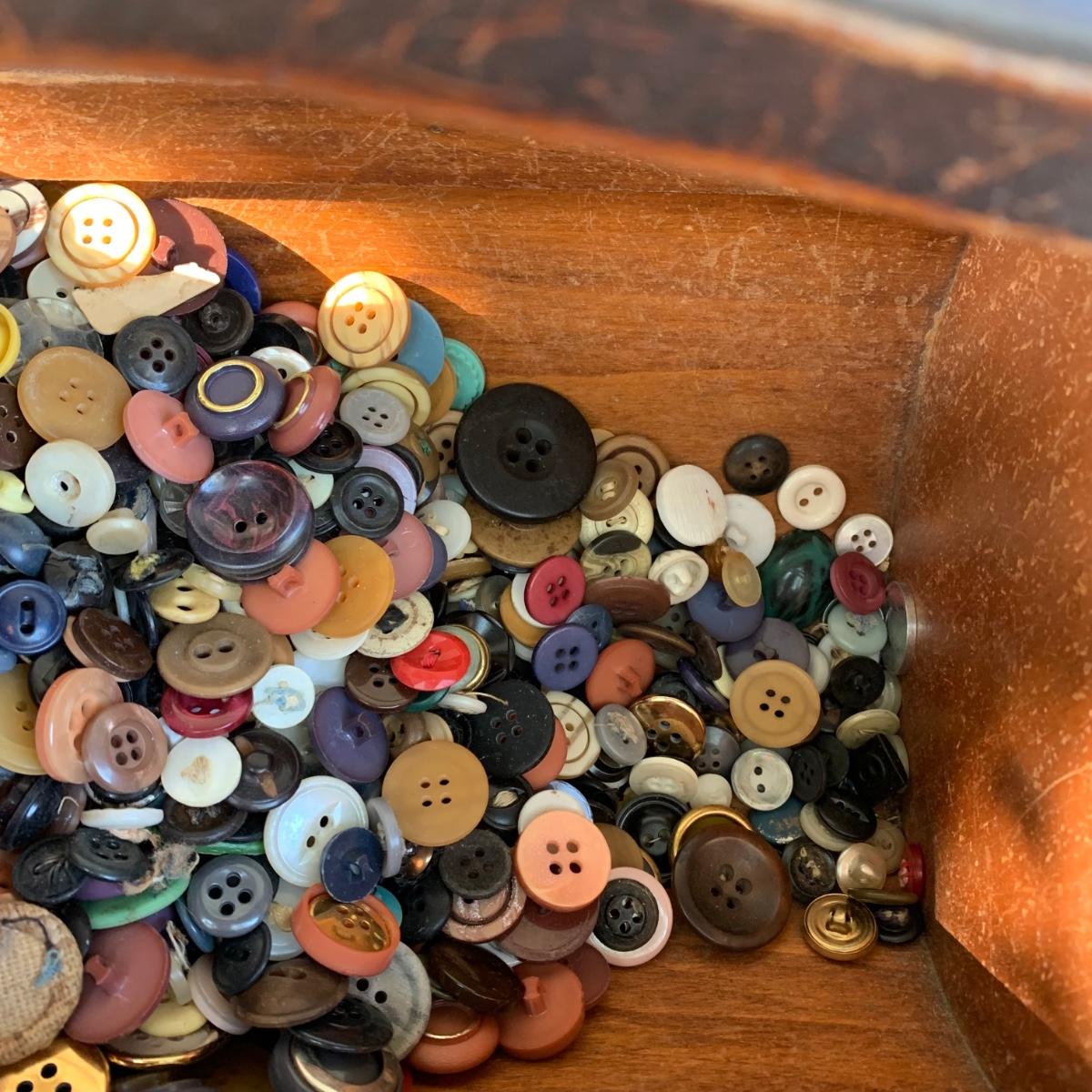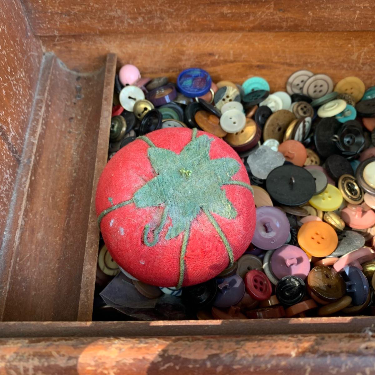 LOT 92R: Vintage Wooden Sewing Box Filled w/Buttons, Jar of Buttons & Belt Slides/Buckles