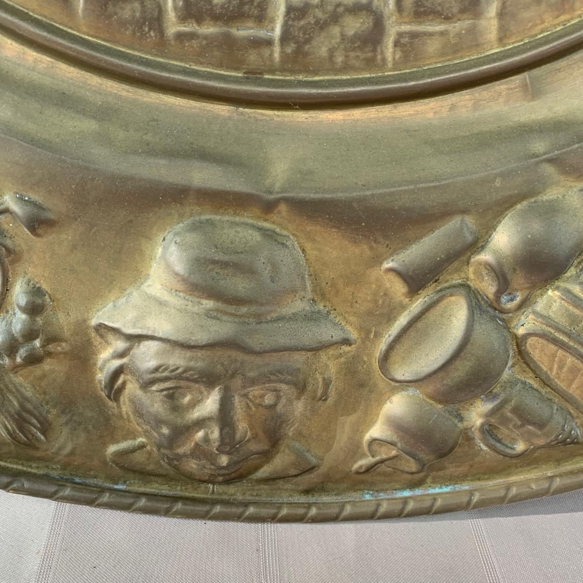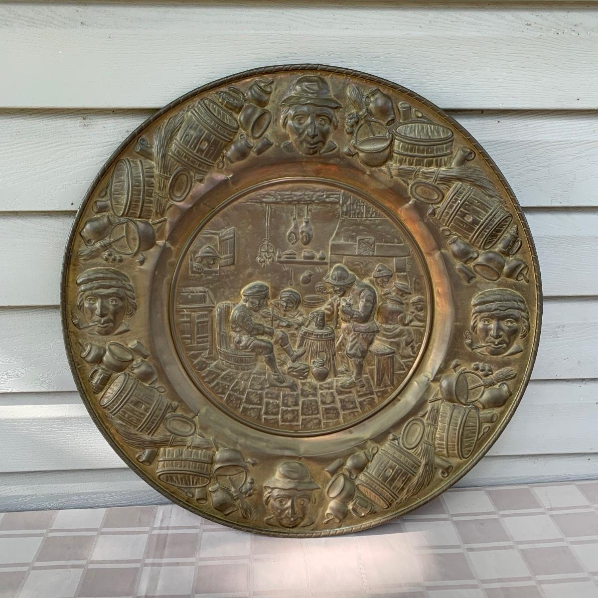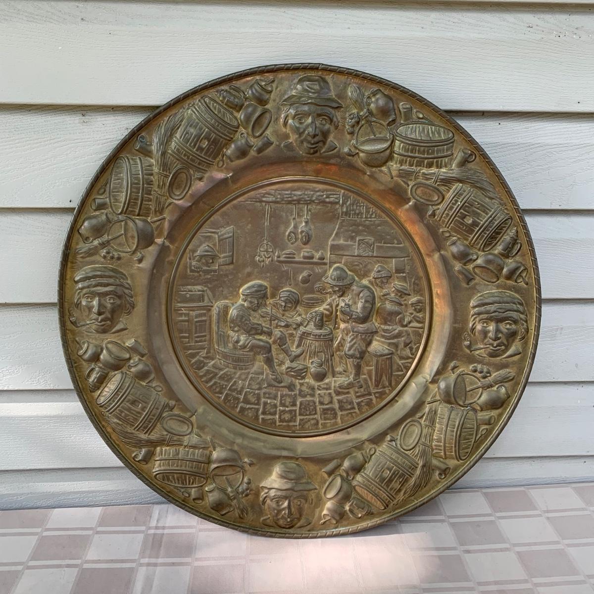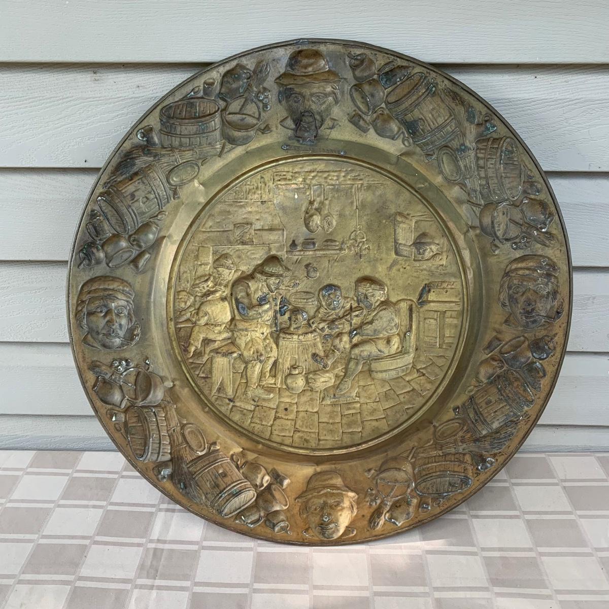 LOT 97R: Vintage Tavern Scene Brass Embossed Wall Plate Hanging 24.5” Diameter Made in France