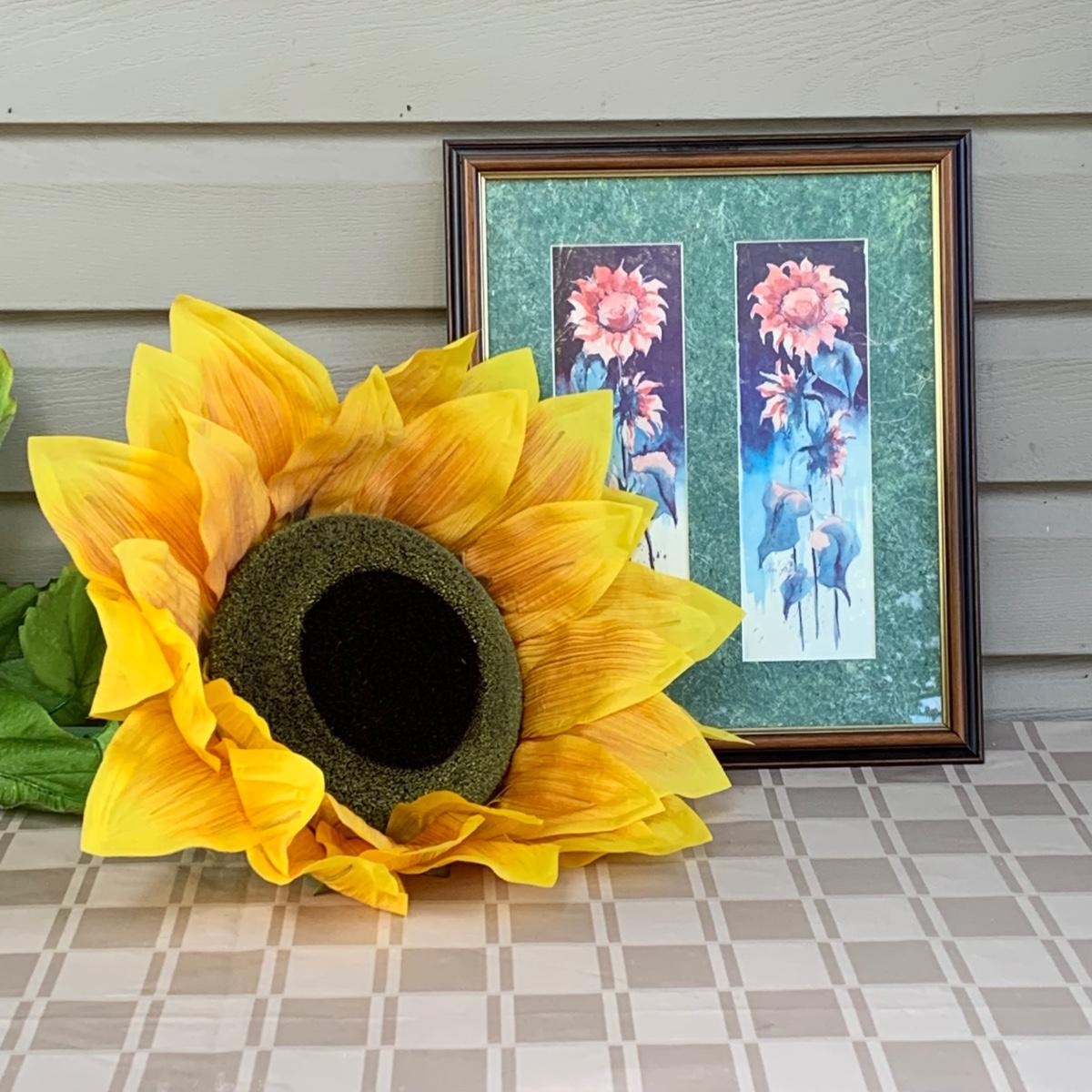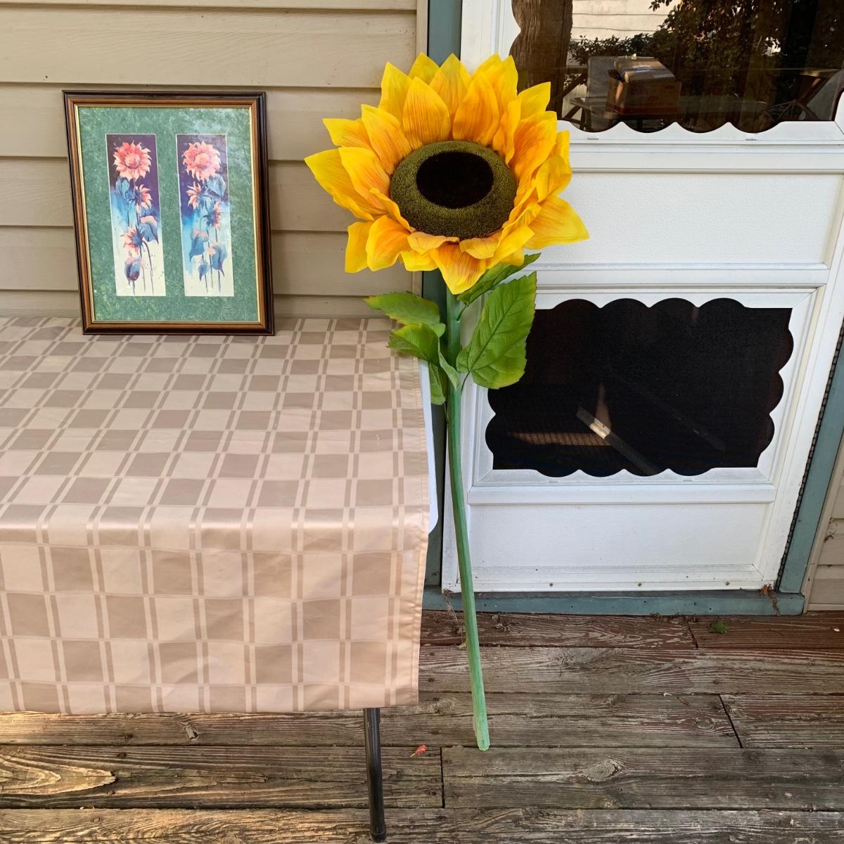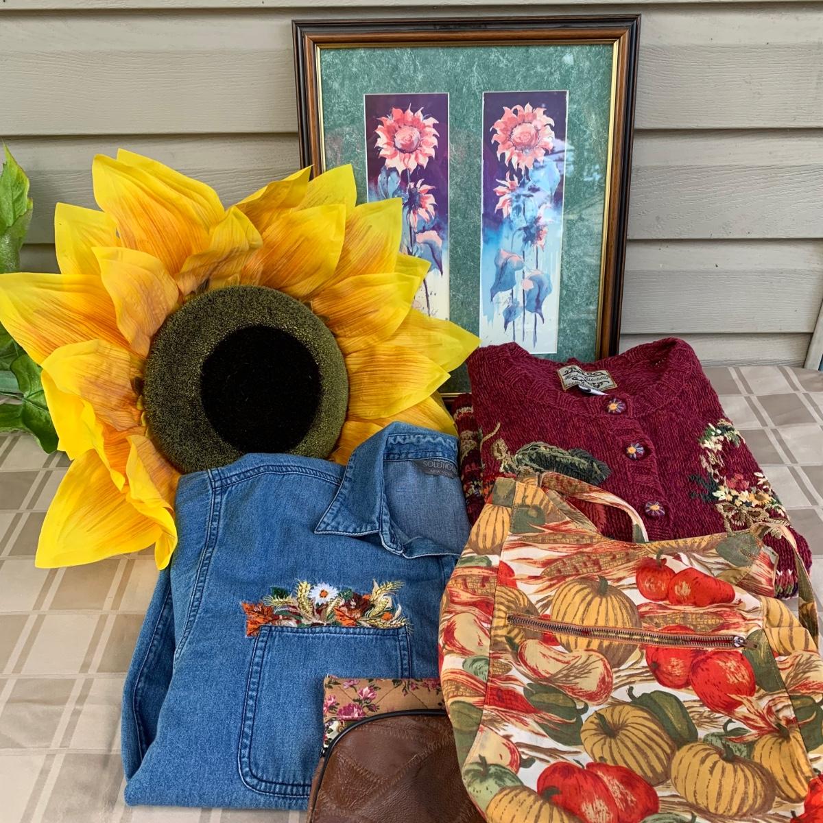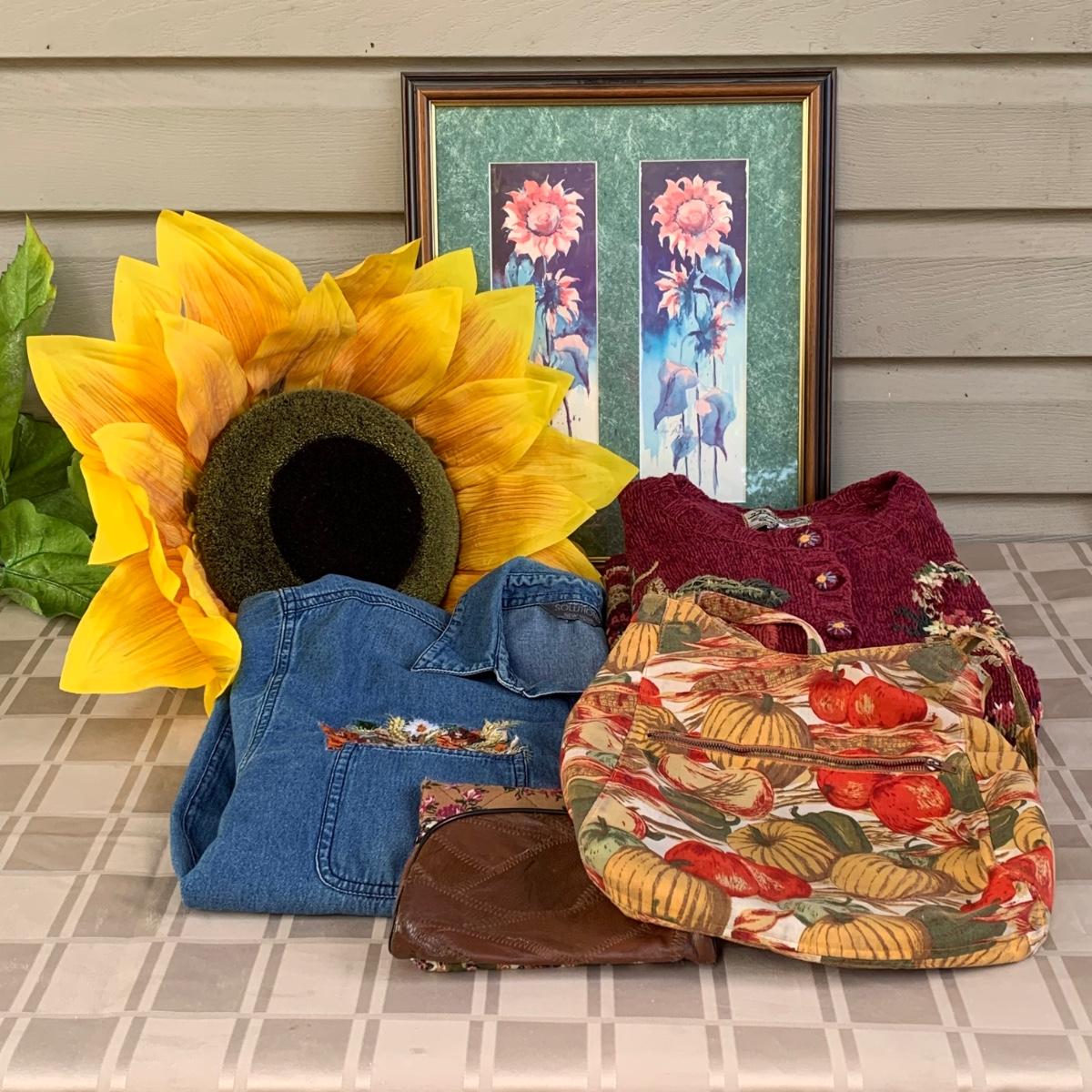 LOT 105R: Fall Collection: Heirloom Collectible Fall Sweater, Embroider Denim Shirt, Handbag, Signed Sunflower Print and a GIANT Faux Sunflower