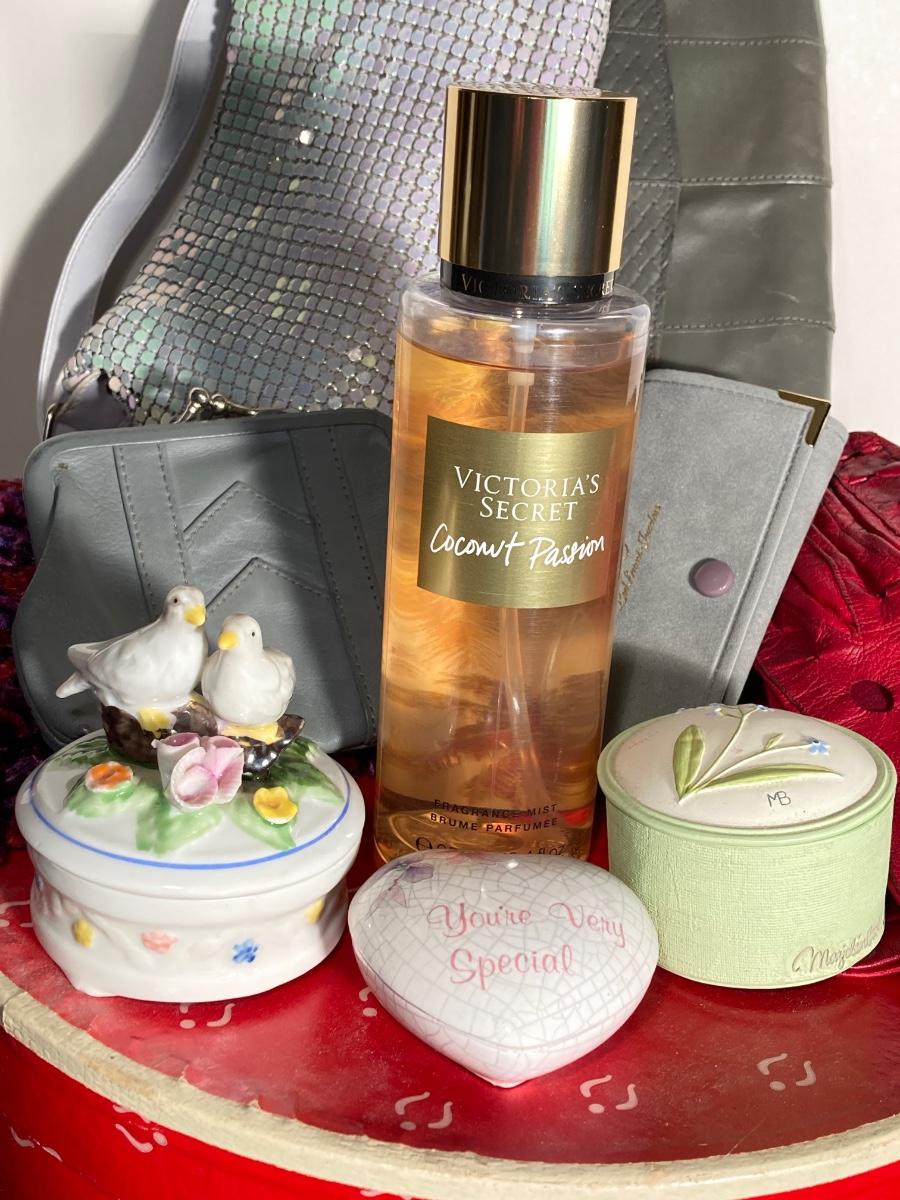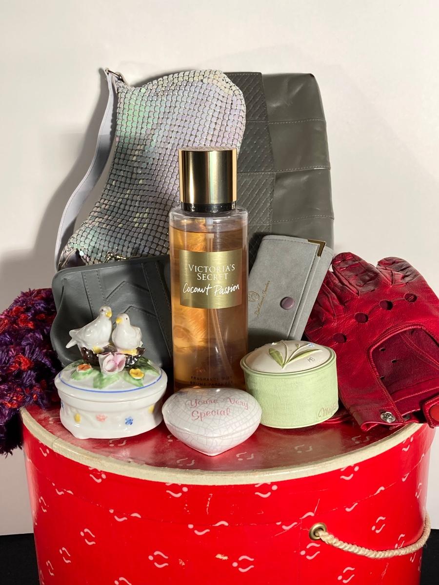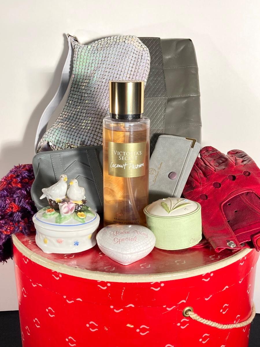LOT 117J  Hat Box, Purses, Victoria Secret Perfume, Grey Leather Wallet, Trinket Boxes and More