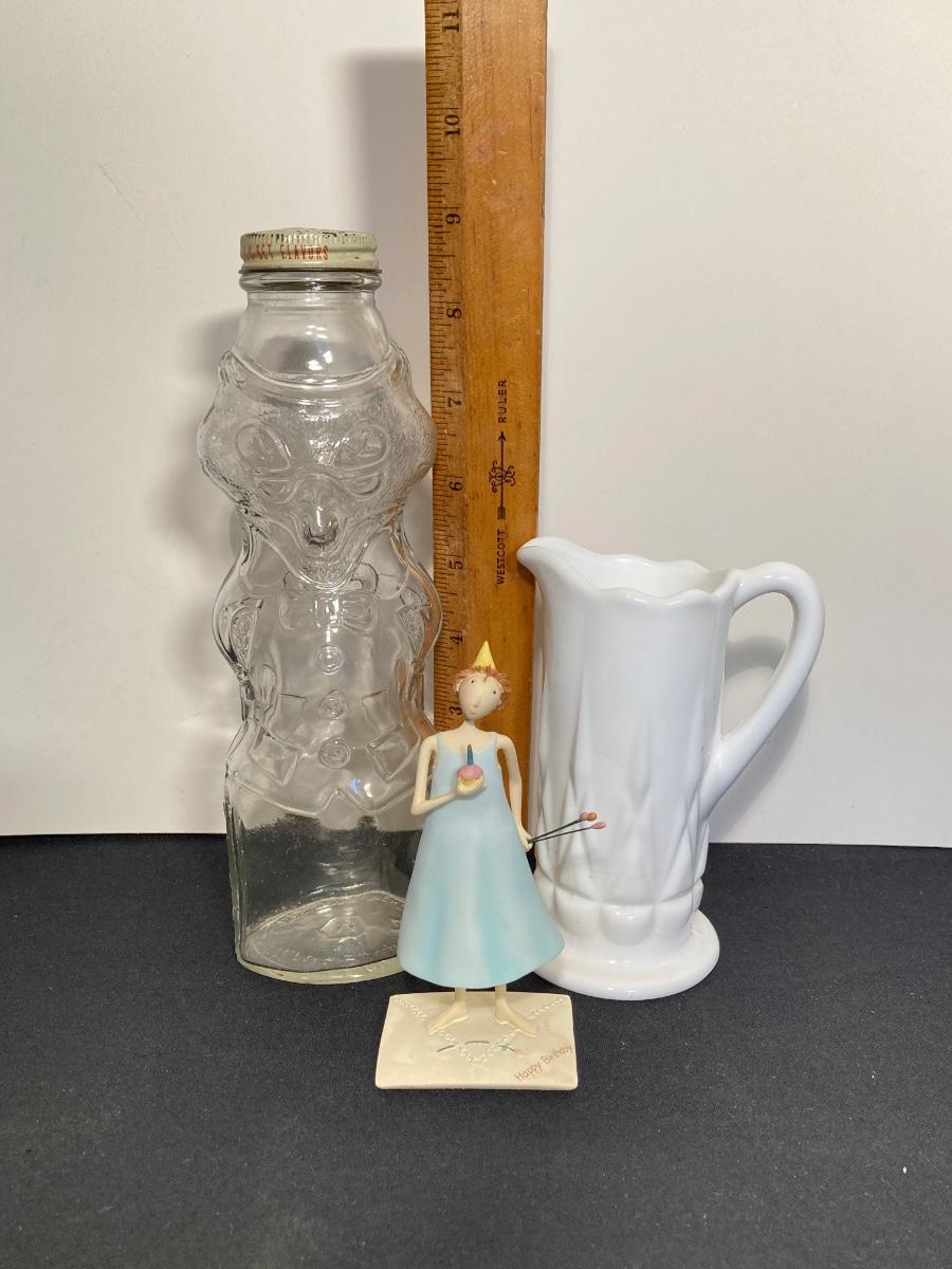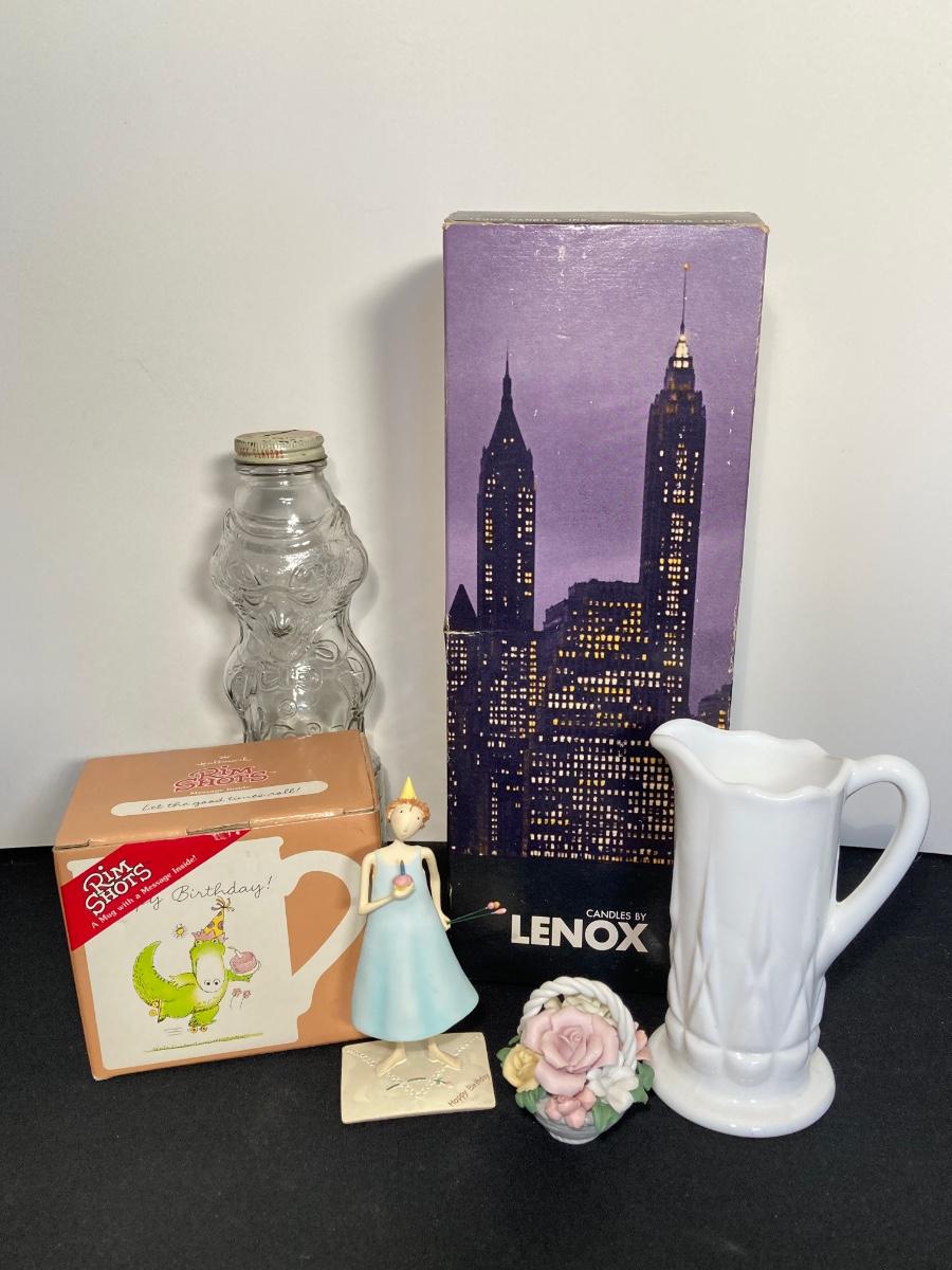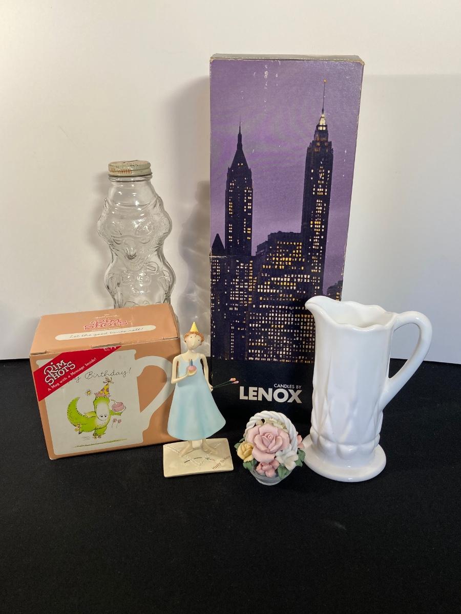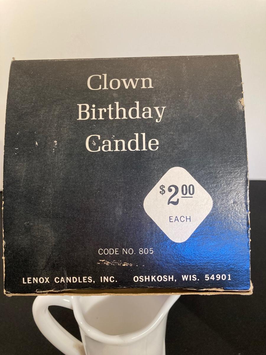LOT 124J: Happy Birthday Collection - Lenox Clown Candle, Claire Stoner "Most Sincerely" Figure for Demdaco, Vintage Glass Clown Bank, Milk Glass Pitcher & More