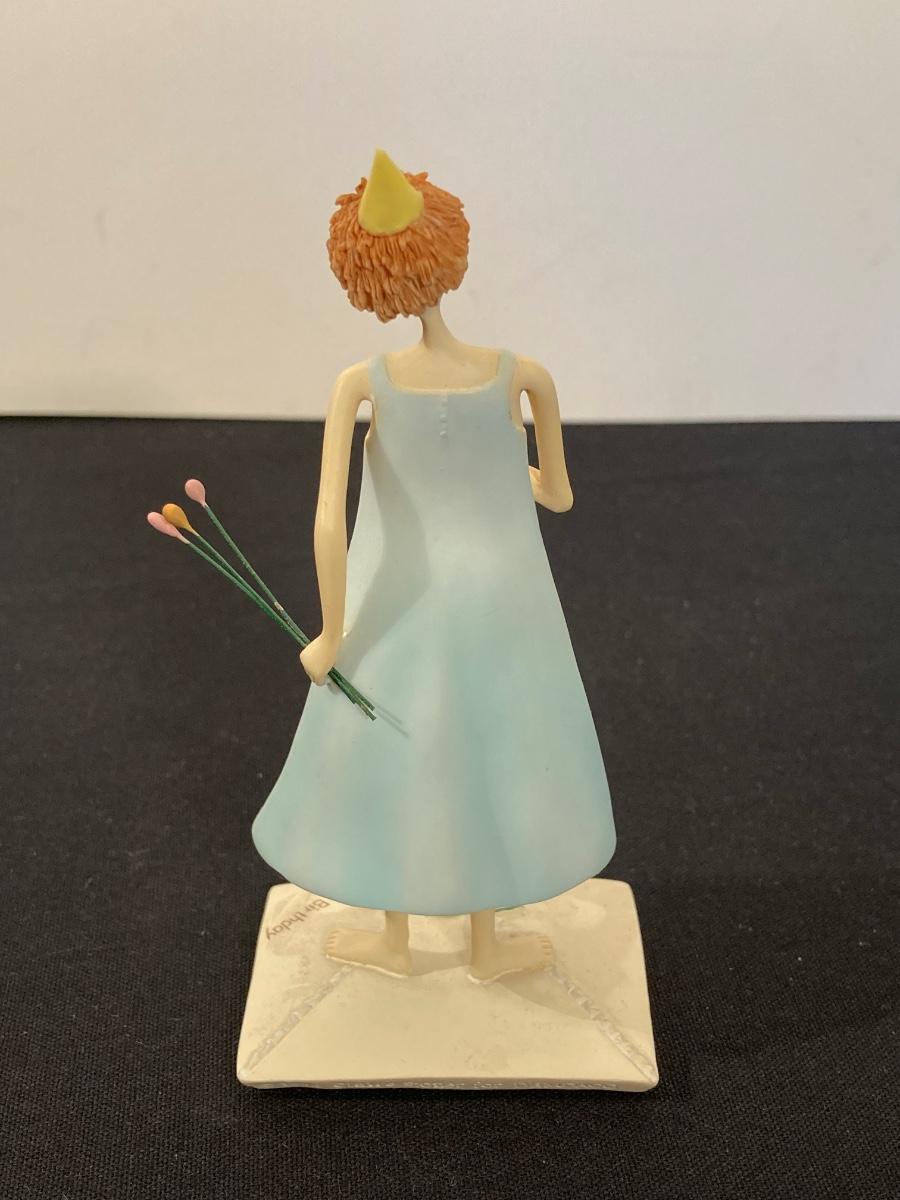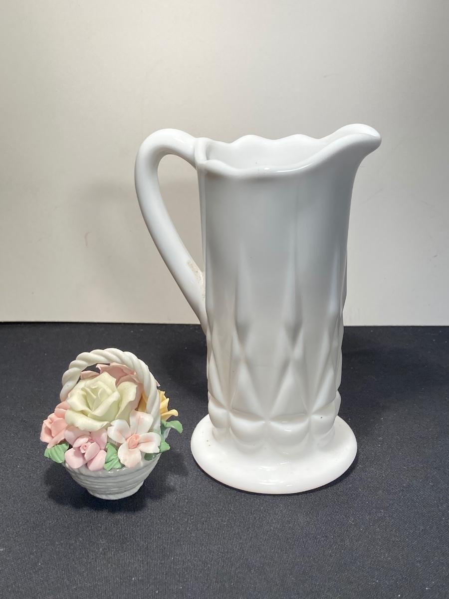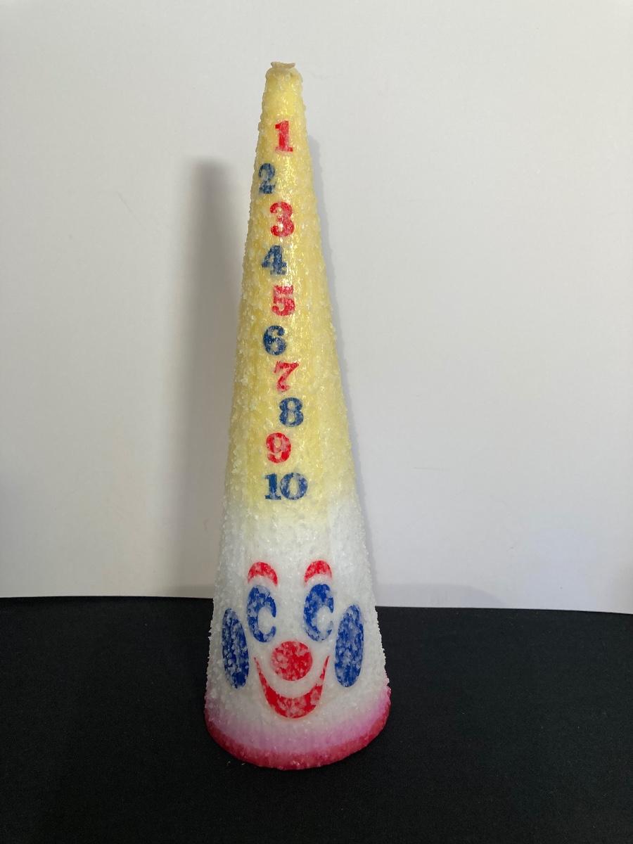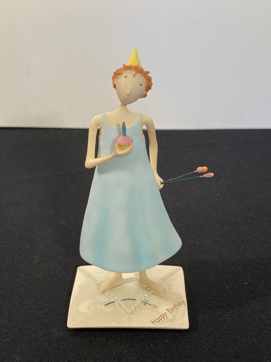 LOT 124J: Happy Birthday Collection - Lenox Clown Candle, Claire Stoner "Most Sincerely" Figure for Demdaco, Vintage Glass Clown Bank, Milk Glass Pitcher & More