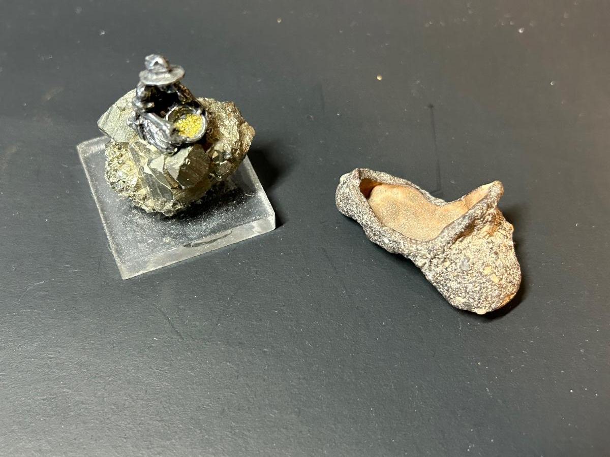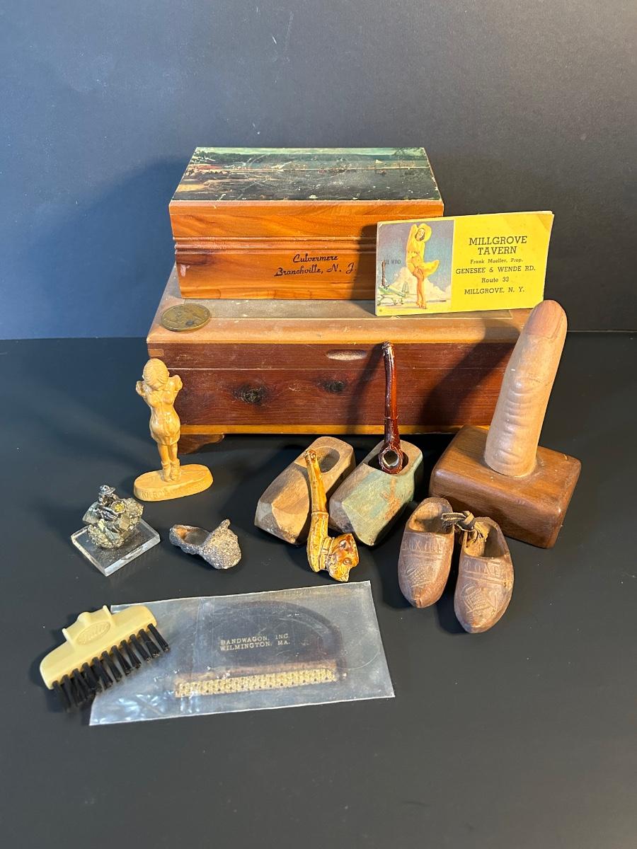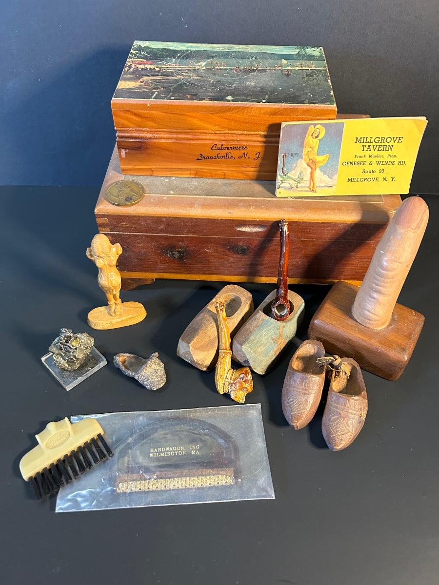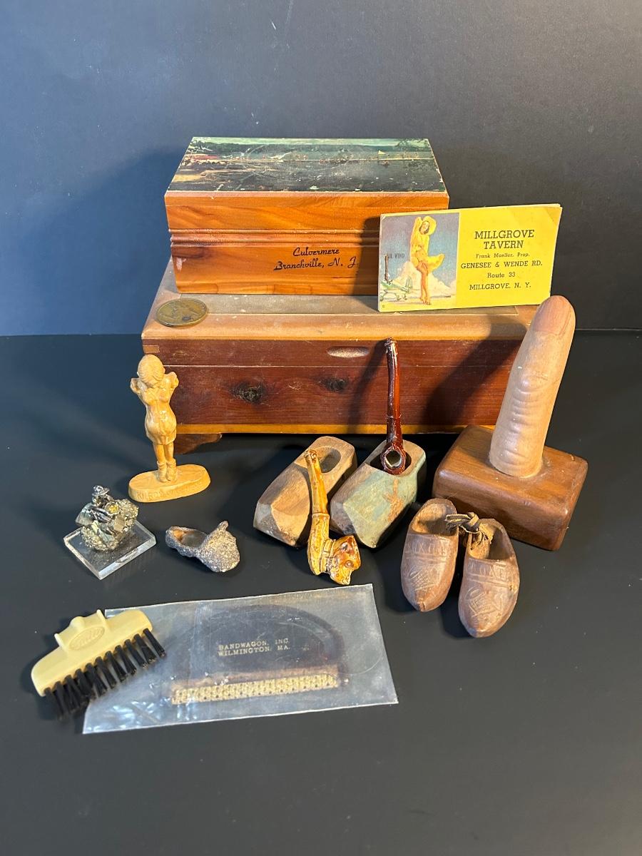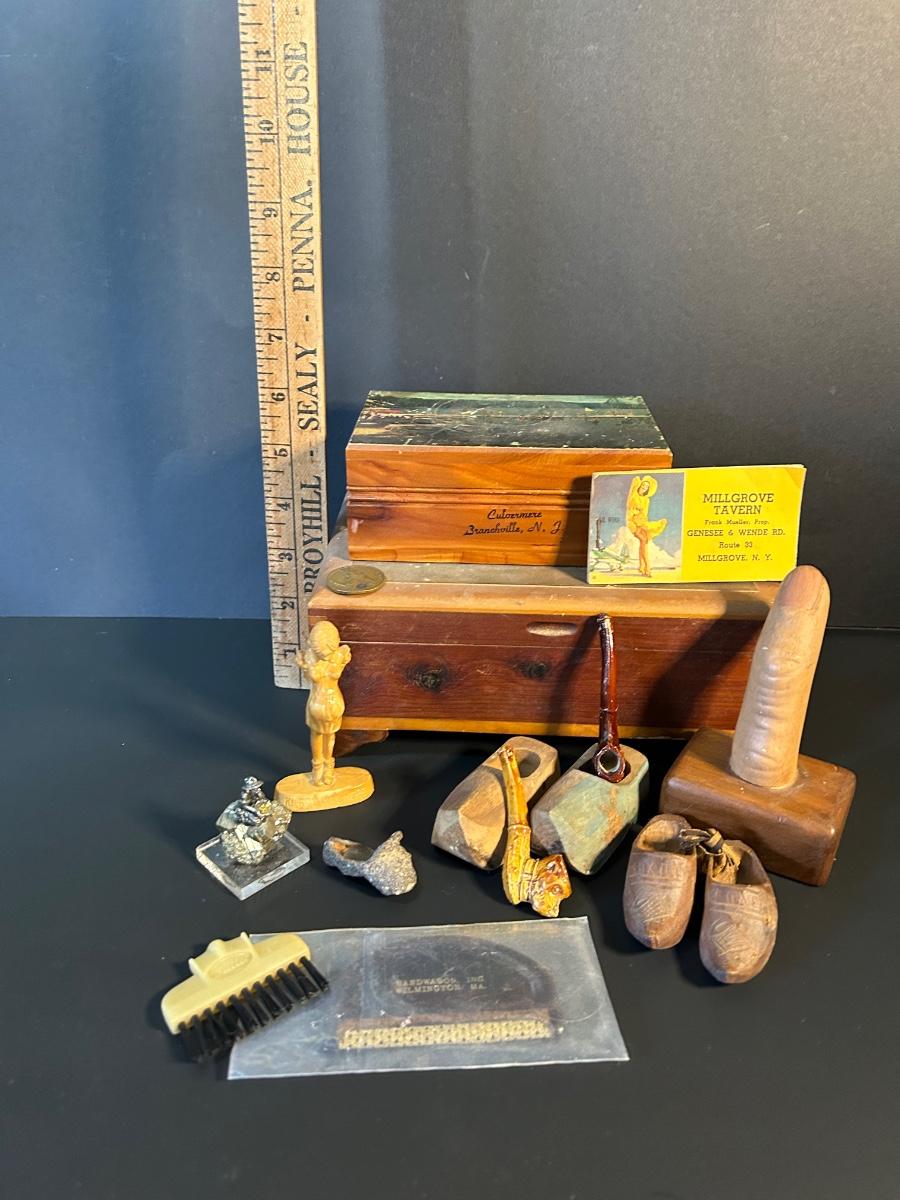 Odd finds from two treasure boxes and two wooden souvenir boxes.