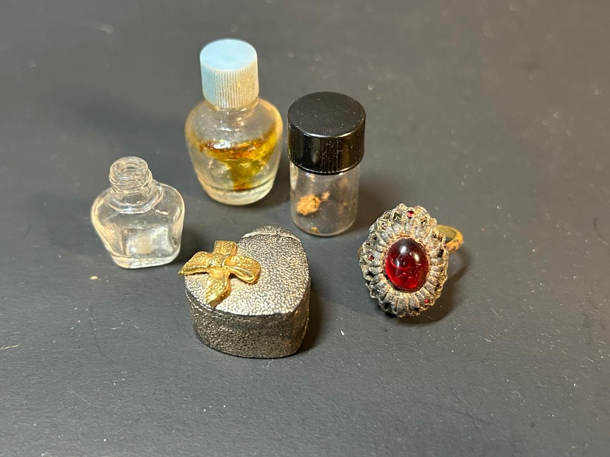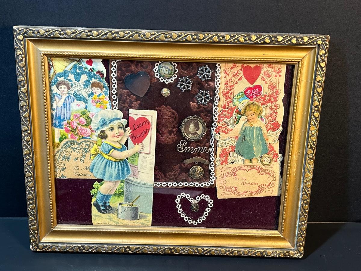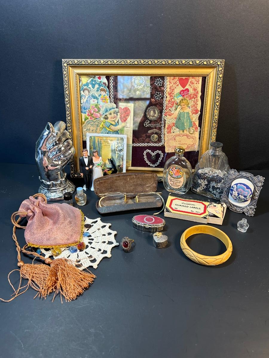 LOT 145C: Antiquish This and Thats - Framed Ephemeral, Bottles, Frame, Wire Glasses, Jewlery and More