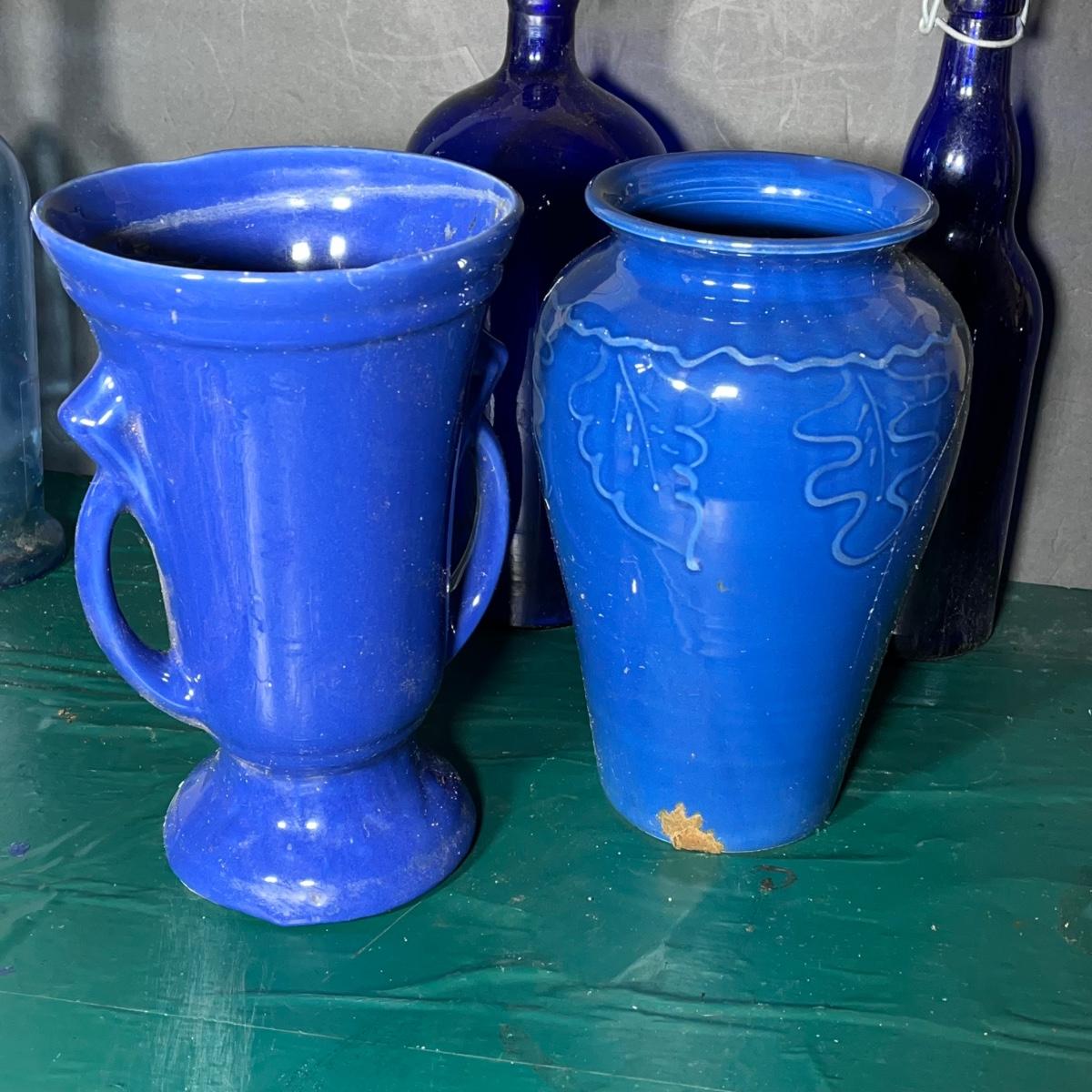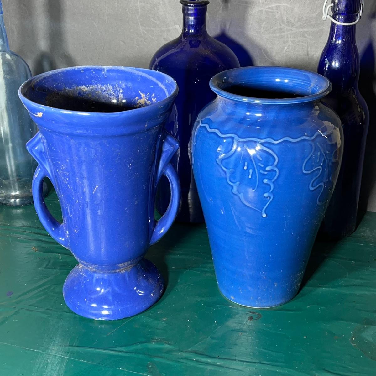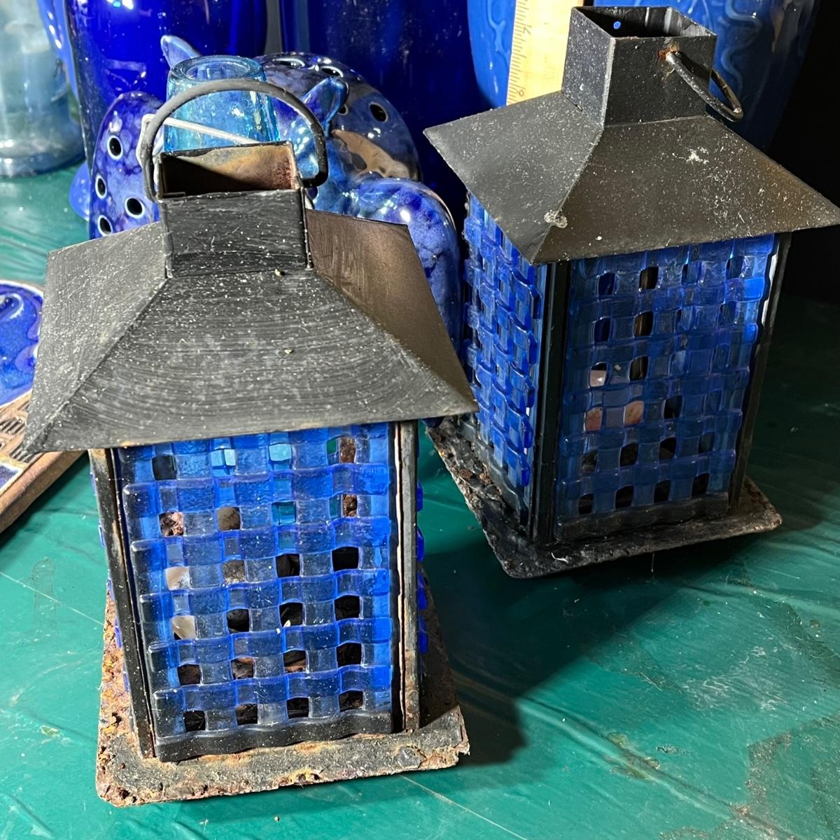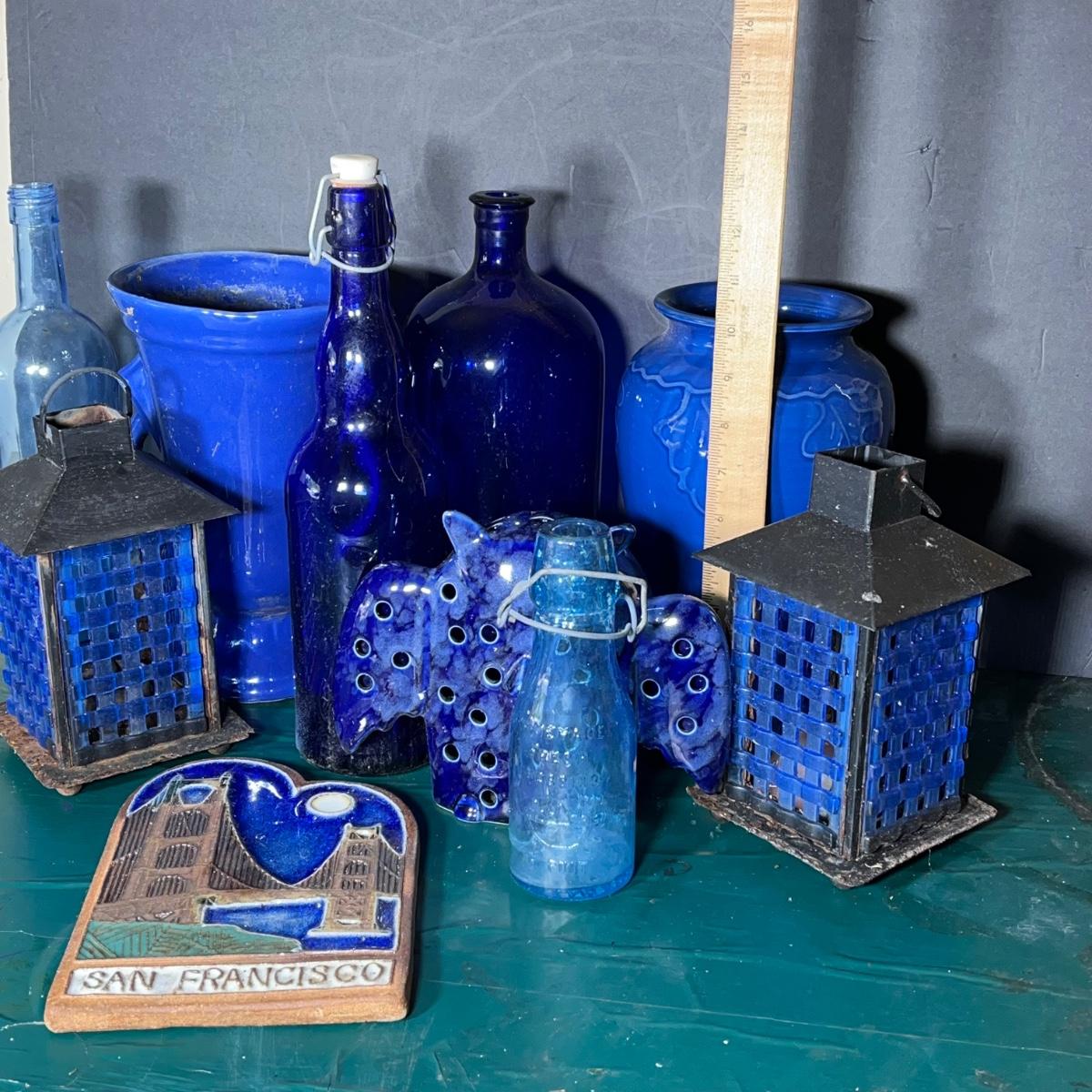LOT 1G: Blue Glass and Ceramic Home & Garden Decor - Vases, Bottles, Lanterns