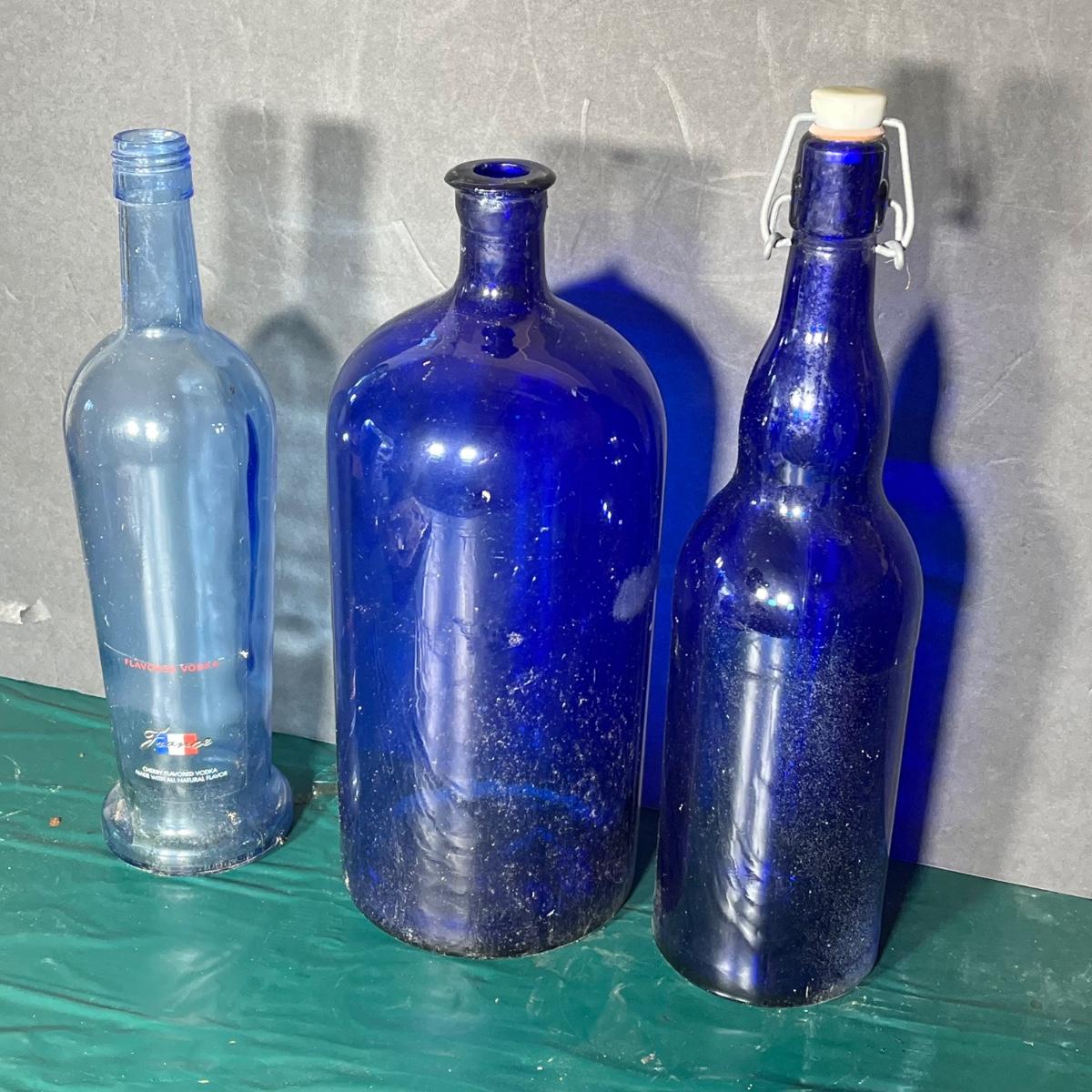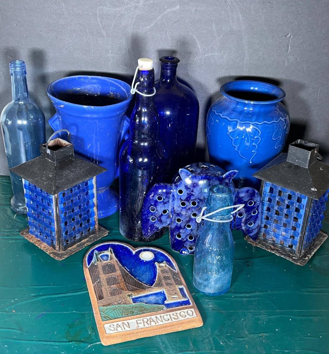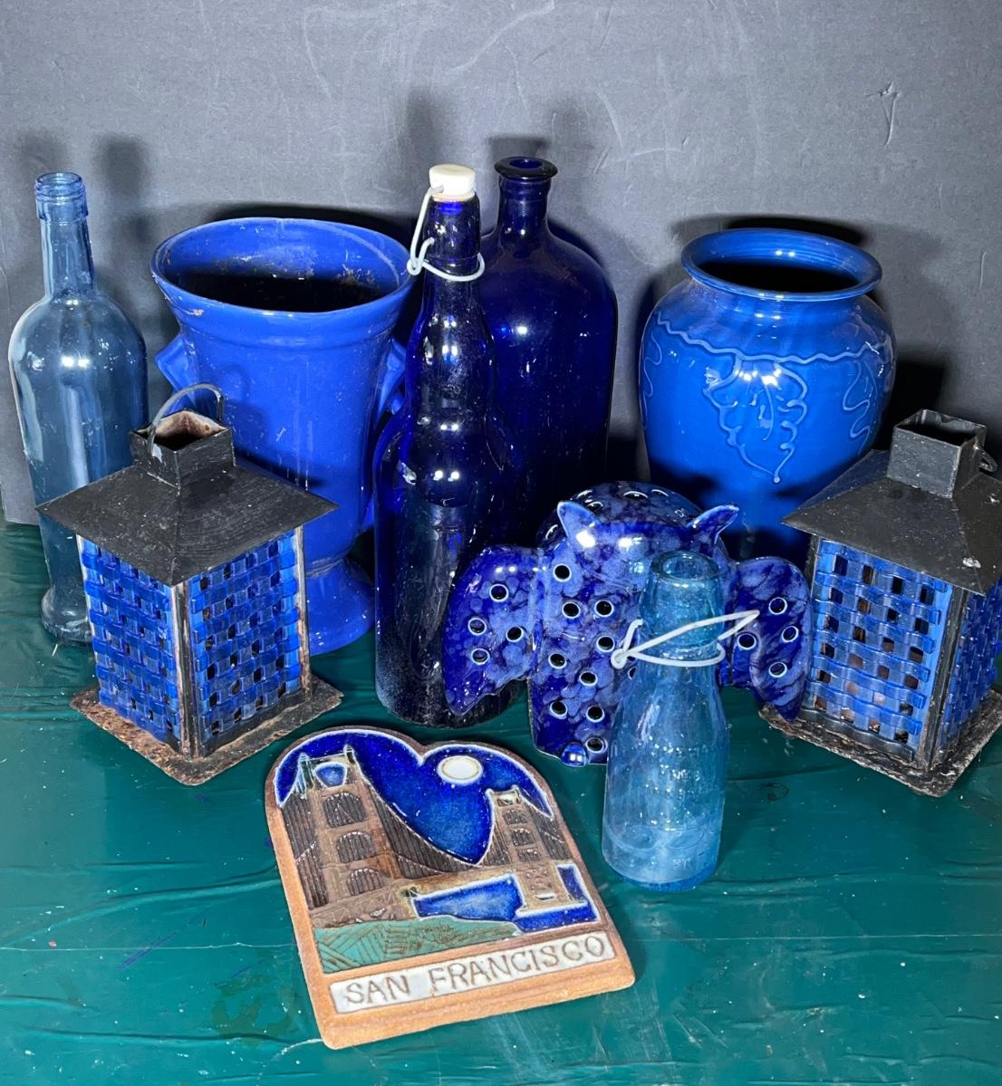 LOT 1G: Blue Glass and Ceramic Home & Garden Decor - Vases, Bottles, Lanterns