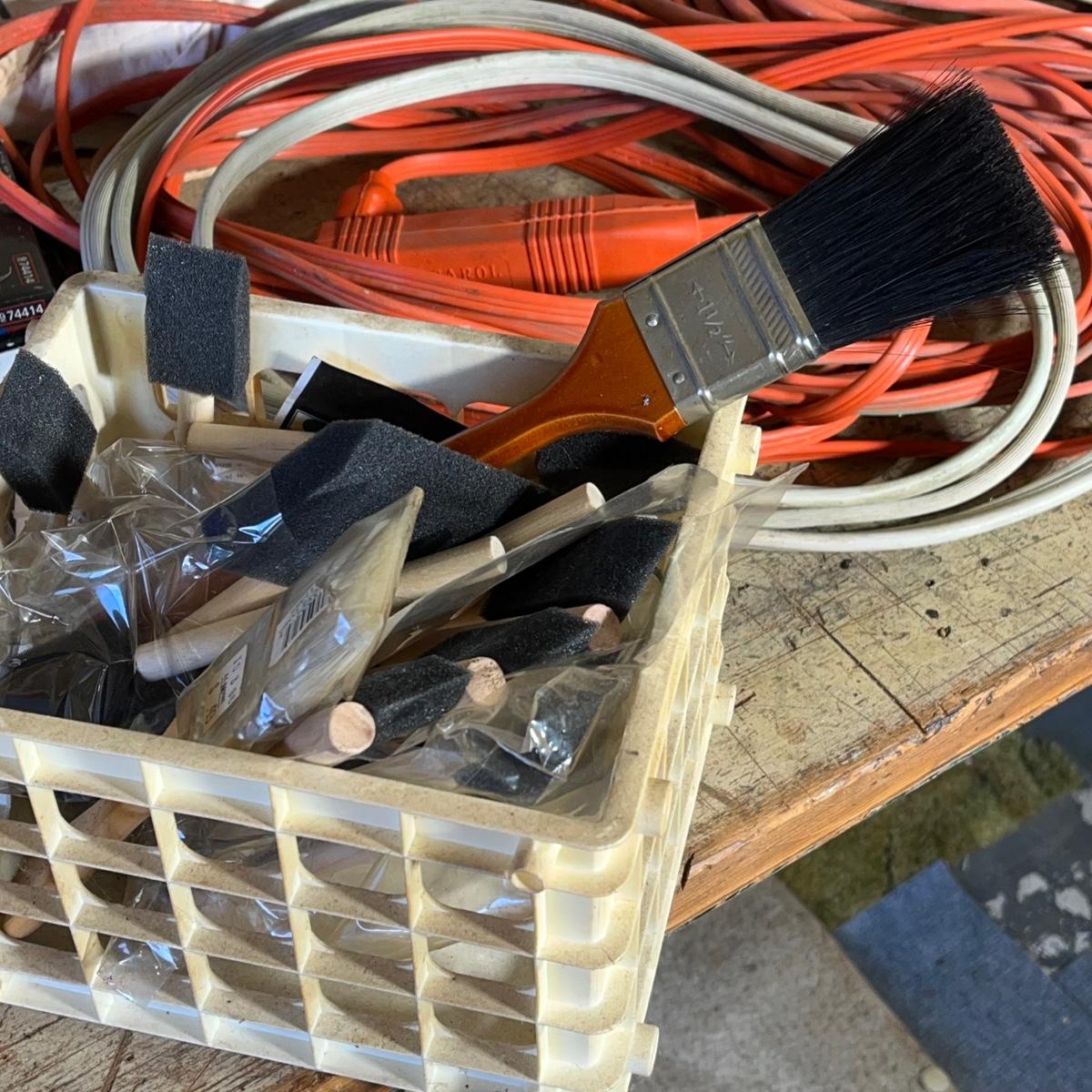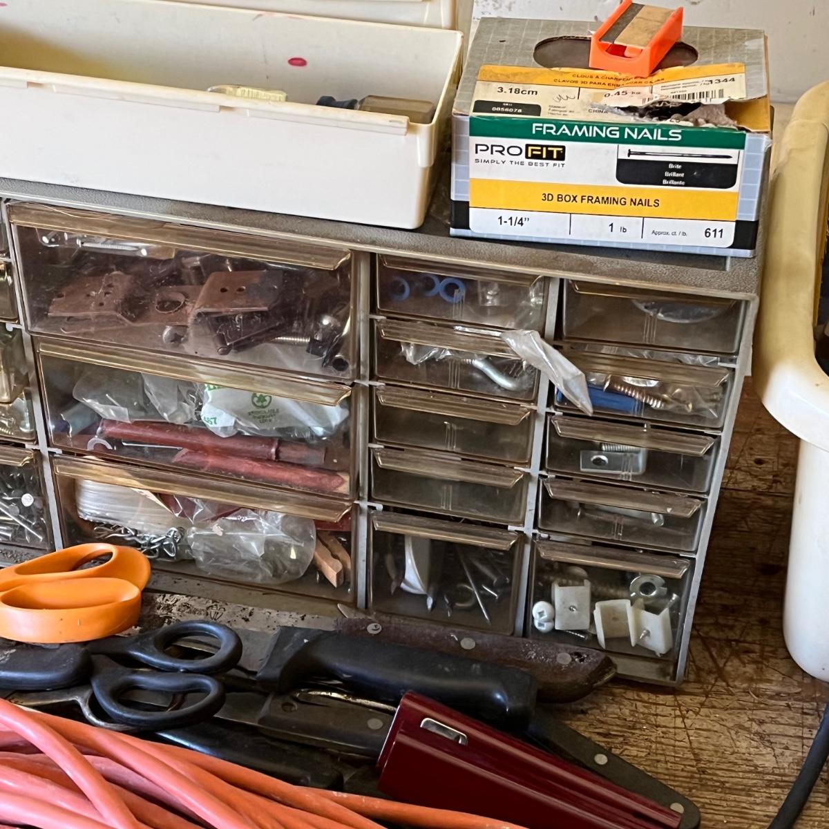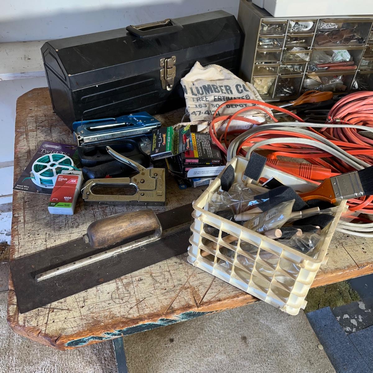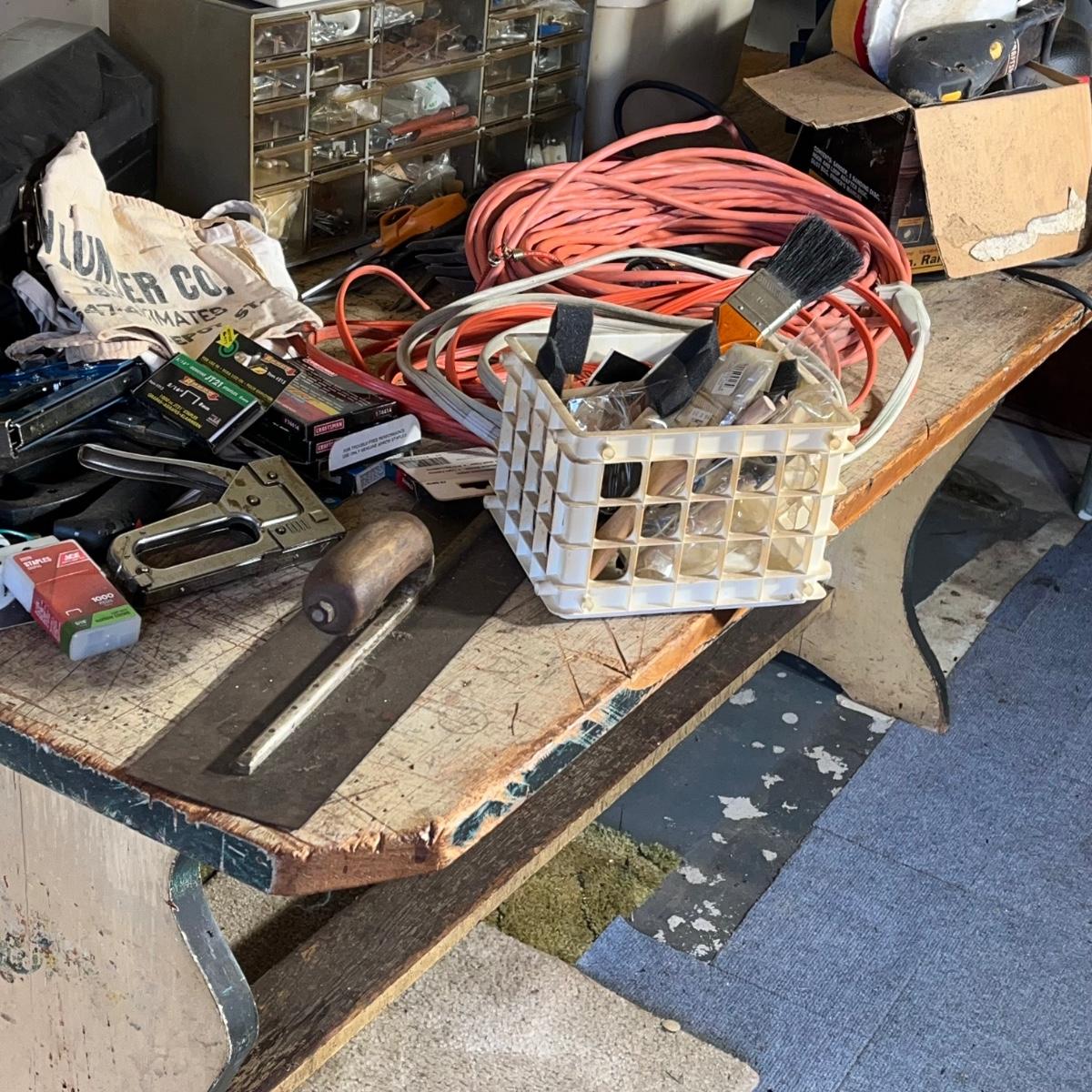 Lot includes all tools and supplies pictured along with table being used as a workbench.