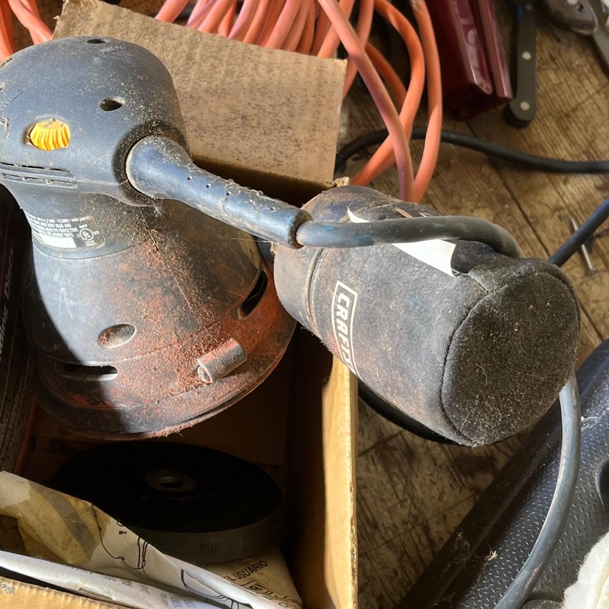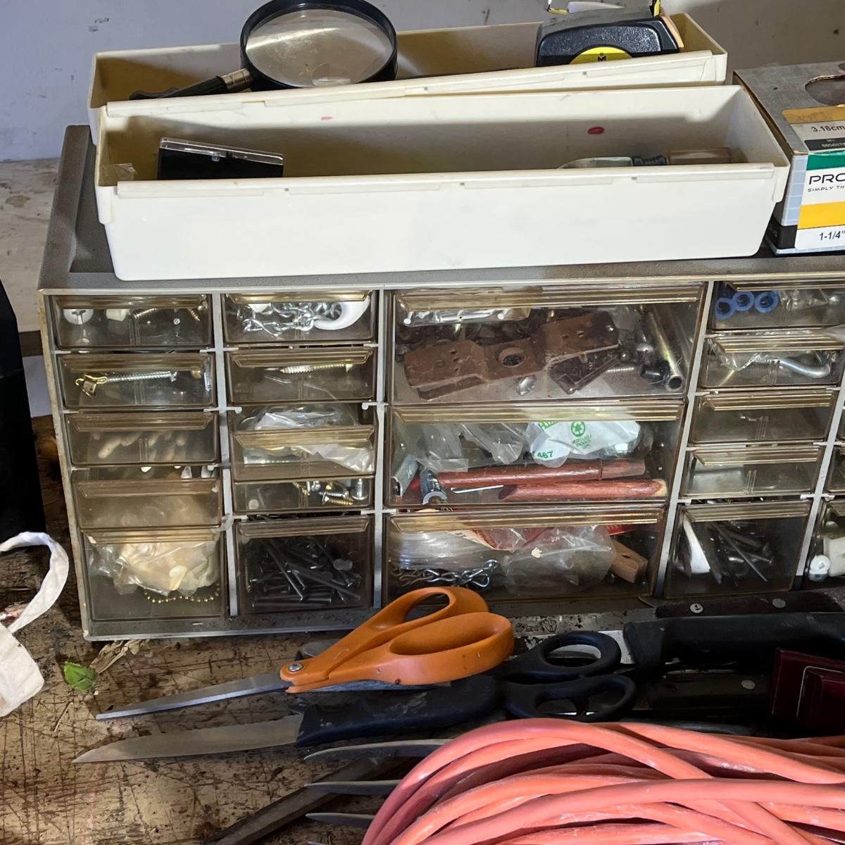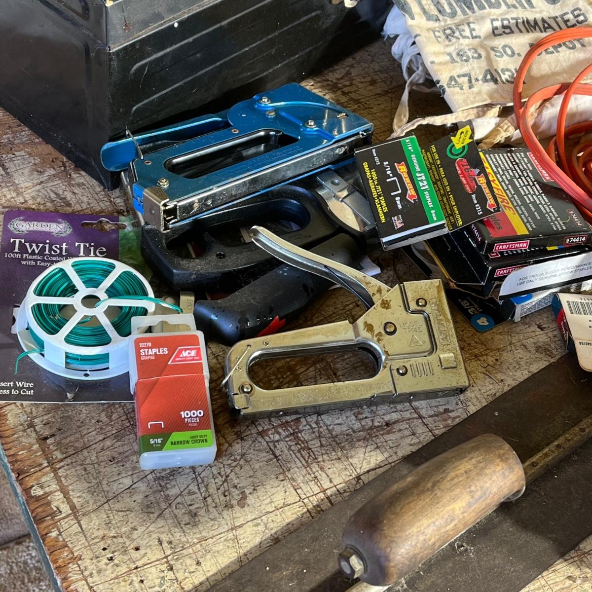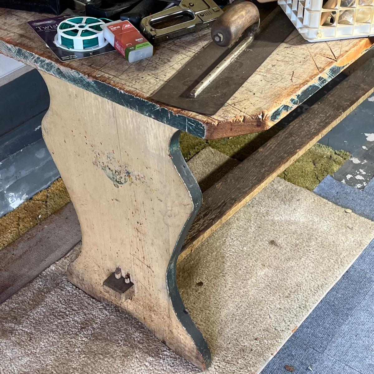 Lot includes all tools and supplies pictured along with table being used as a workbench.