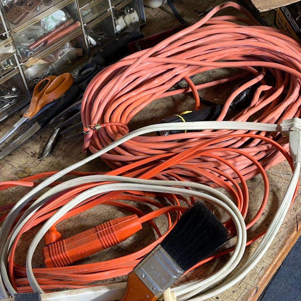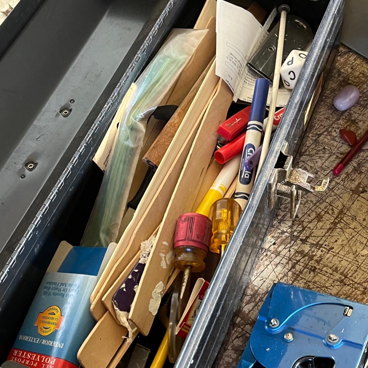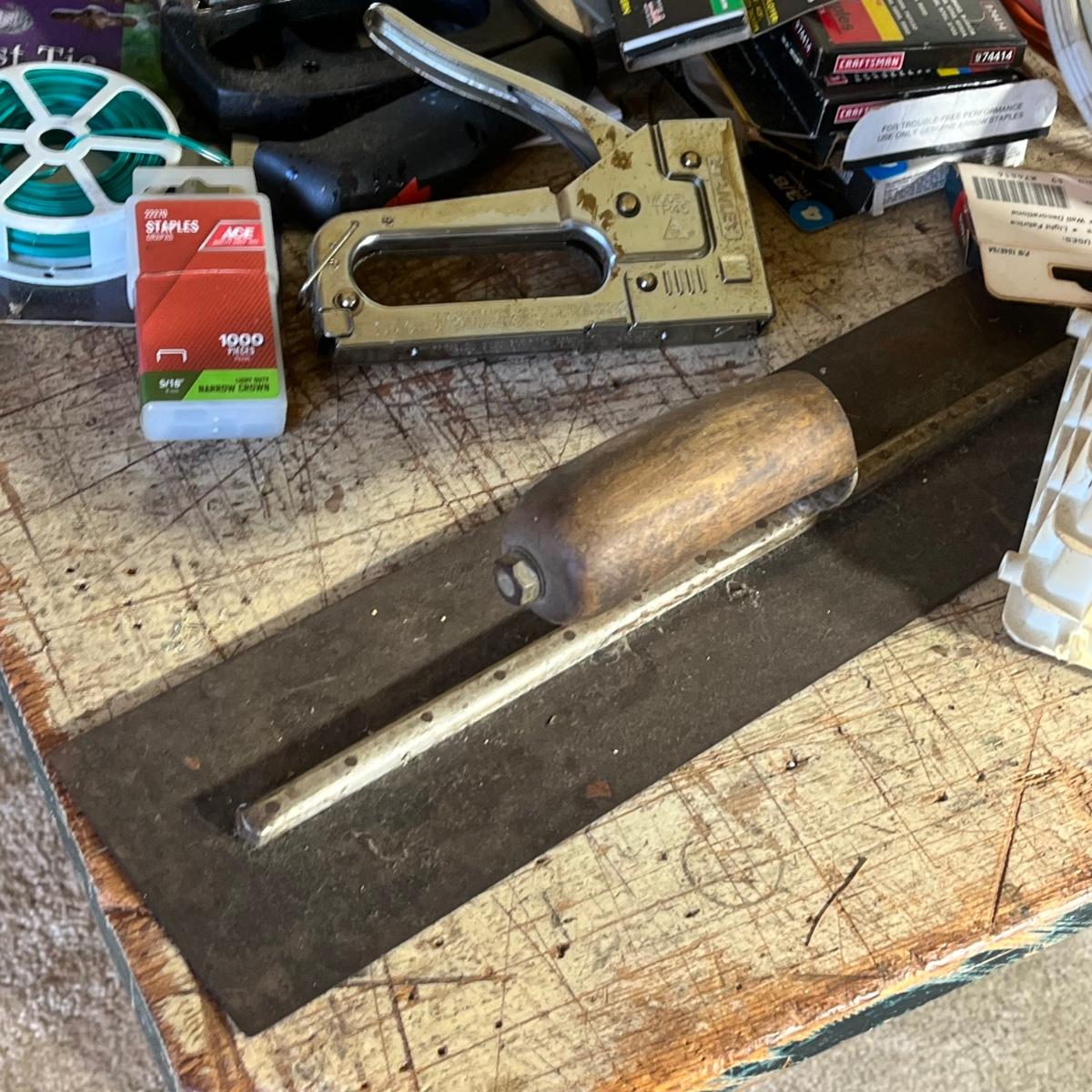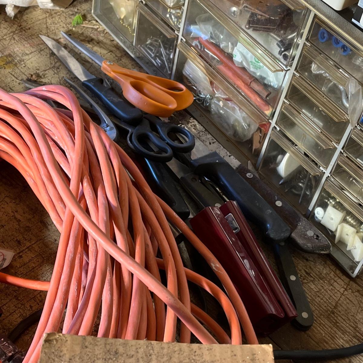 Lot includes all tools and supplies pictured along with table being used as a workbench.