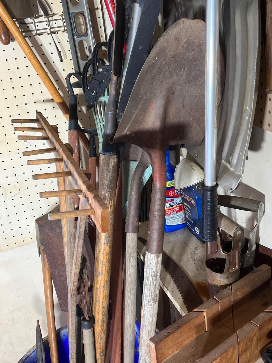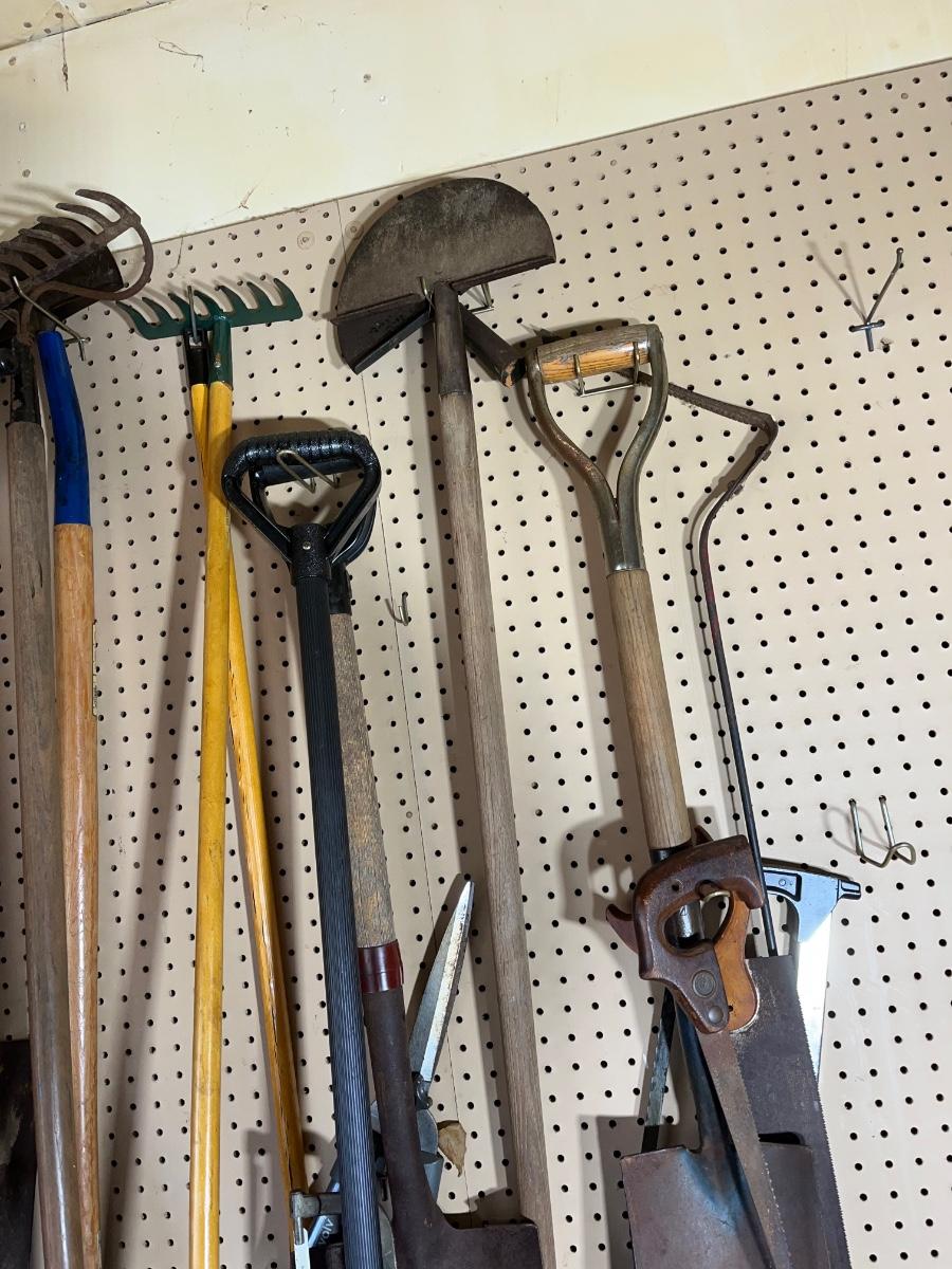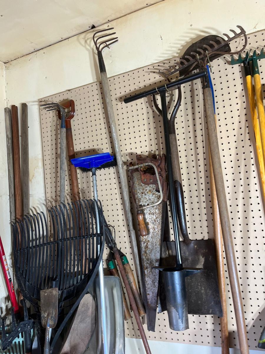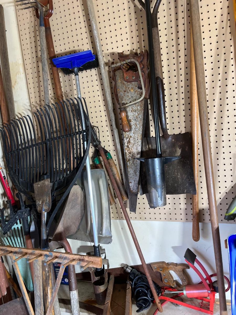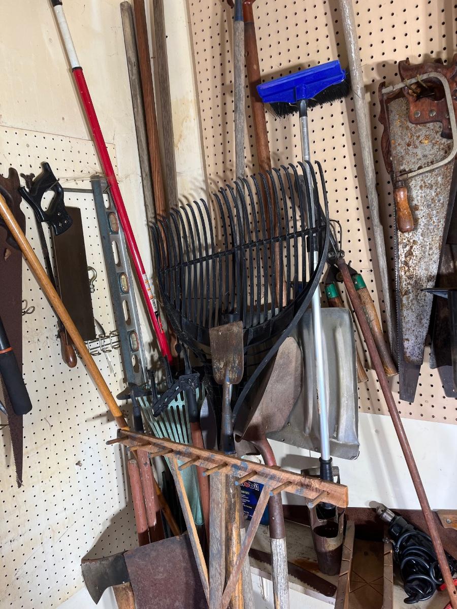 LOT 7G: Garage Finds - Large Assortment of Home and Garden Tools - Rakes, Shovels, Axe, Saws