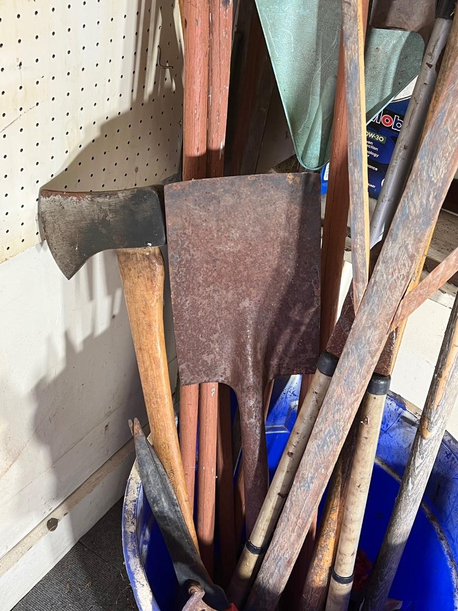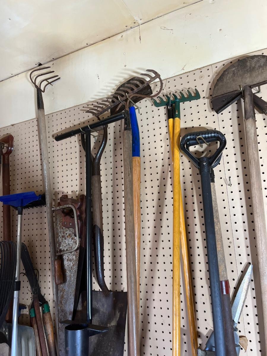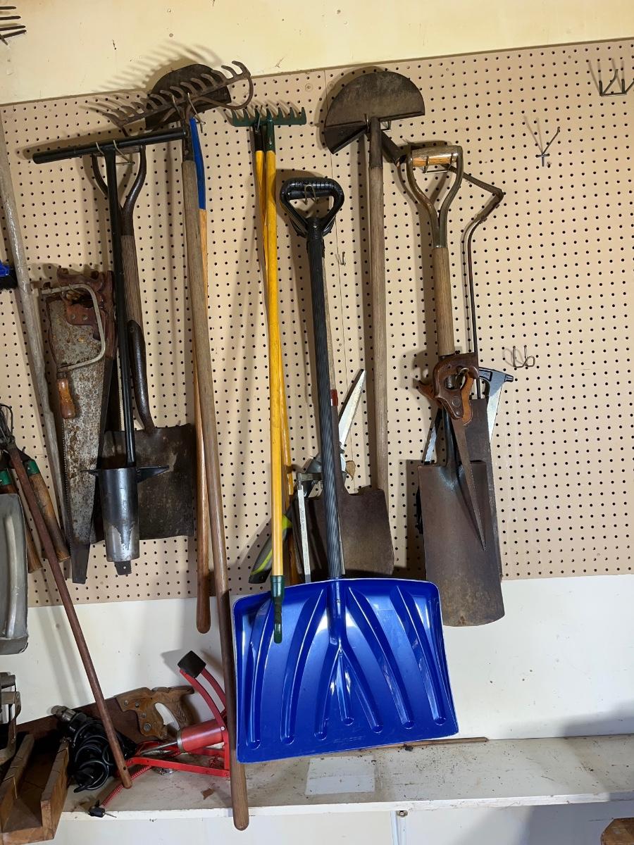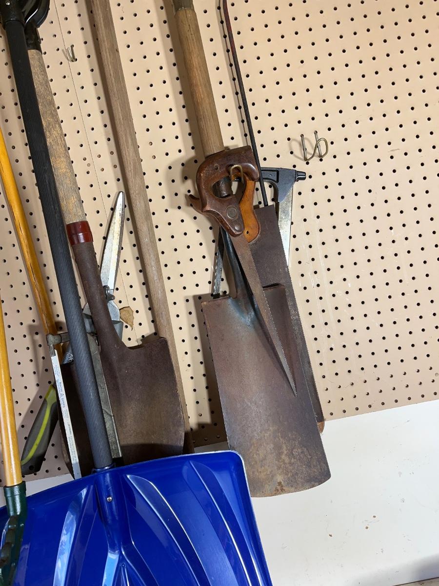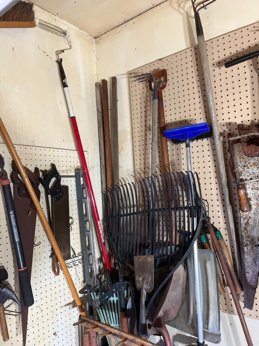 LOT 7G: Garage Finds - Large Assortment of Home and Garden Tools - Rakes, Shovels, Axe, Saws