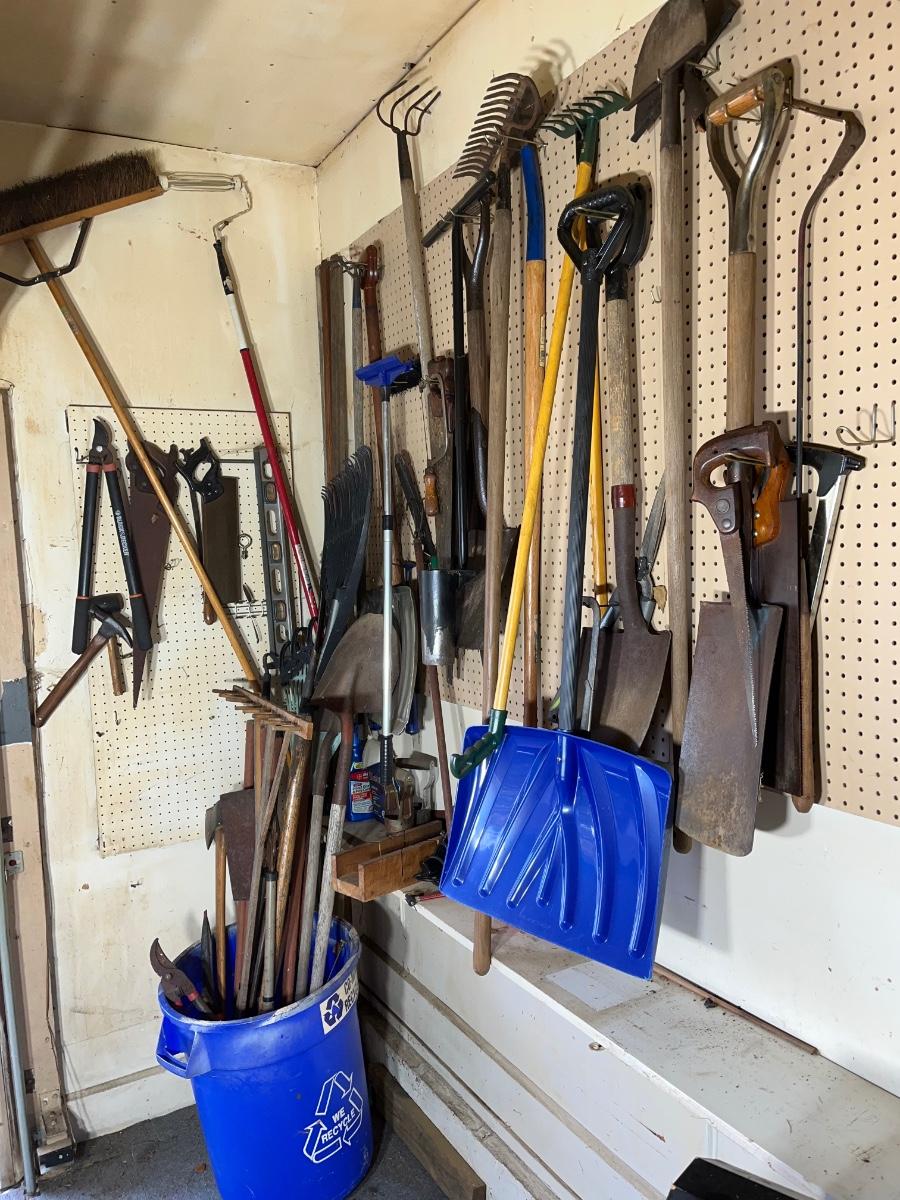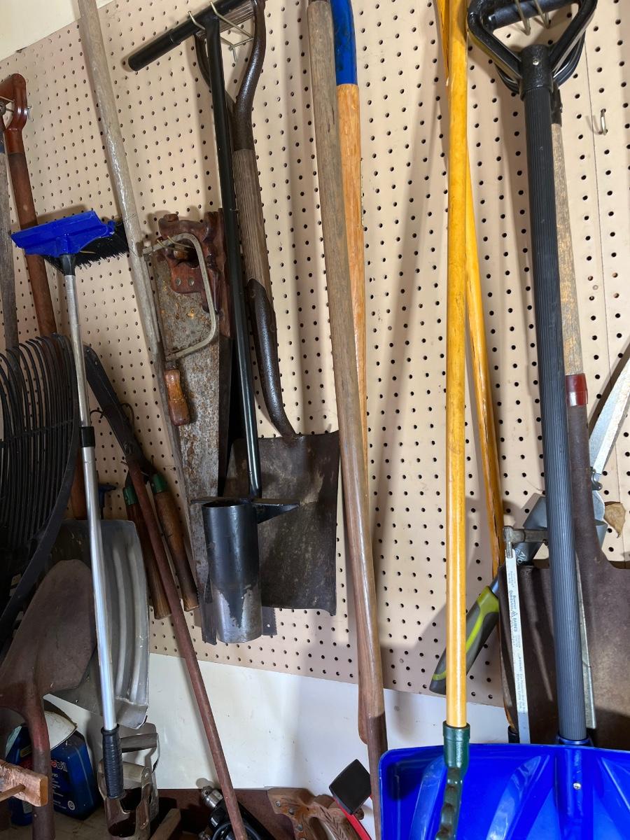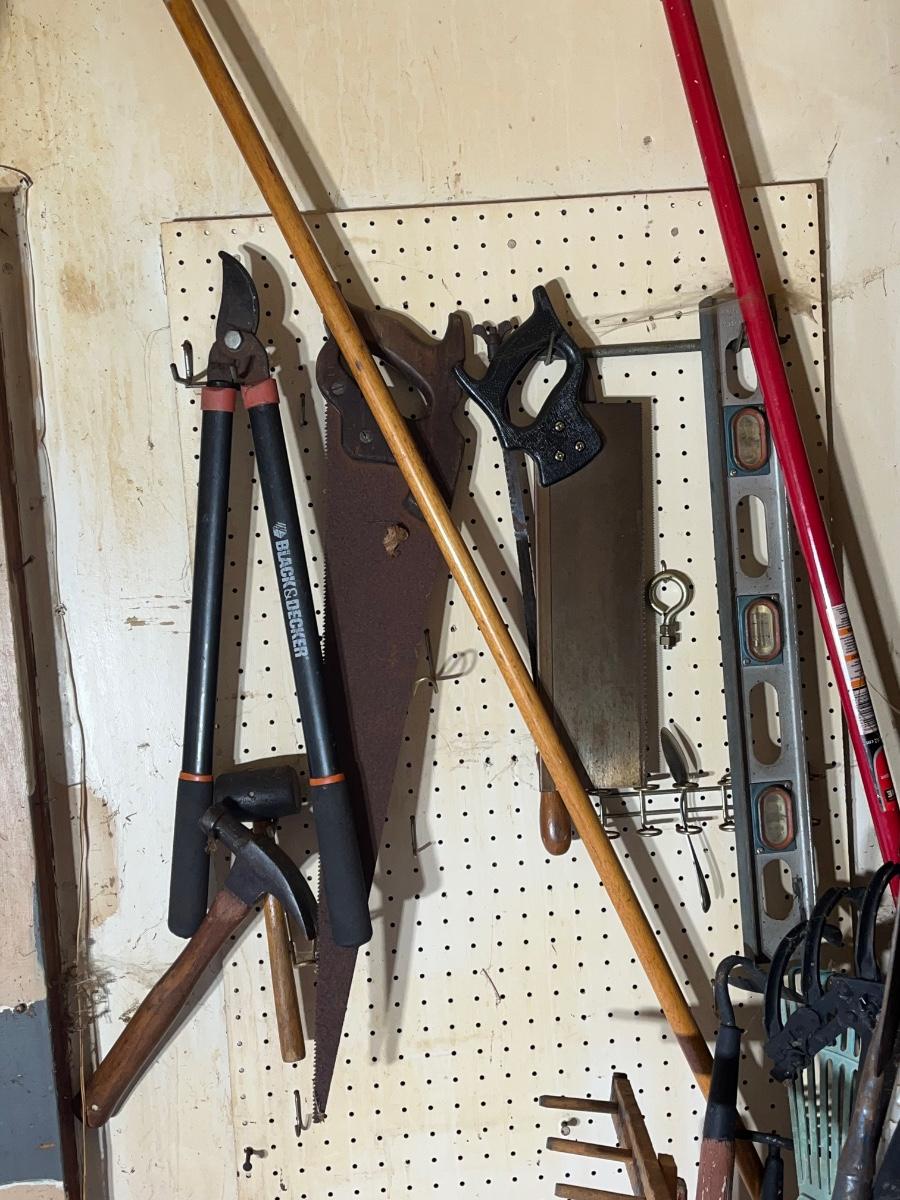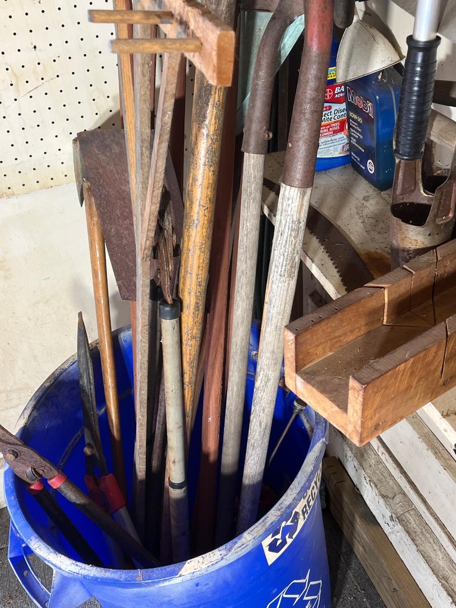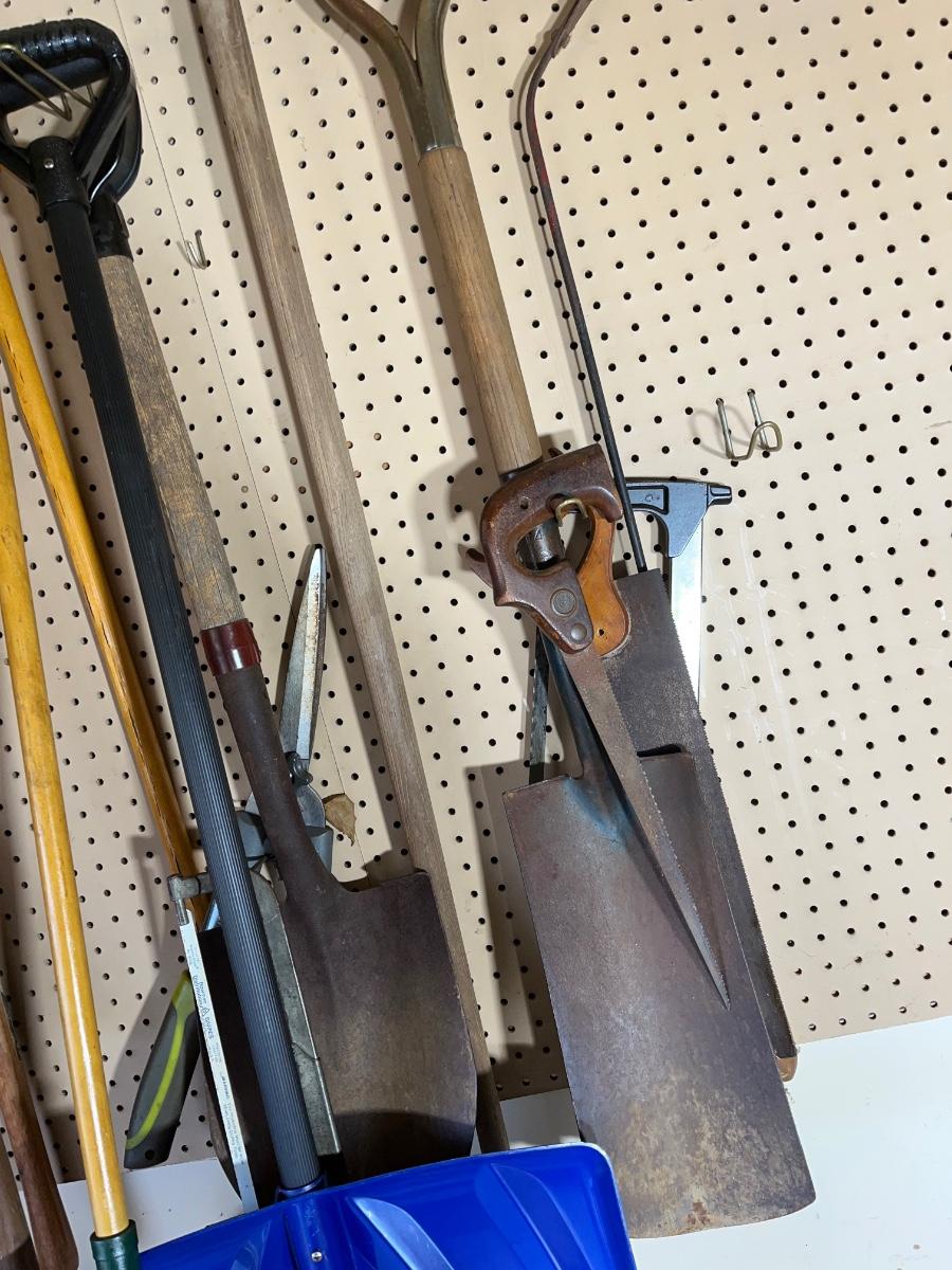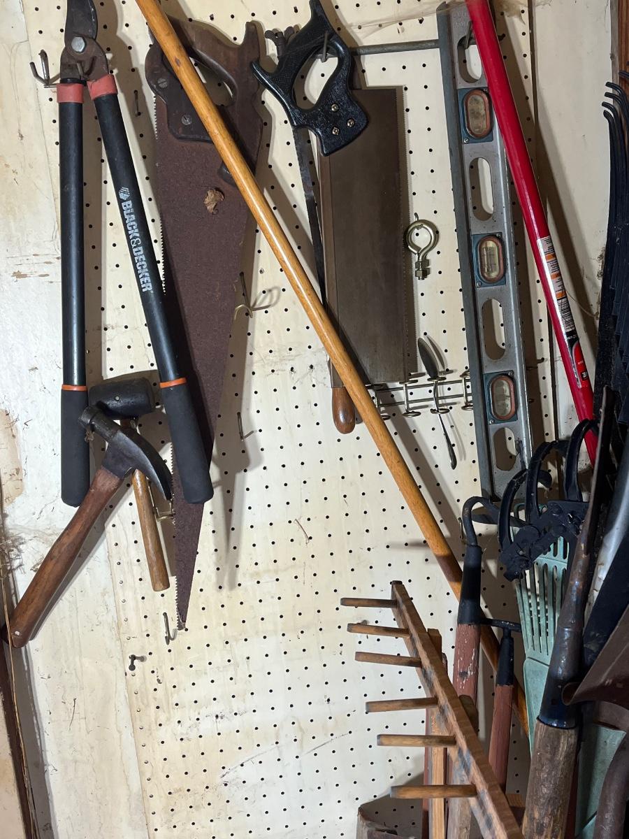 LOT 7G: Garage Finds - Large Assortment of Home and Garden Tools - Rakes, Shovels, Axe, Saws