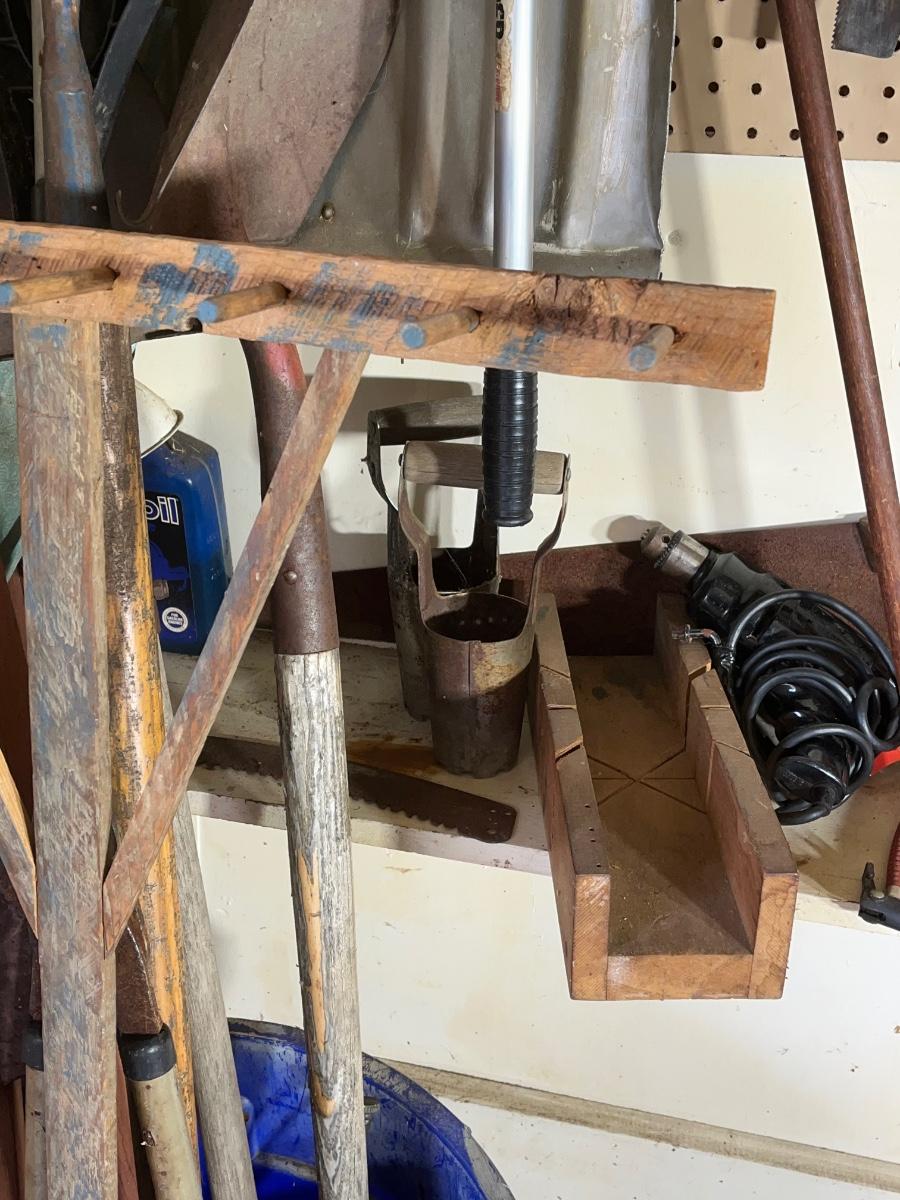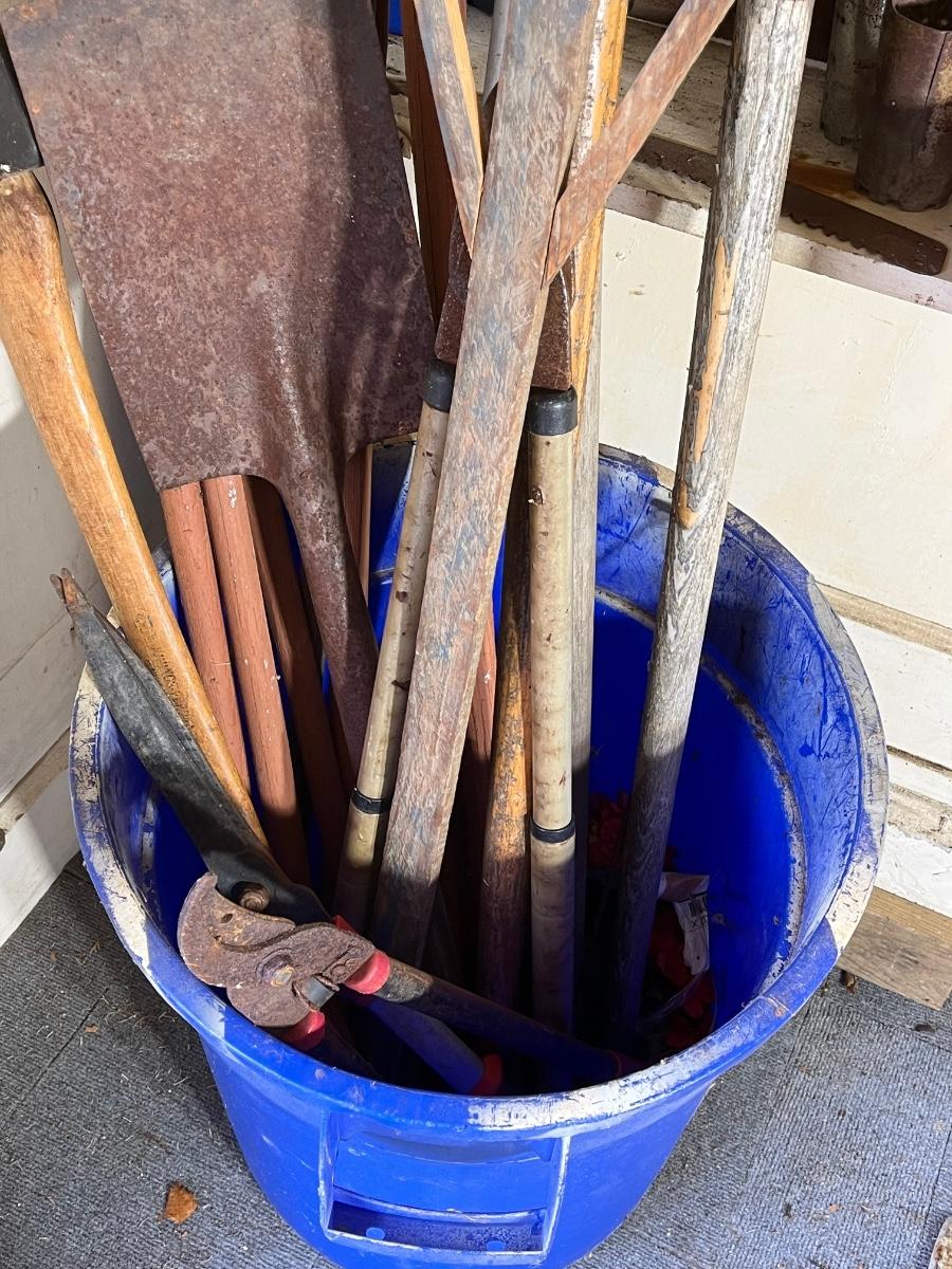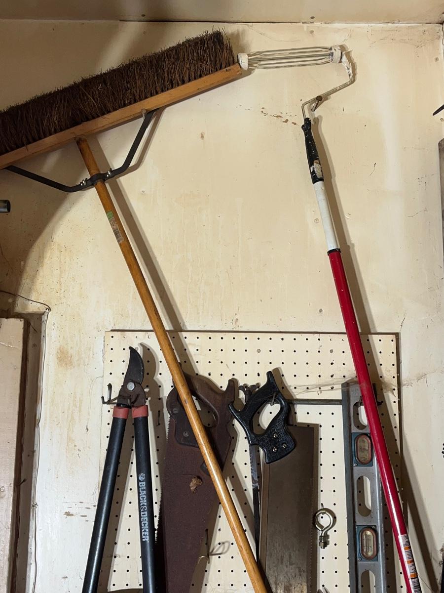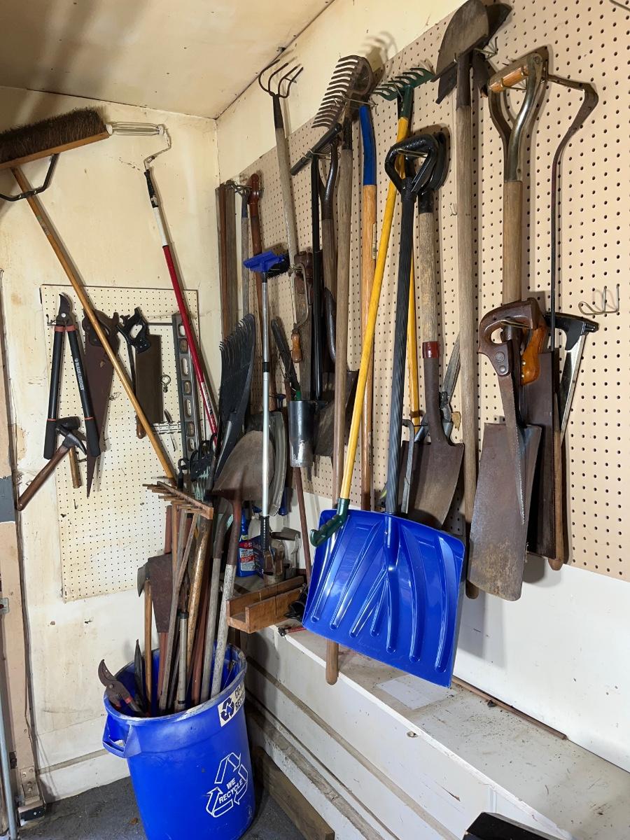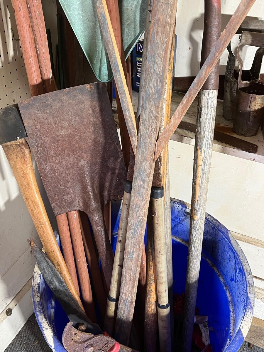 LOT 7G: Garage Finds - Large Assortment of Home and Garden Tools - Rakes, Shovels, Axe, Saws