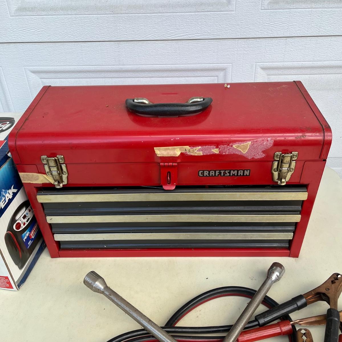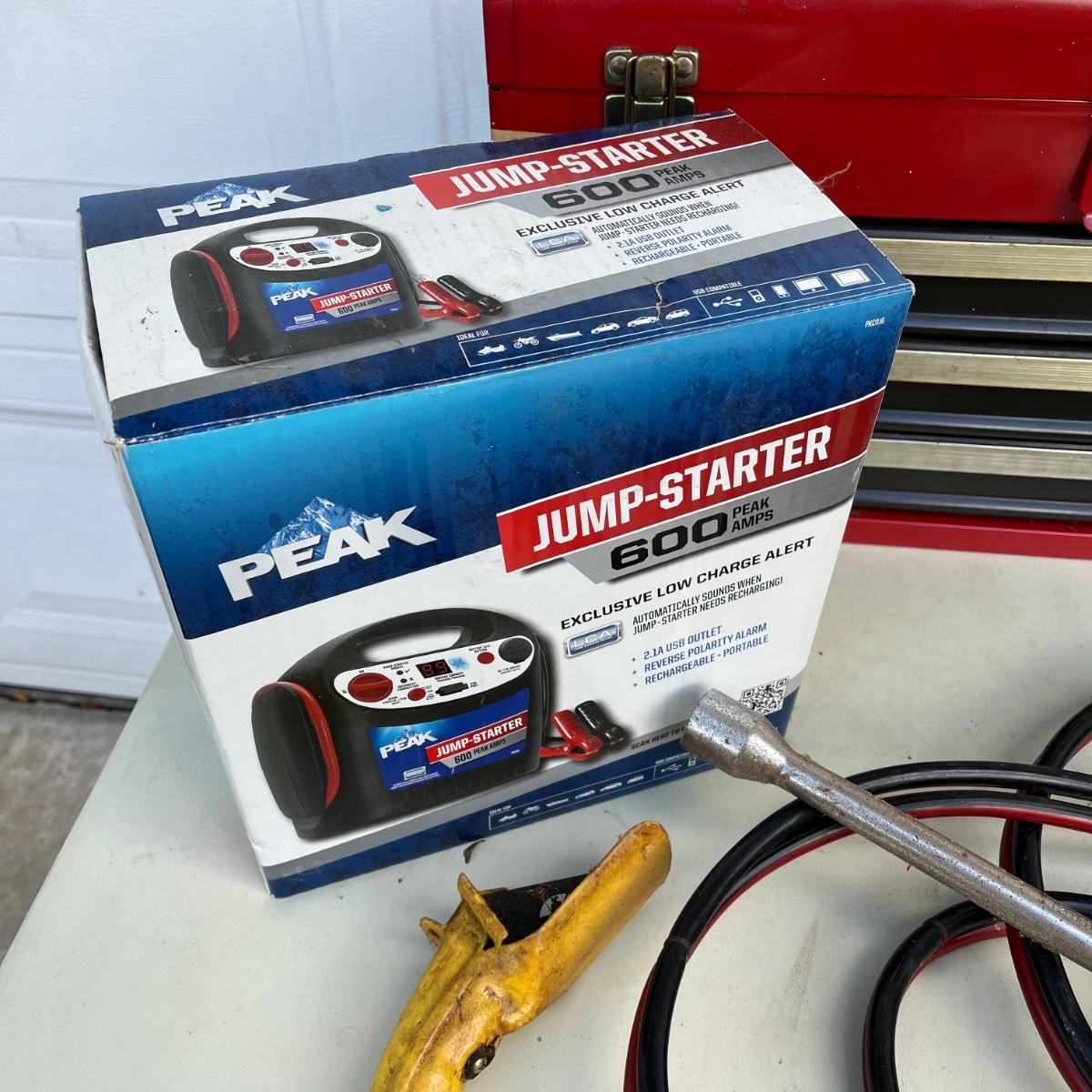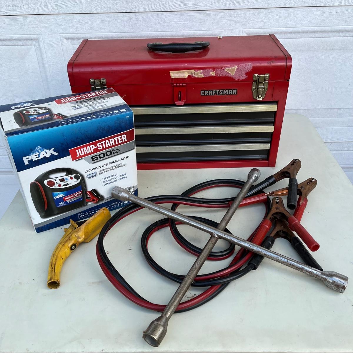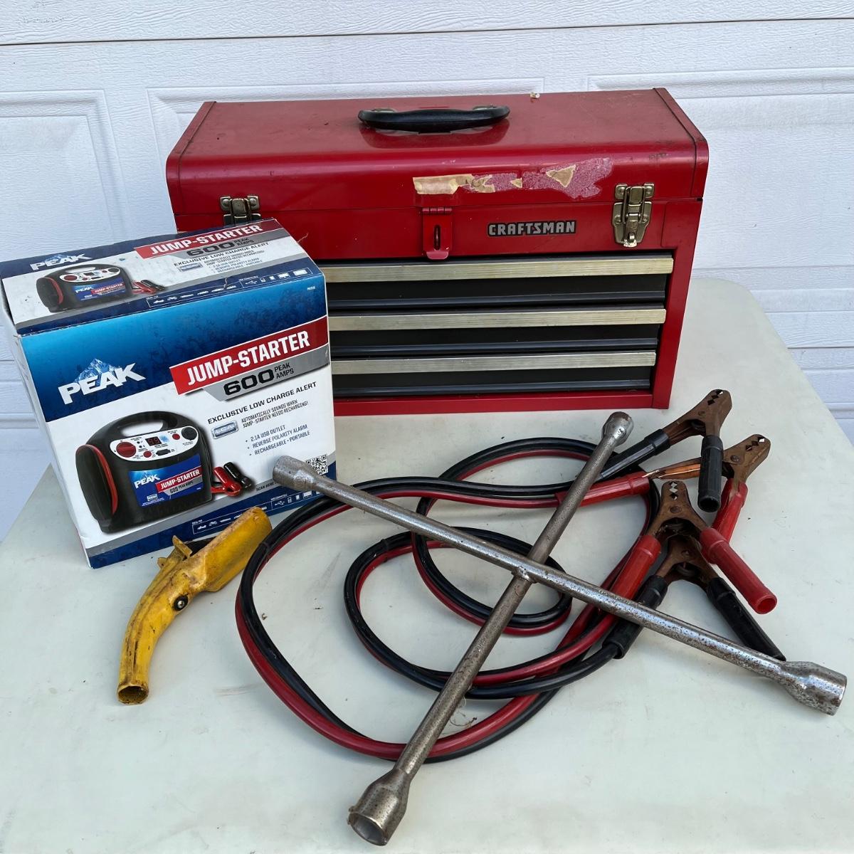 LOT 8G: Automotive Tools - Jumpstarter, Jumper Cables 4-Way Lug Wrench + Full Toolbox