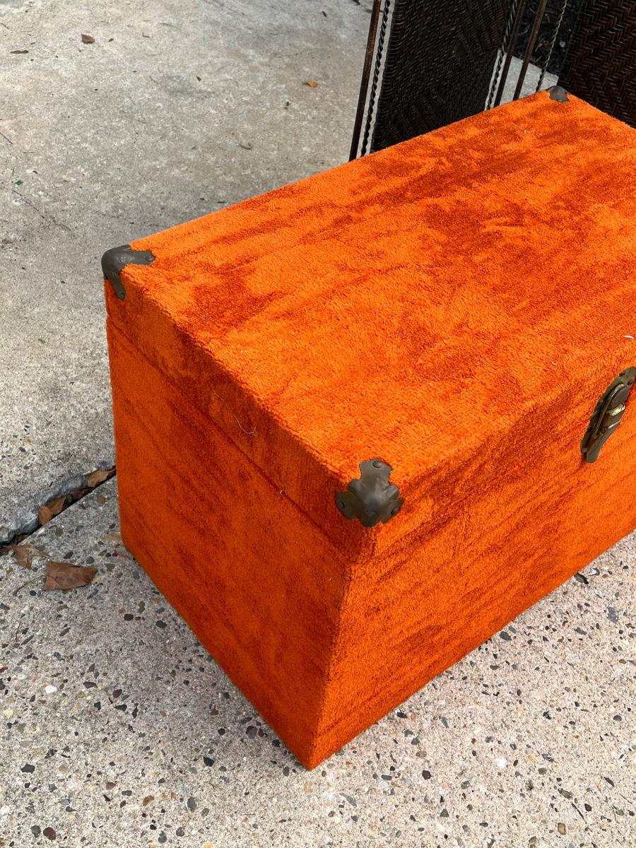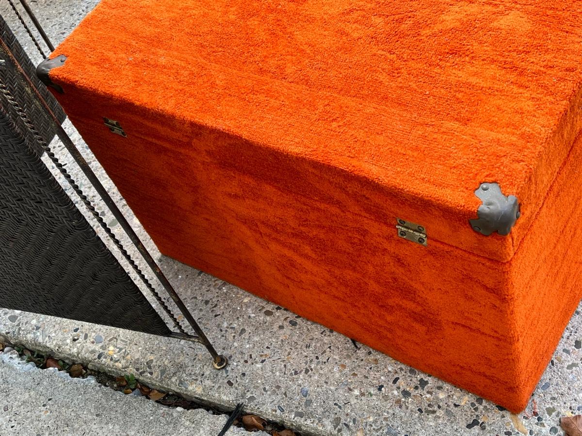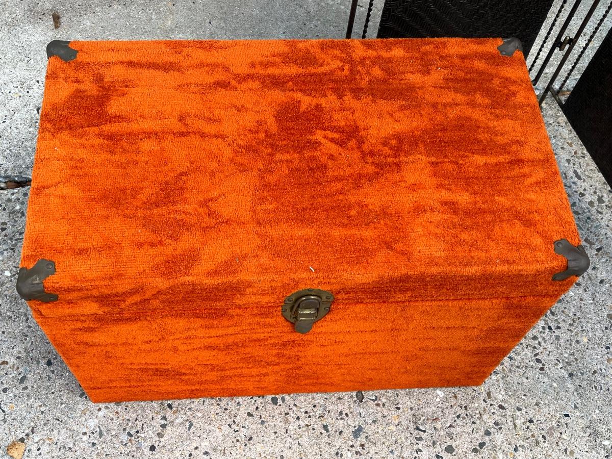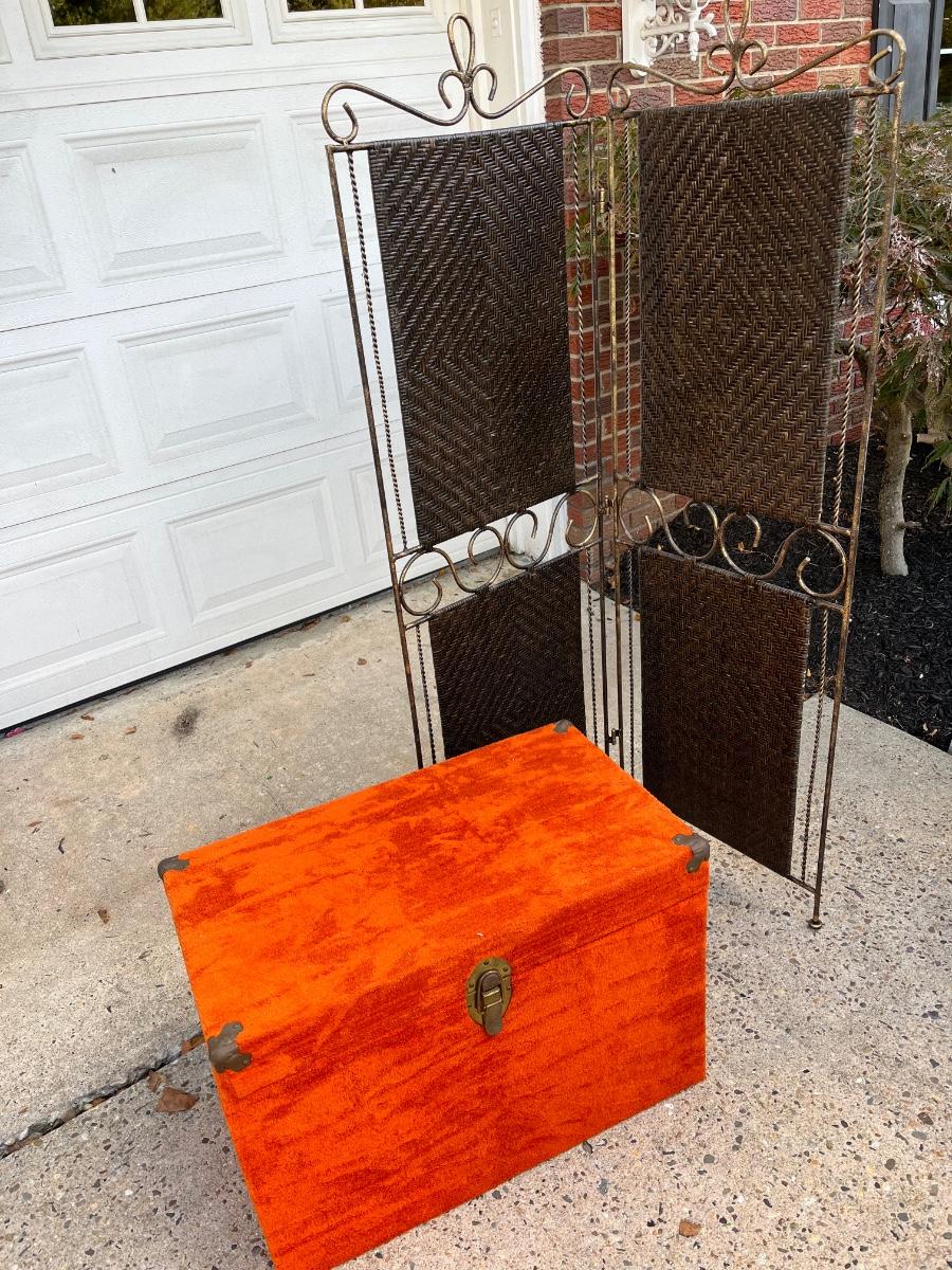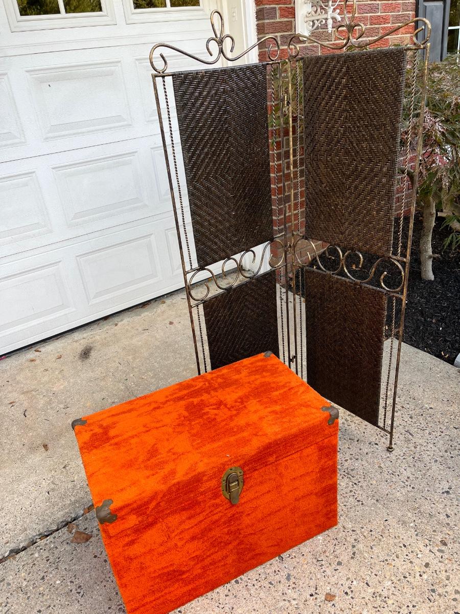 LOT 11G: Vintage Orange Upholstered Trunk + Two-Panel Decorative Metal Screen