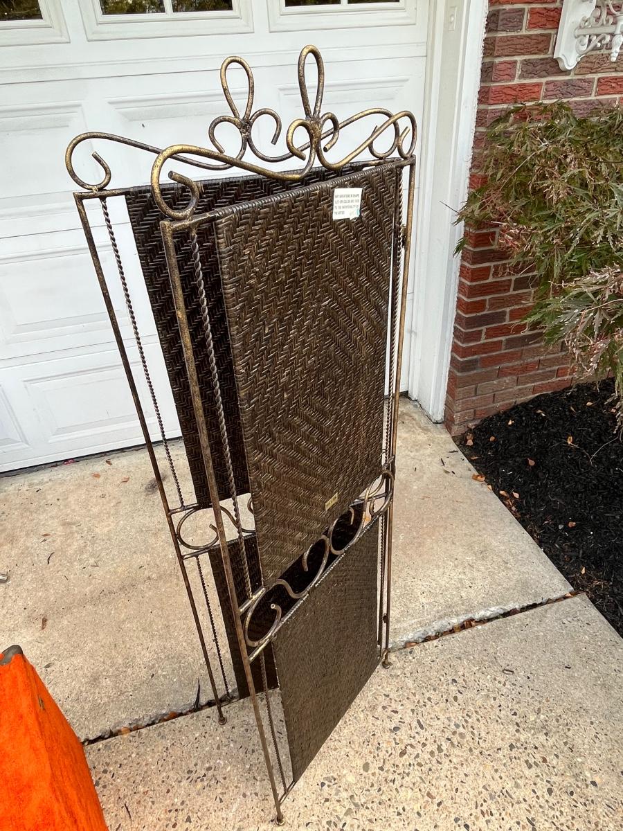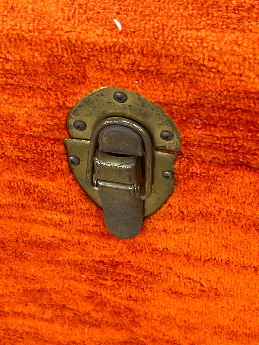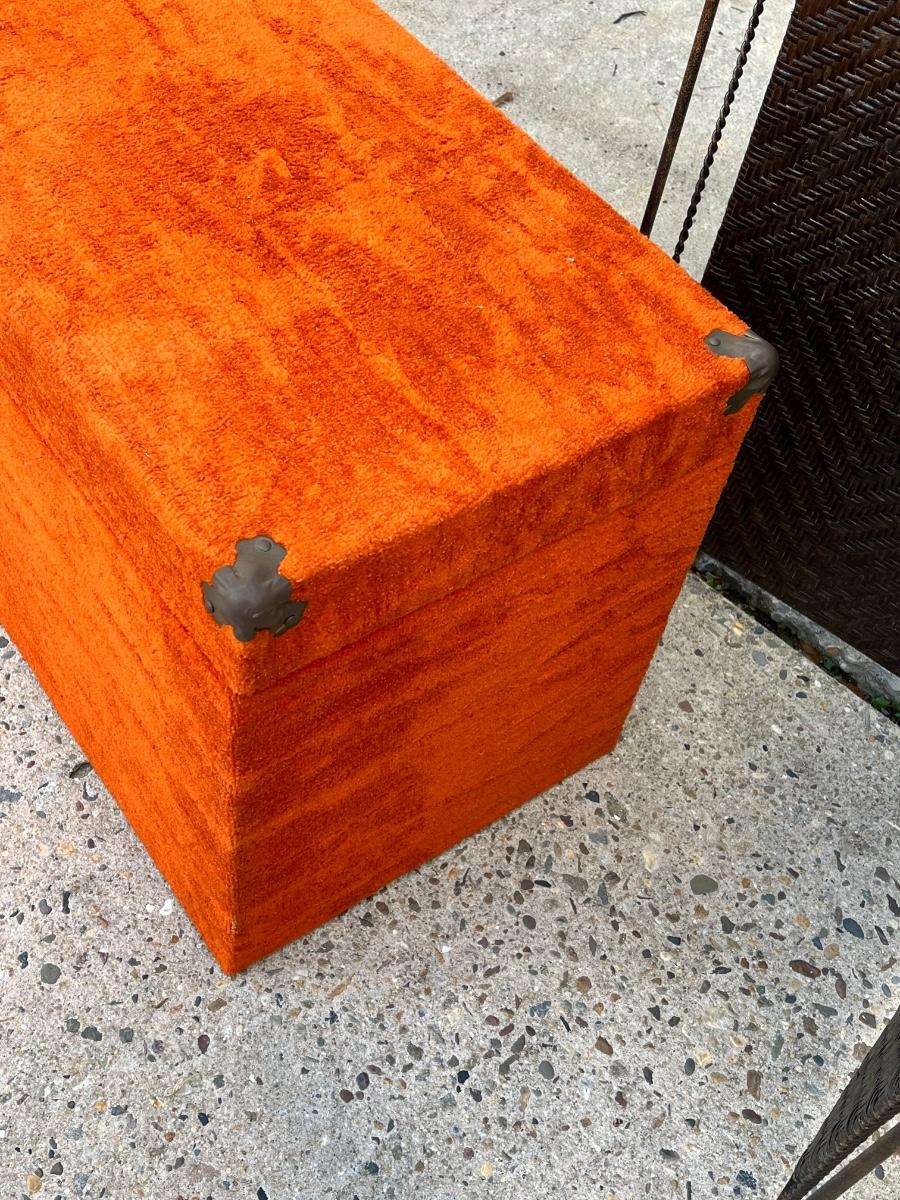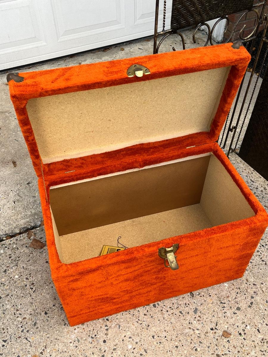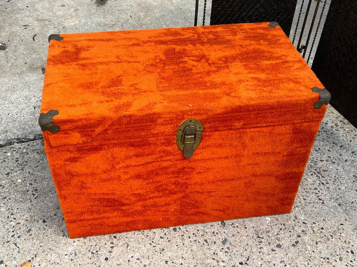 LOT 11G: Vintage Orange Upholstered Trunk + Two-Panel Decorative Metal Screen