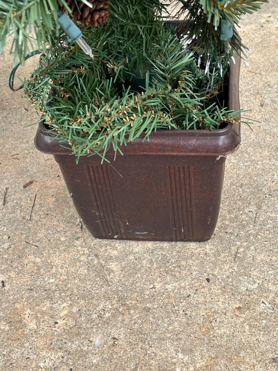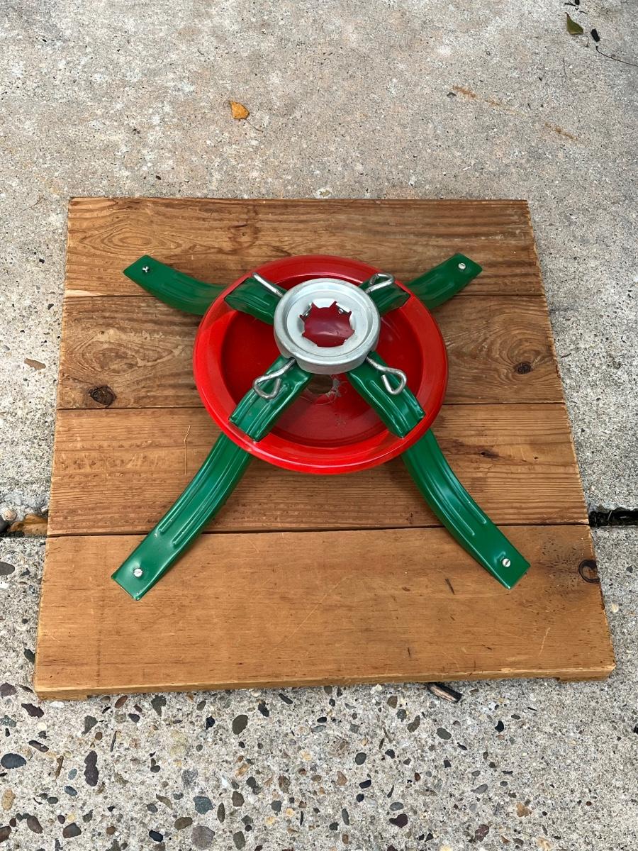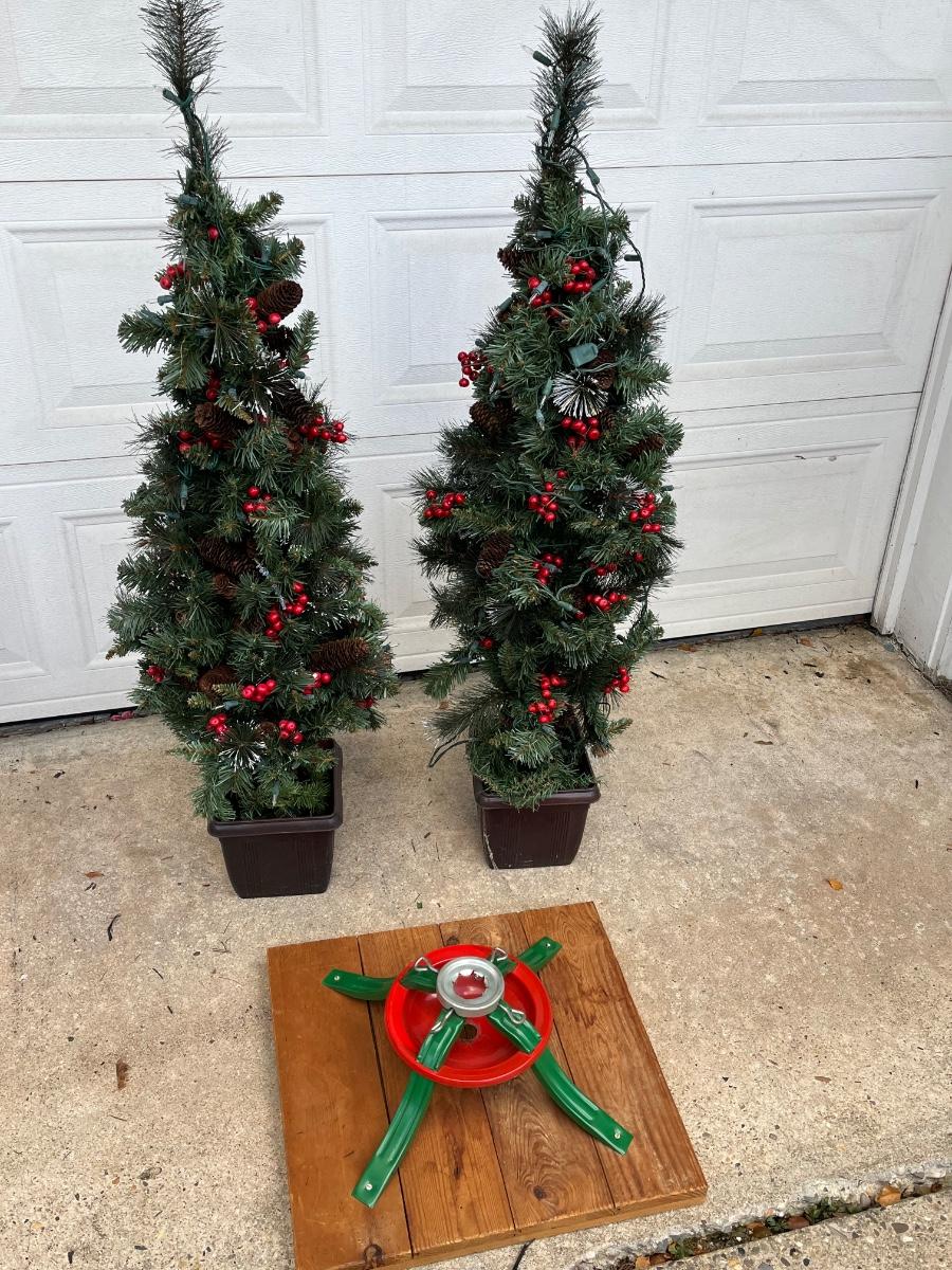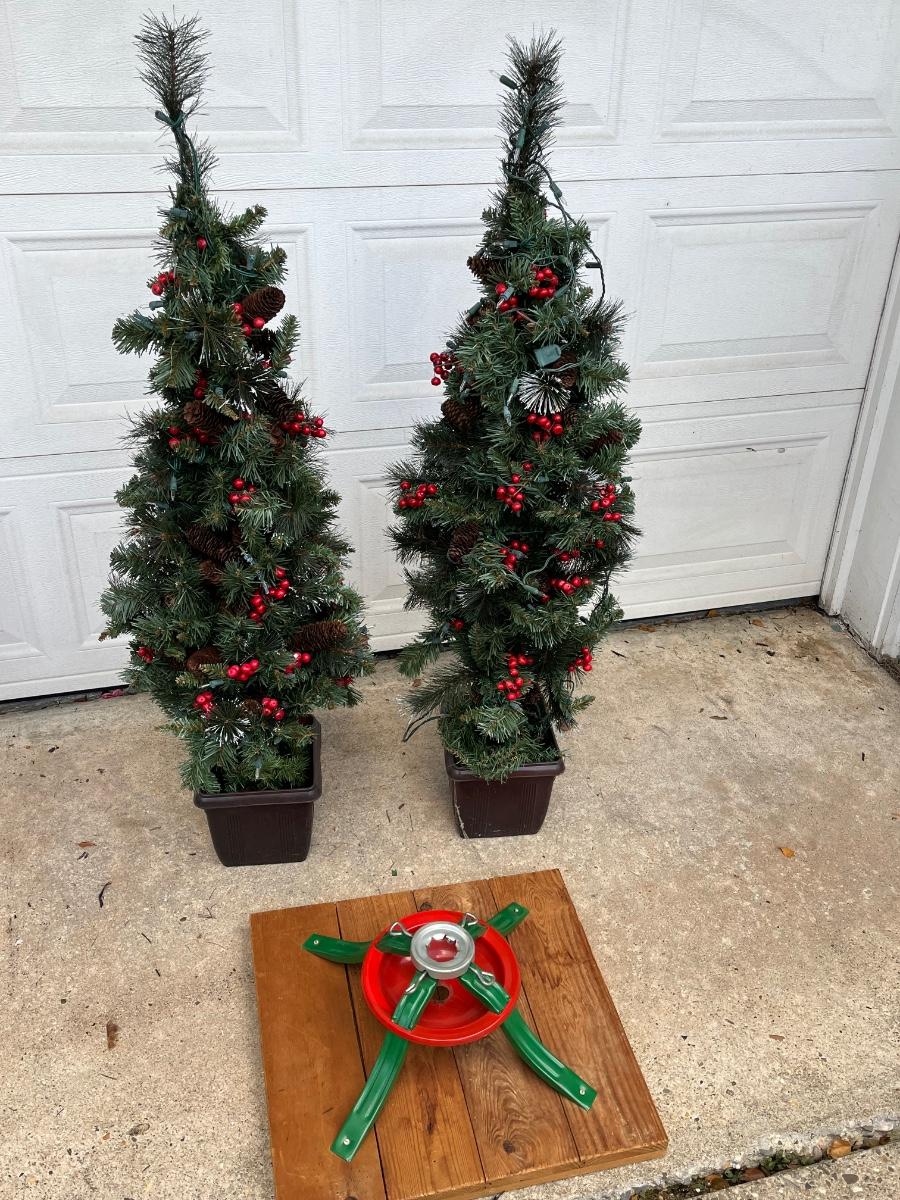 LOT 12G: Christmas Decorations - Lighted Artificial Xmas Trees + Tree Stand Mounted on Wood