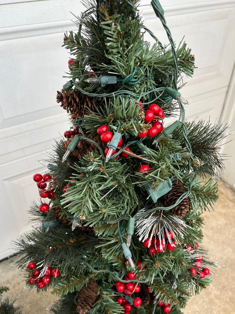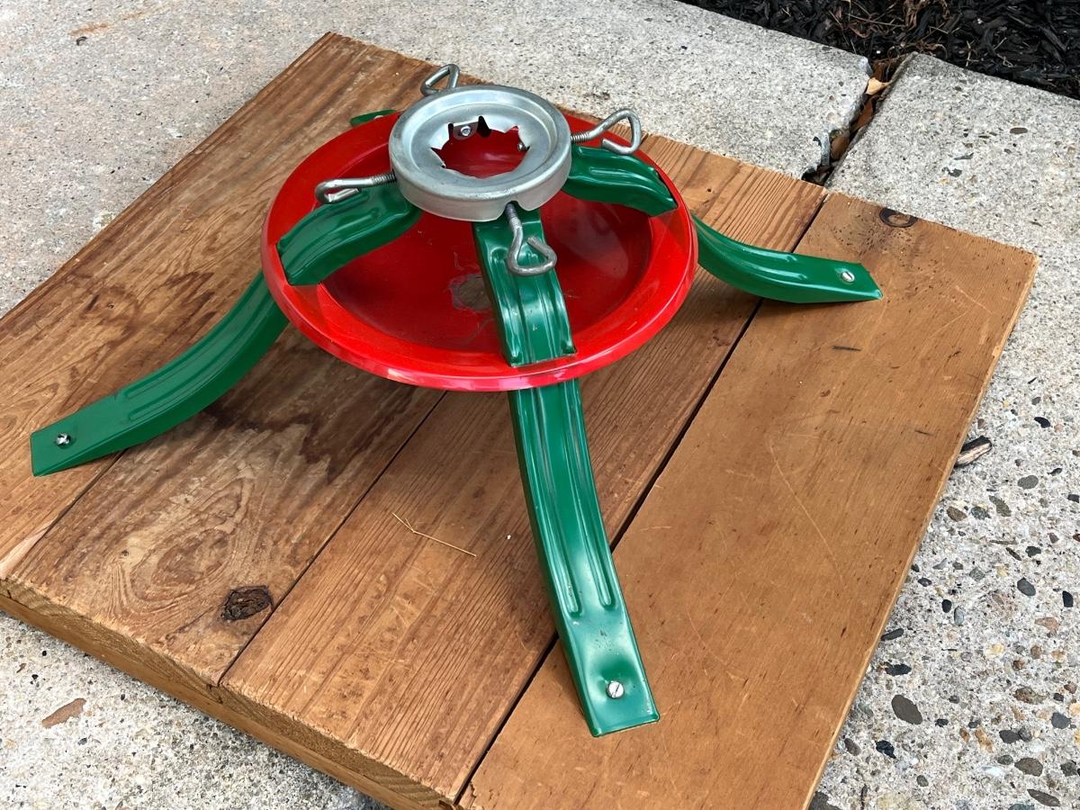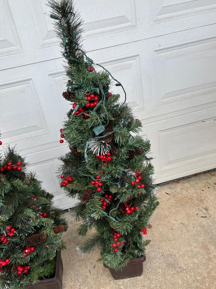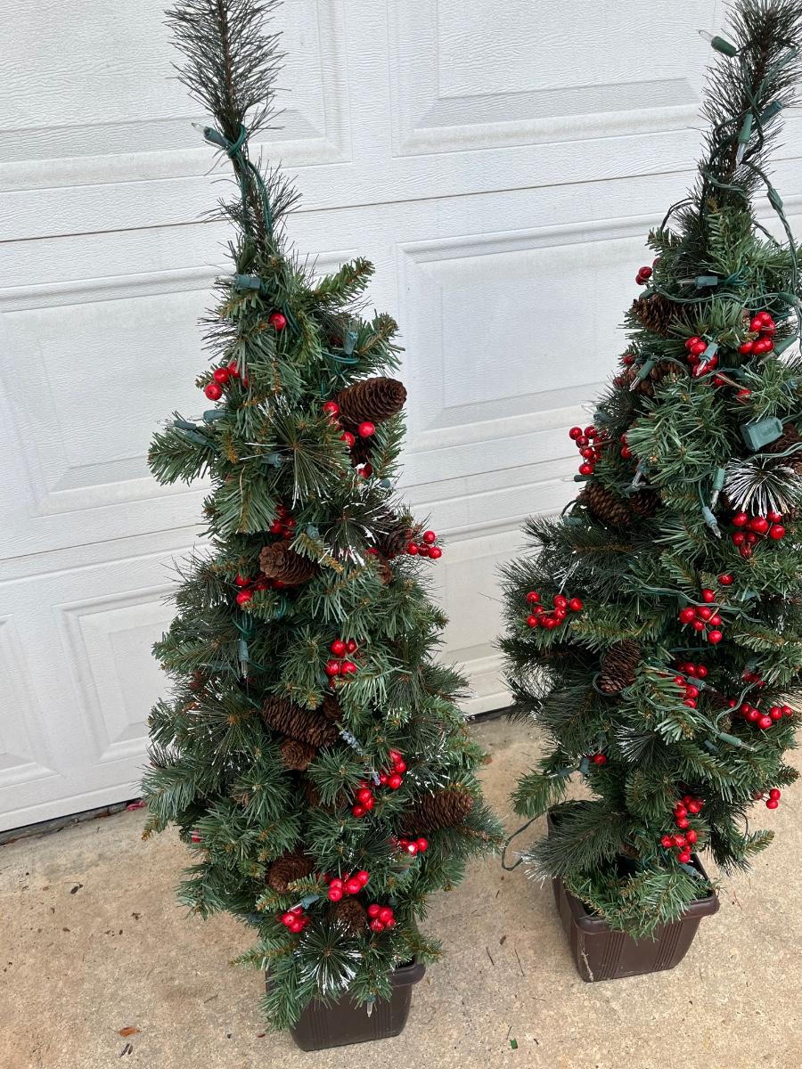 LOT 12G: Christmas Decorations - Lighted Artificial Xmas Trees + Tree Stand Mounted on Wood