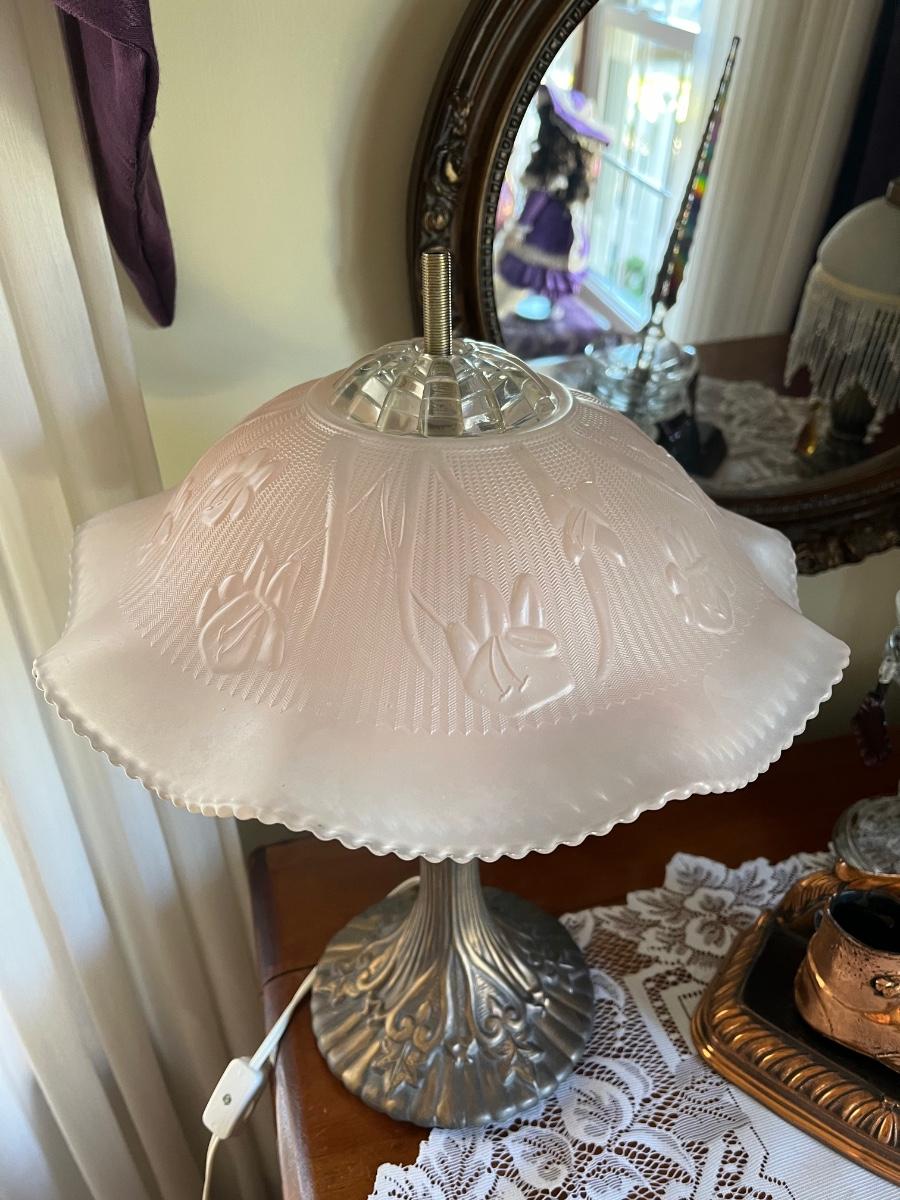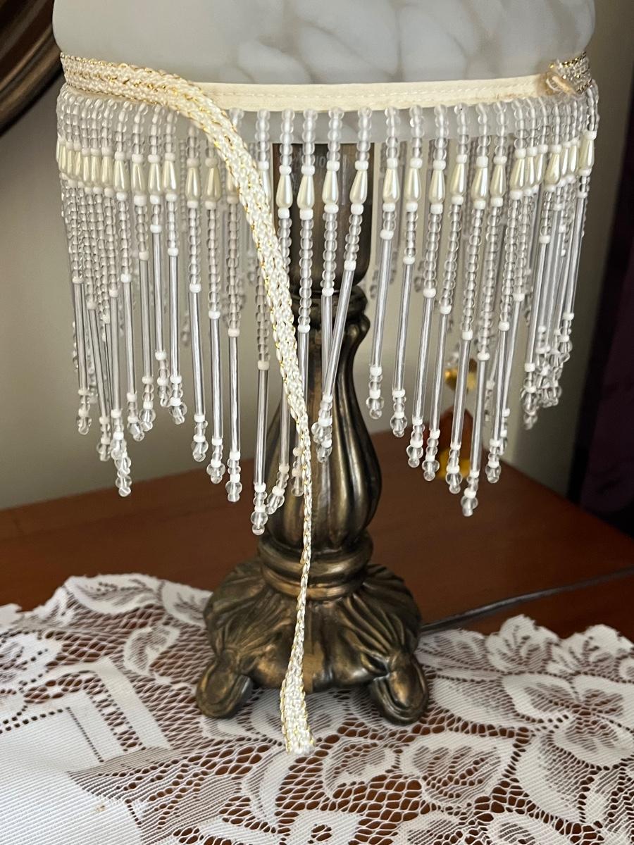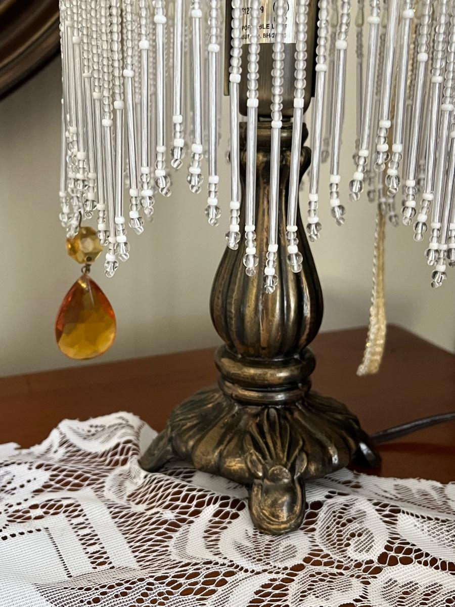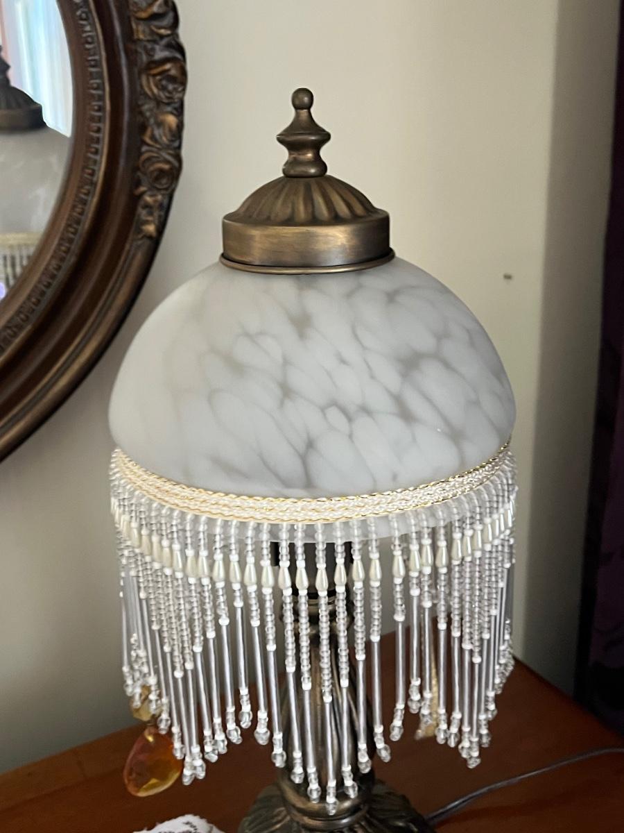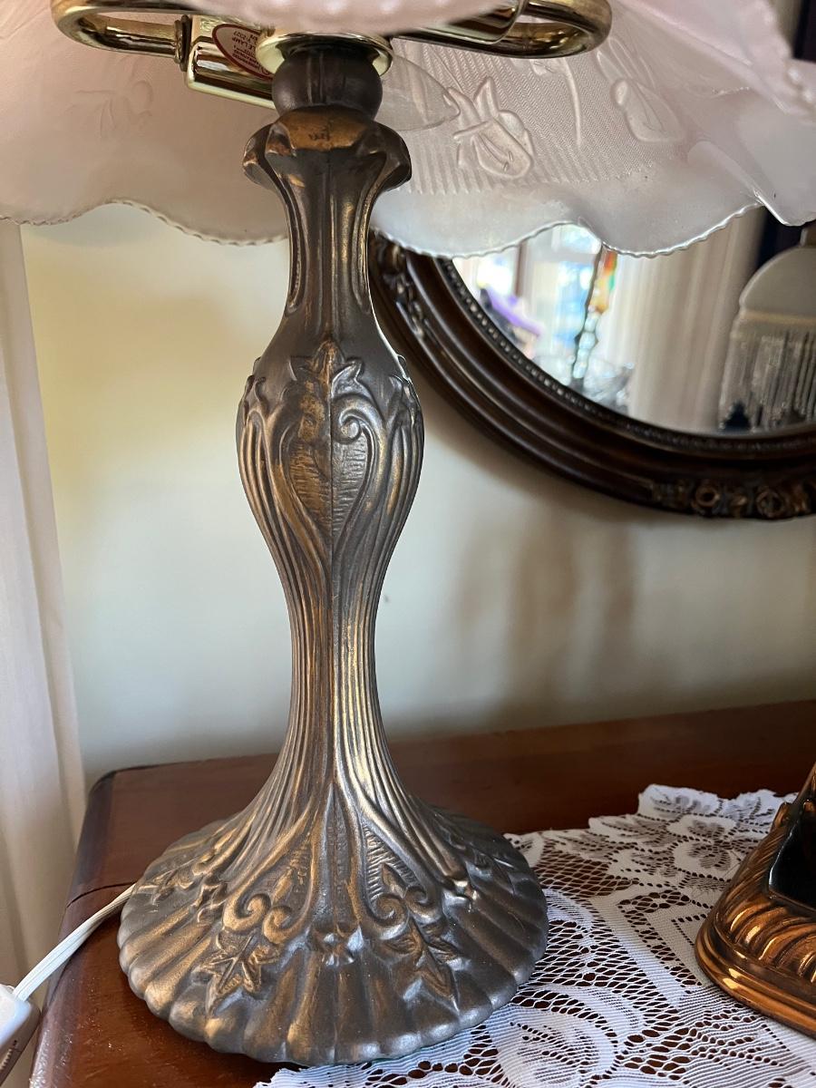 One lamp missing top finial, one has trim coming loose on shade