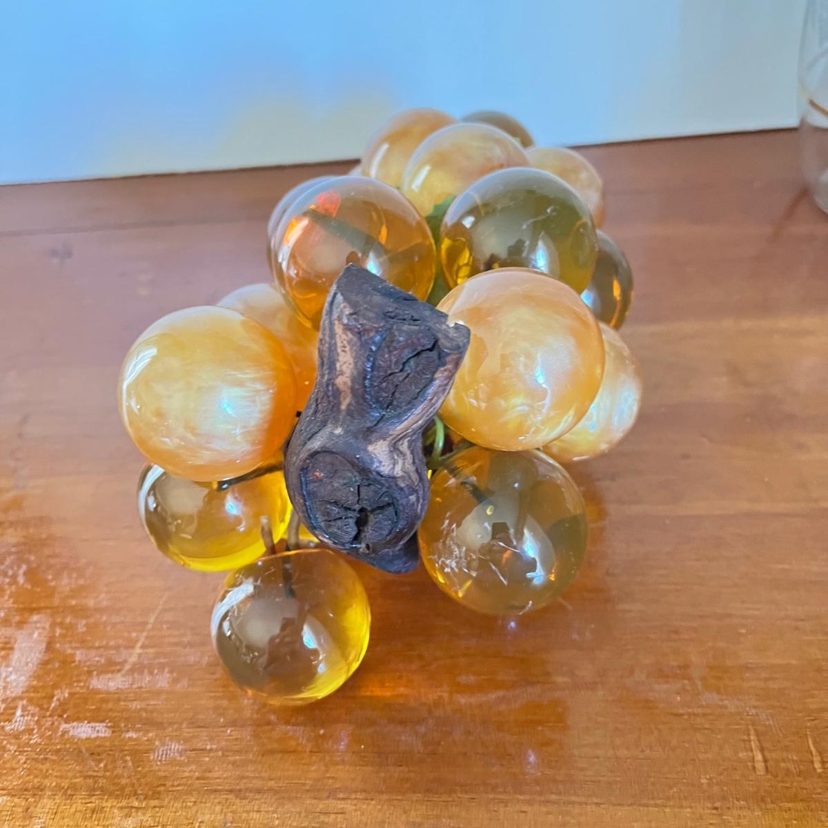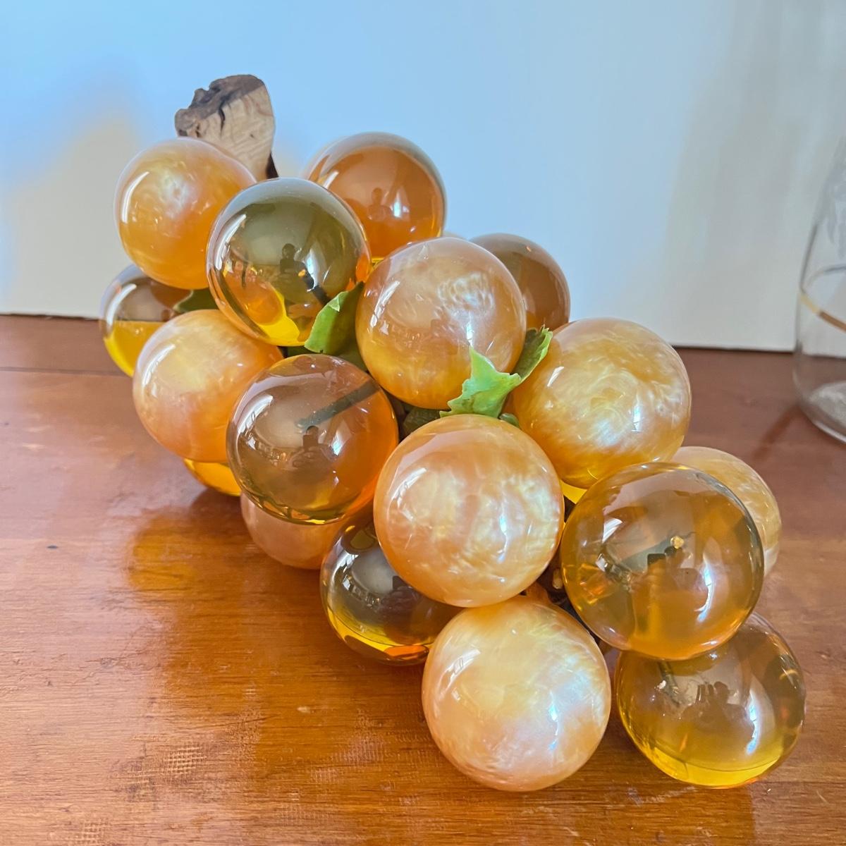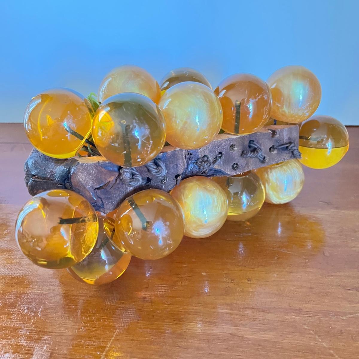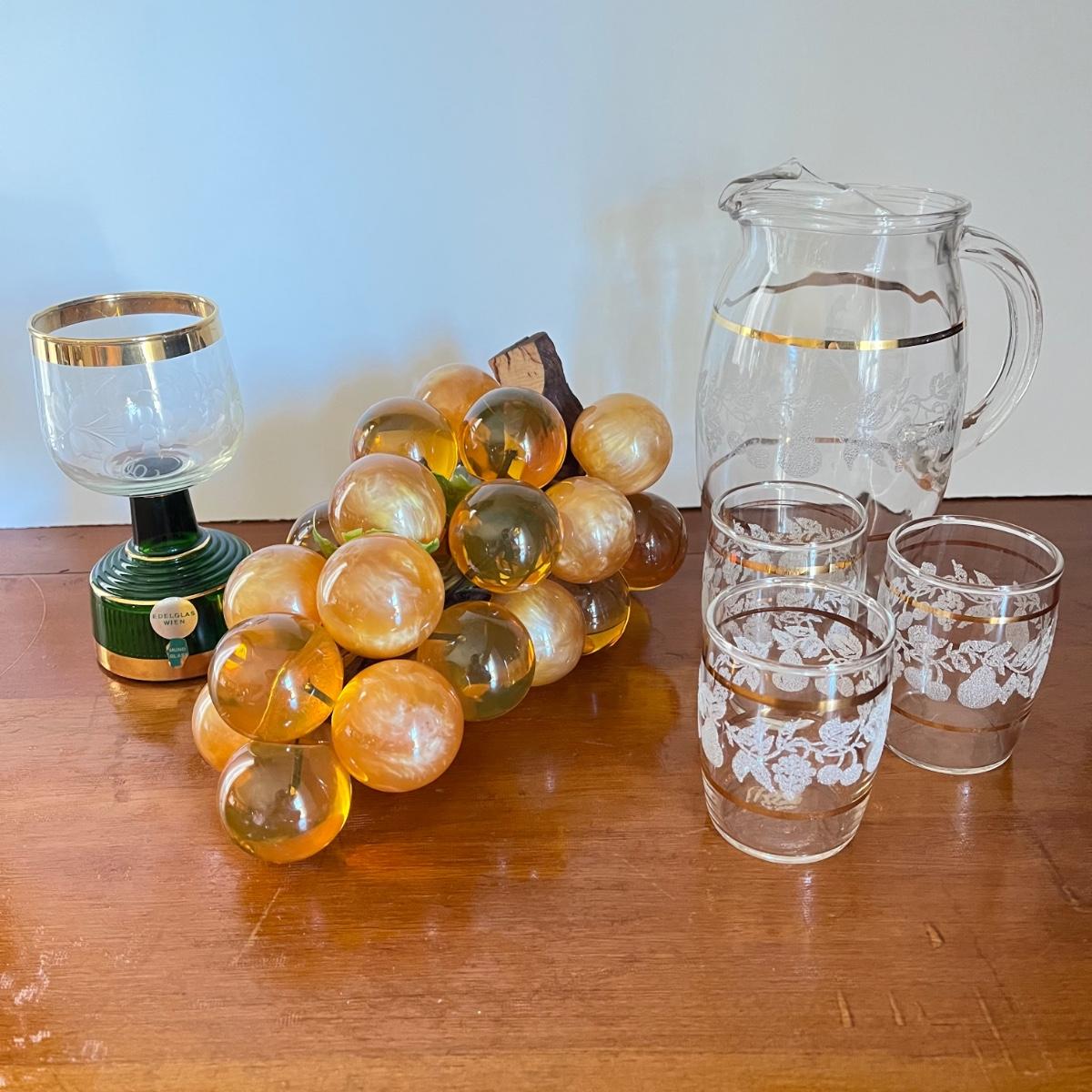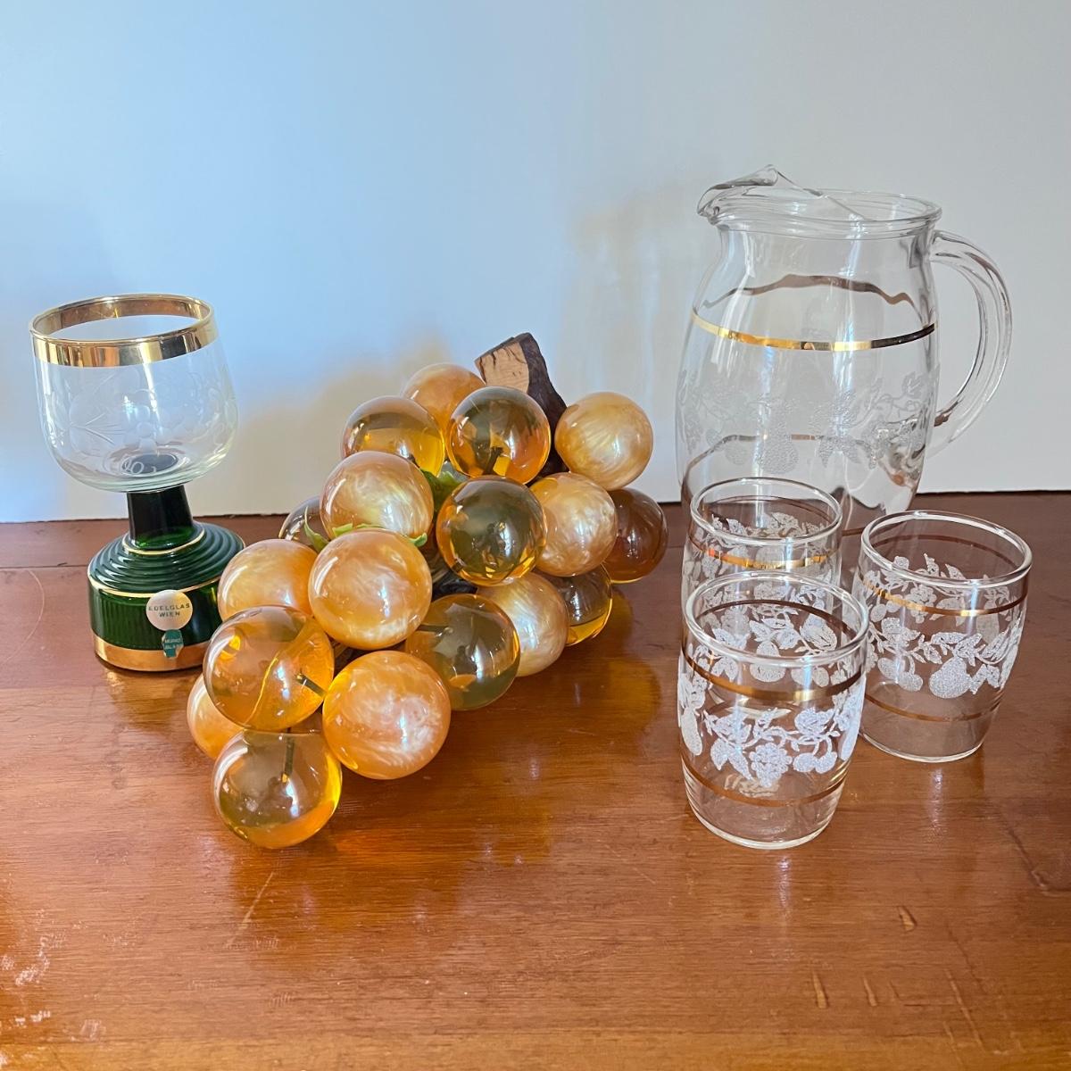 LOT 20L: Mid-Century Modern Home Decor - Acrylic Grape Cluster on Driftwood, Music Box Wine Glass, Pitcher & Glass Set MCM
