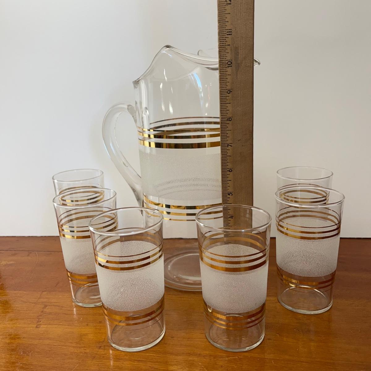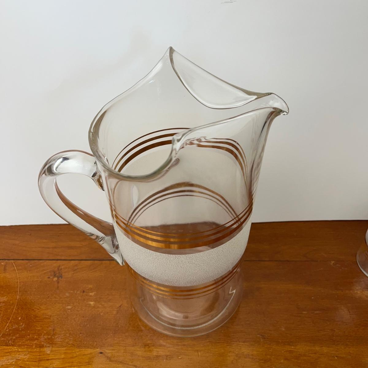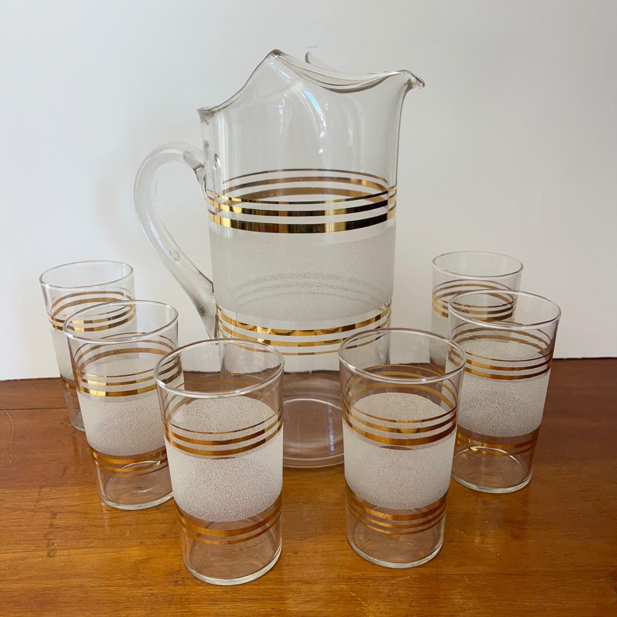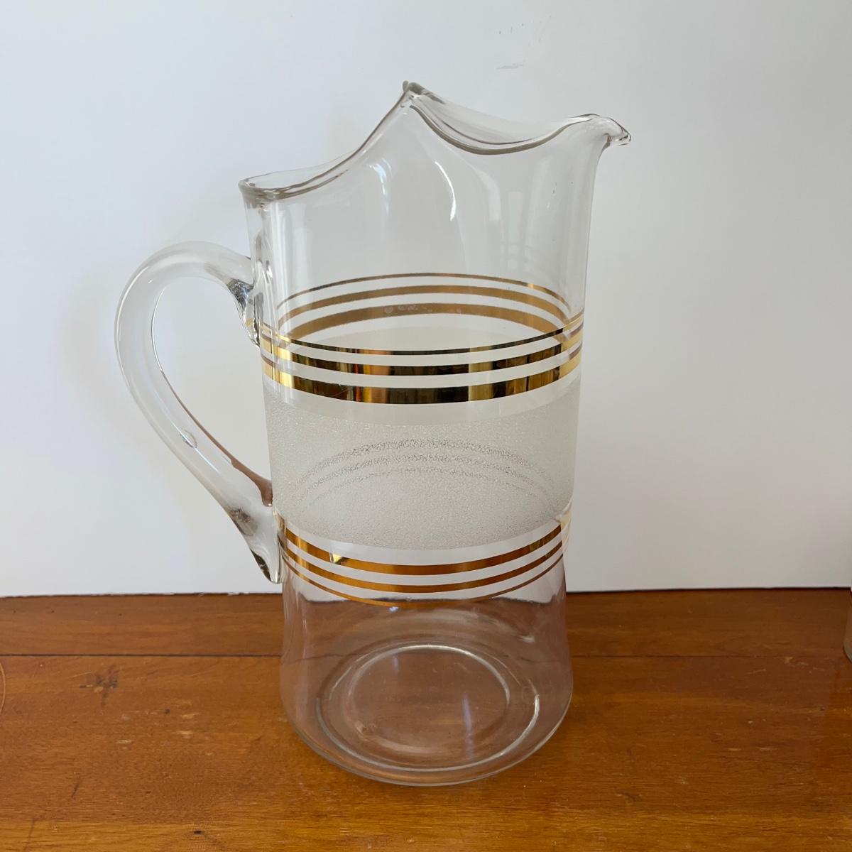 LOT 29L: Vintage Mid-Century Modern Gold Accented and Frosted Glass Pitcher & Glass Set MCM