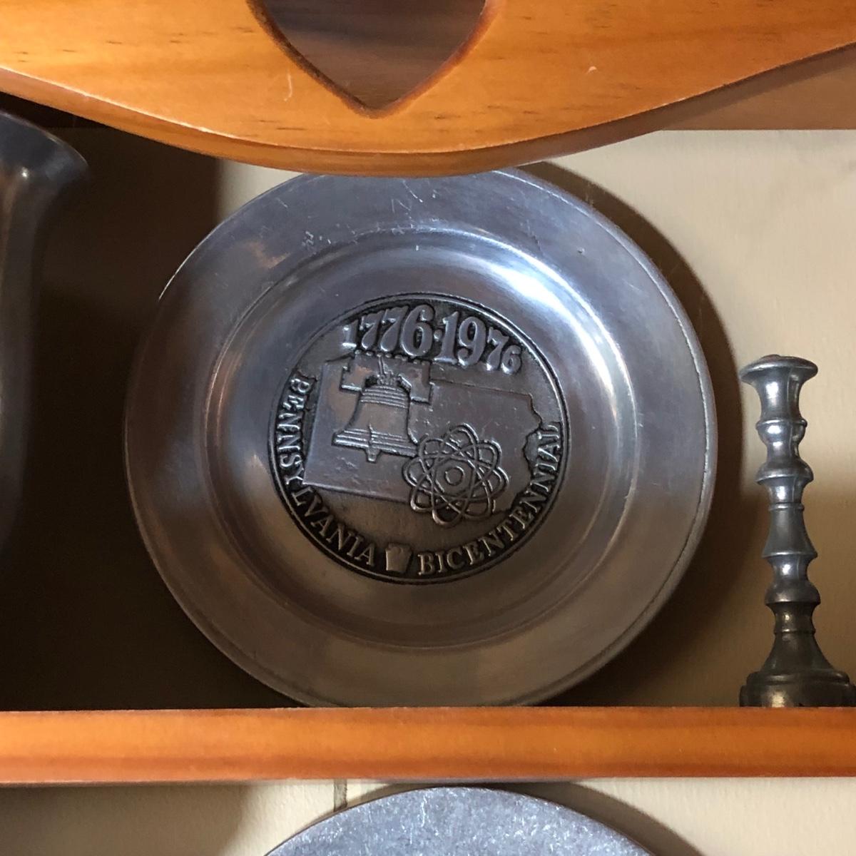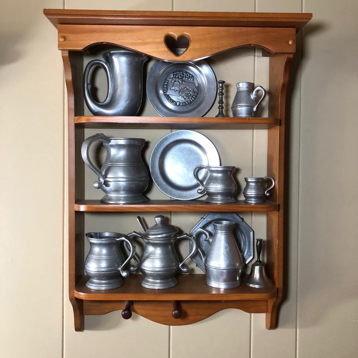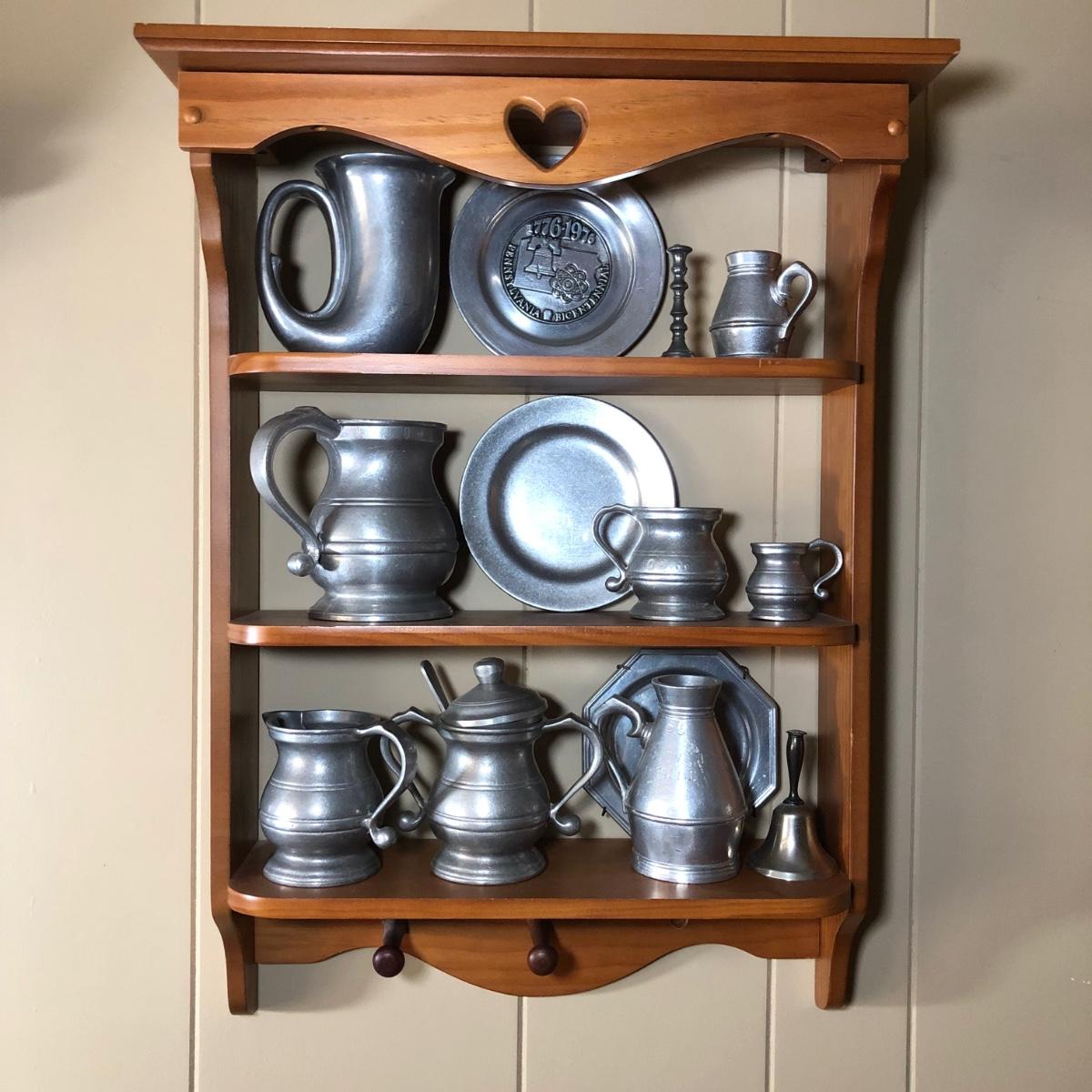 LOT 72F: Wooden Display Shelf w/ Metal Decor - Ourtale by Leonard (Italy), RWP, Bicentennial Plate & More