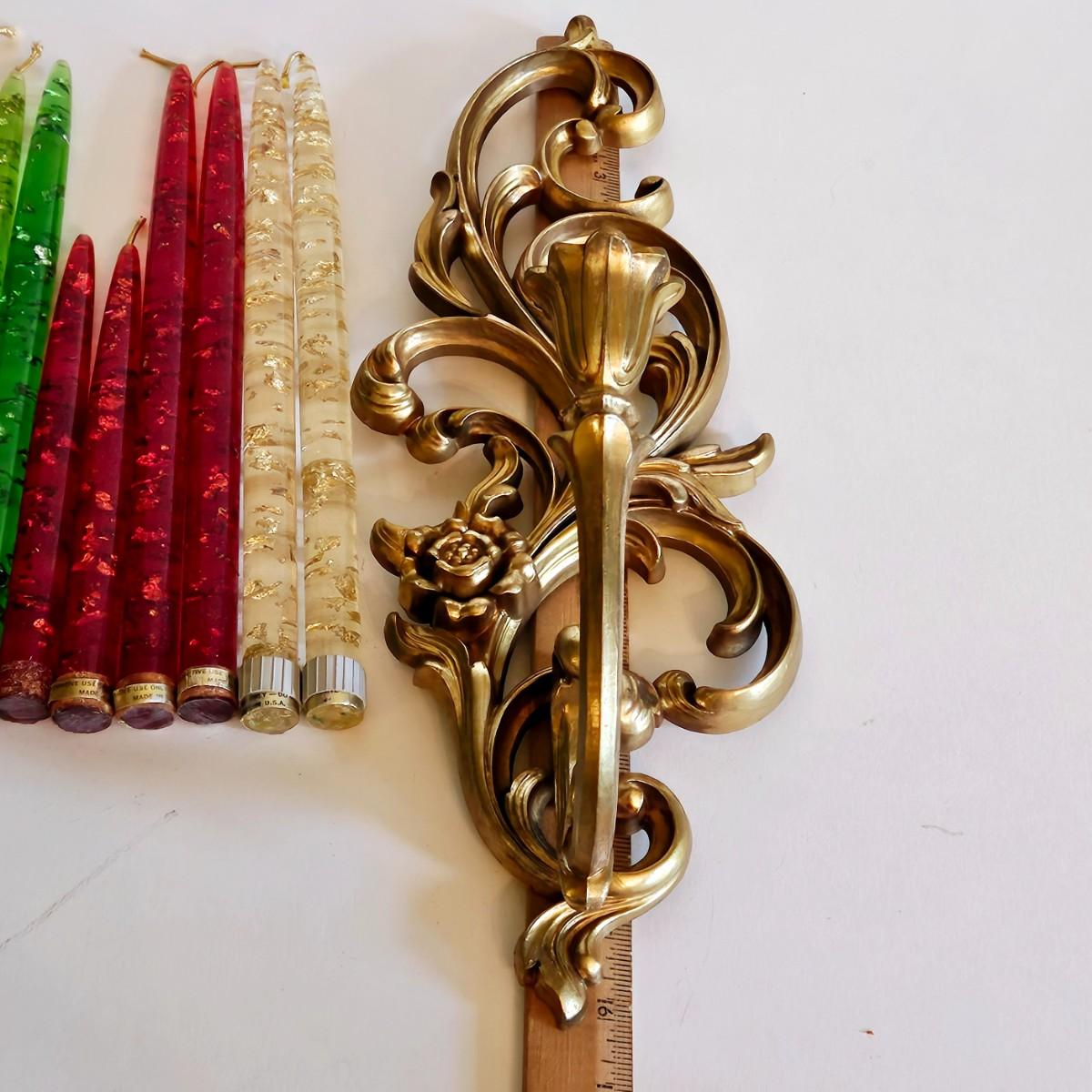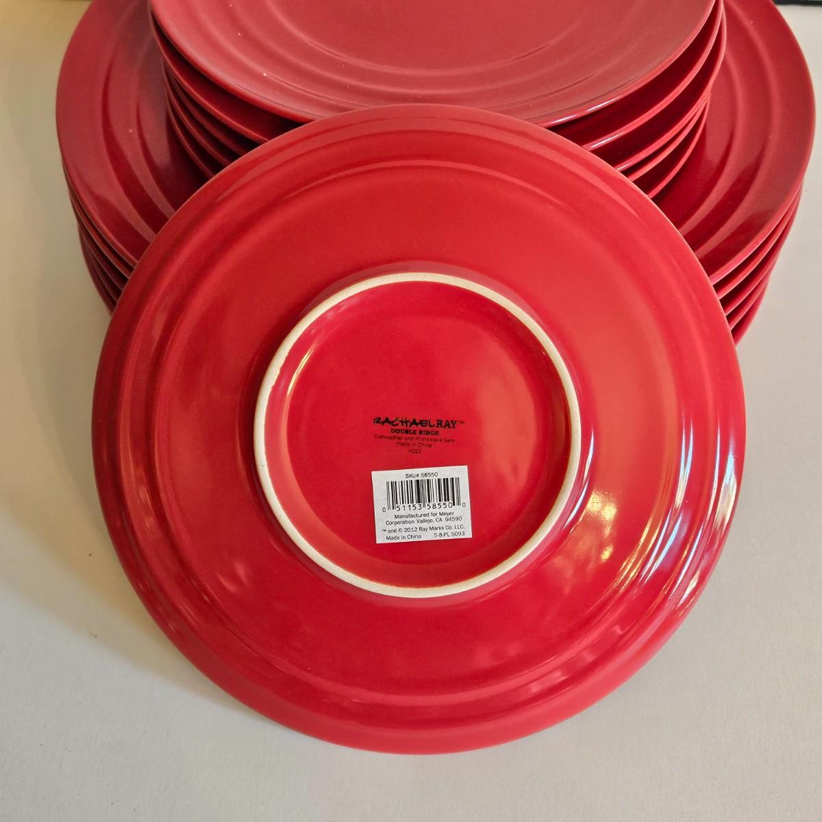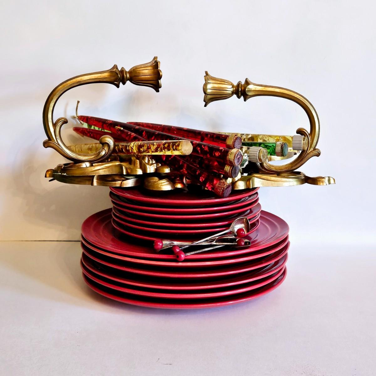 LOT 85D: Collection of Red Rachel Ray Plates, Glass Candle & Gold Plastic Sconces