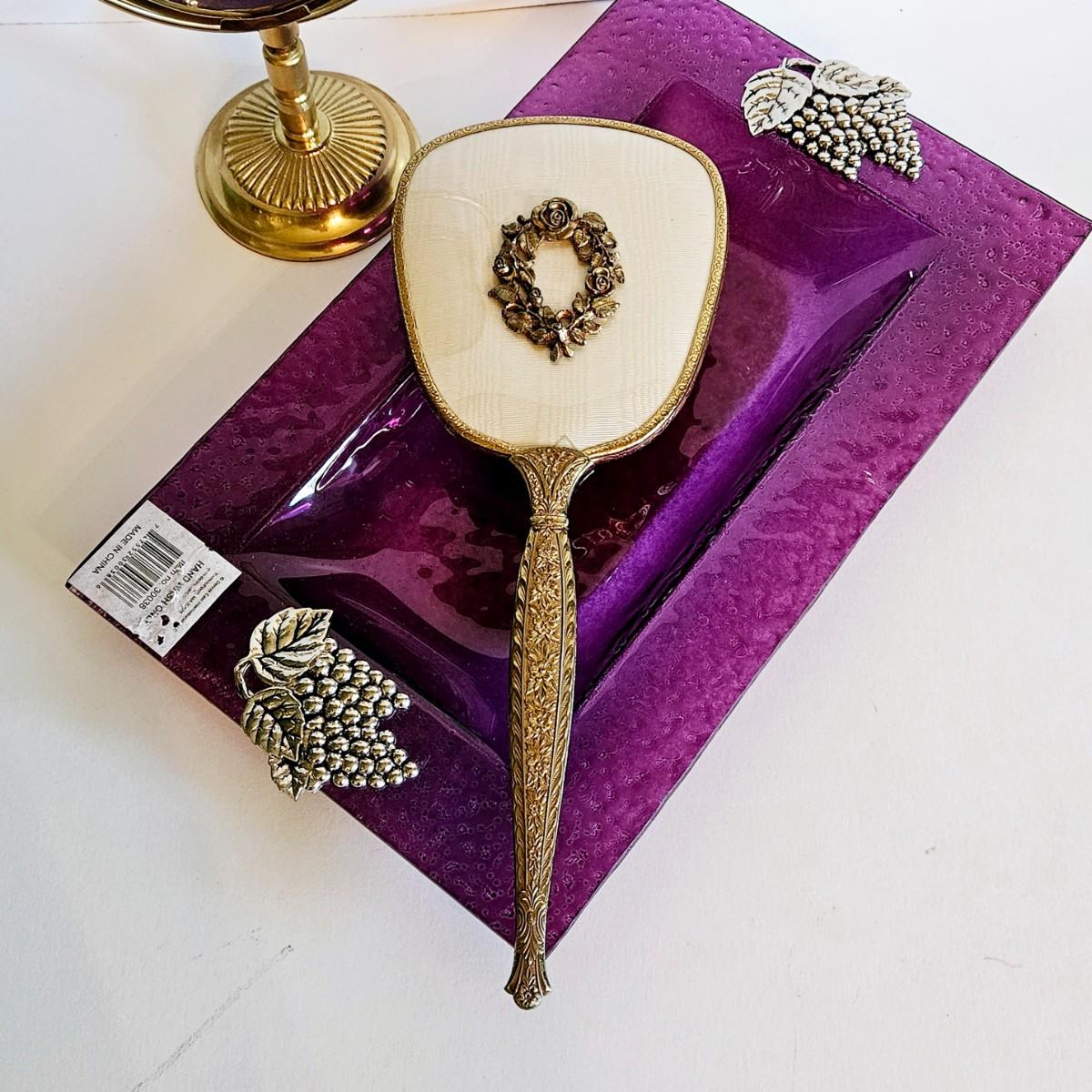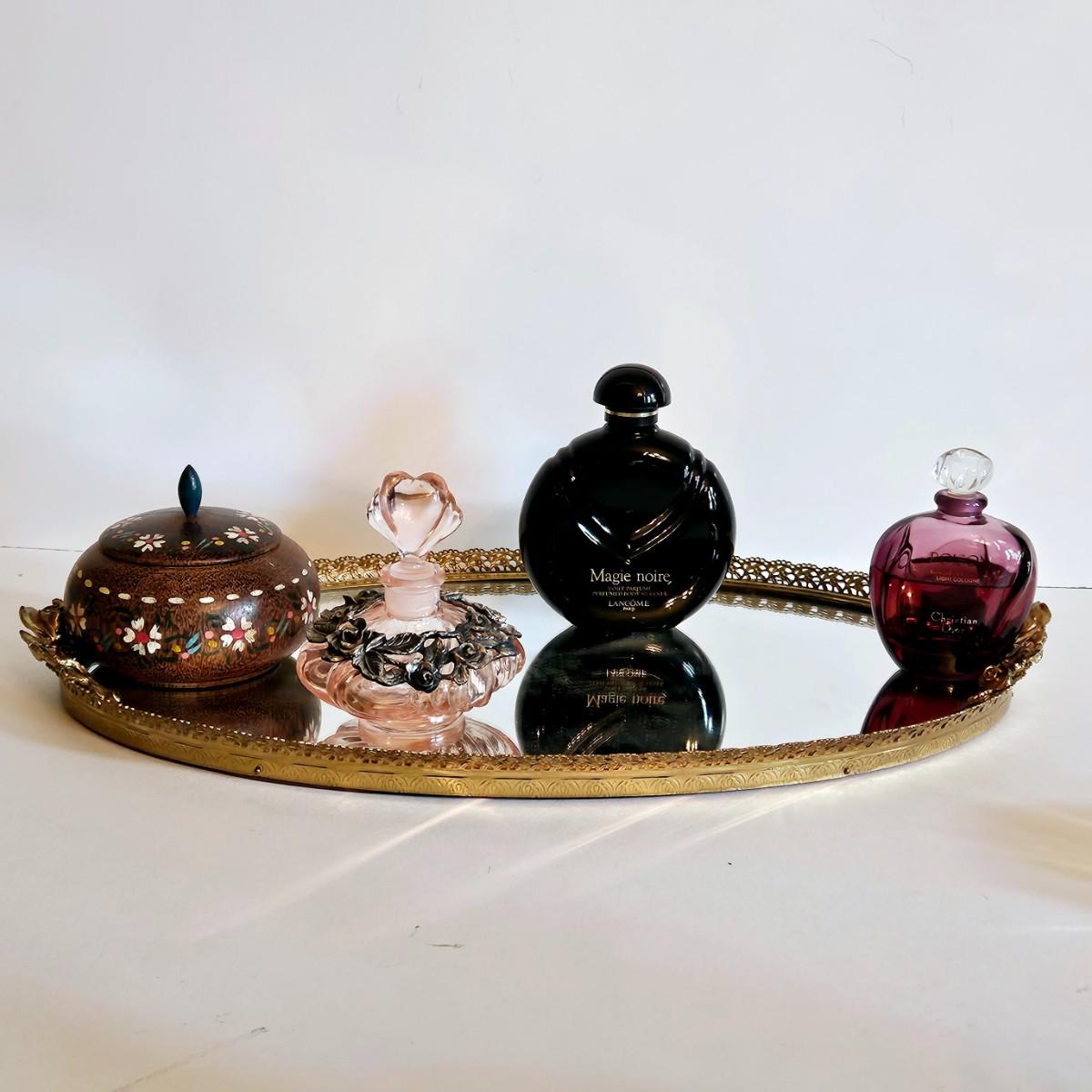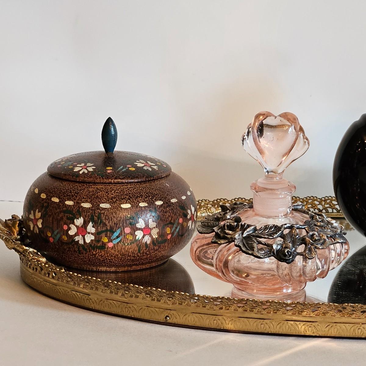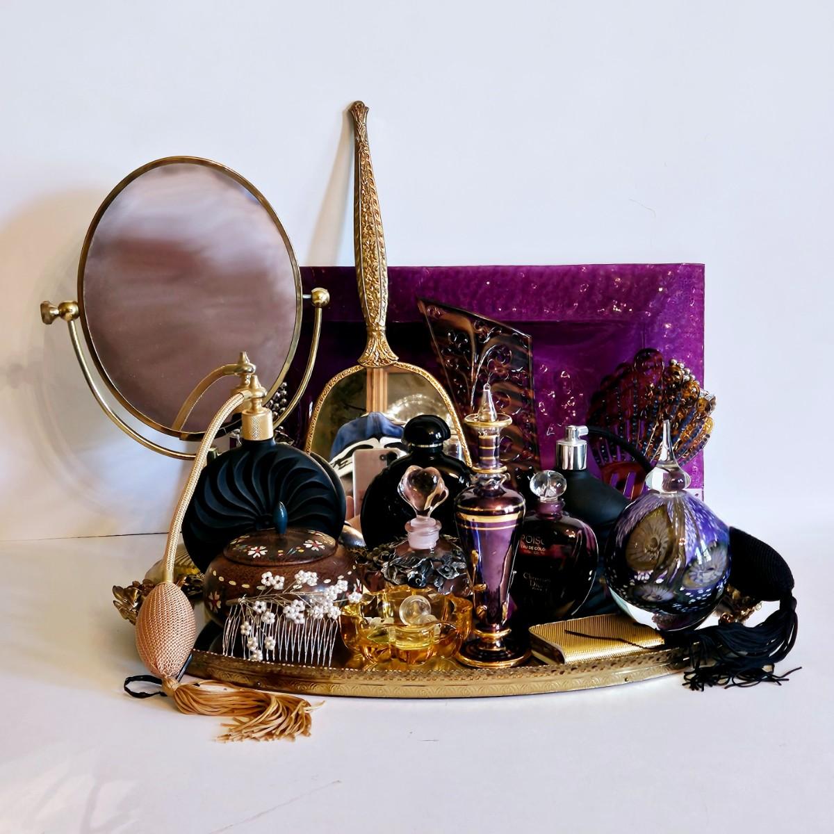 LOT 86D: Ladies Vanity: Art Glass Perfume Bottle, Christian Dior Perfume, Mirror, Hair Combs and More