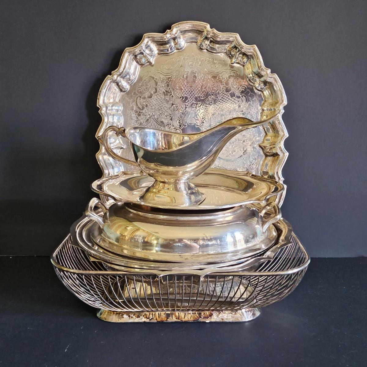 LOT 103D: Vintage Mixed Collection of Silverplate Serving Trays, Basket & More
