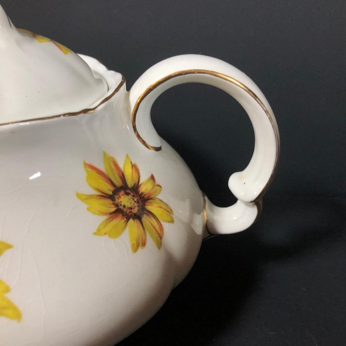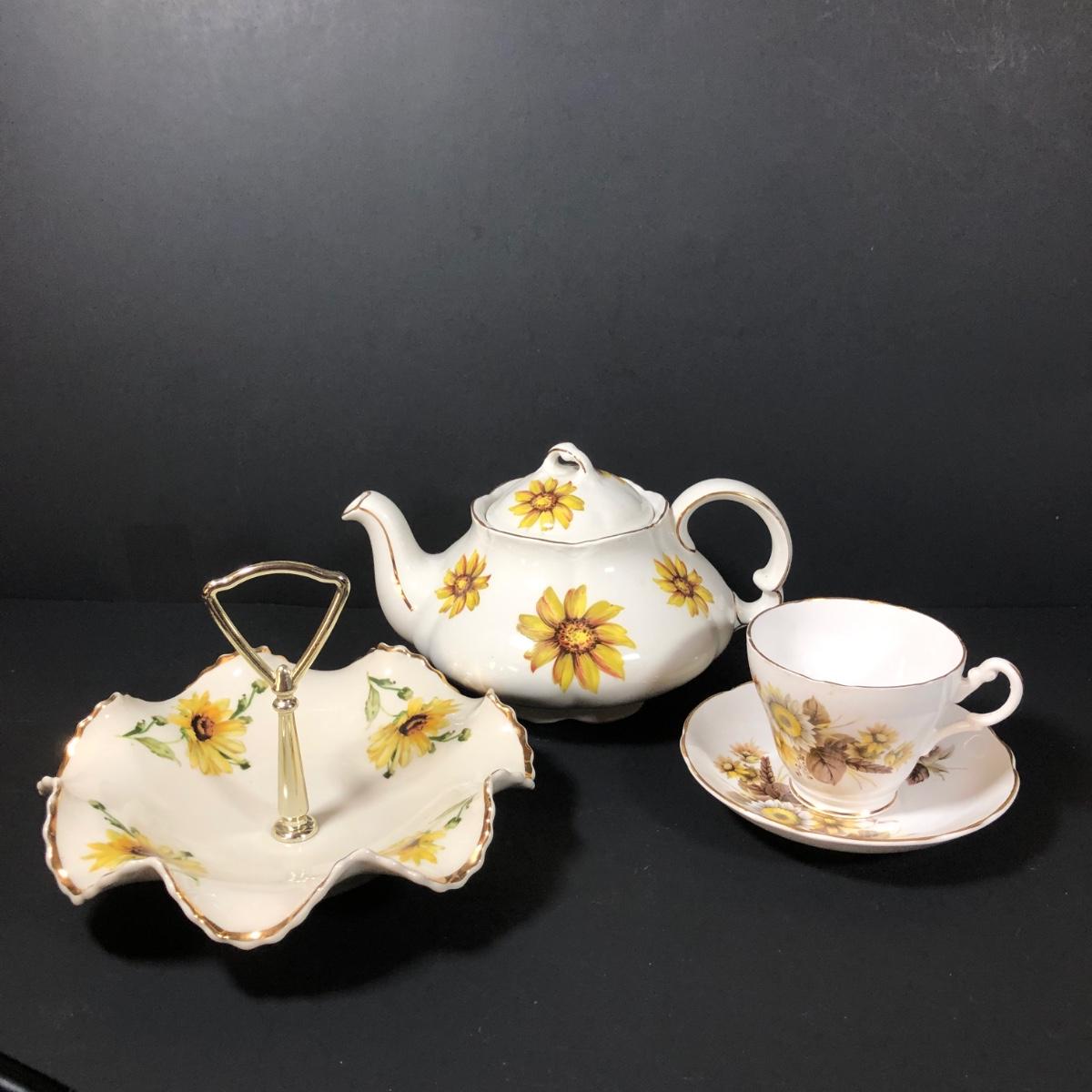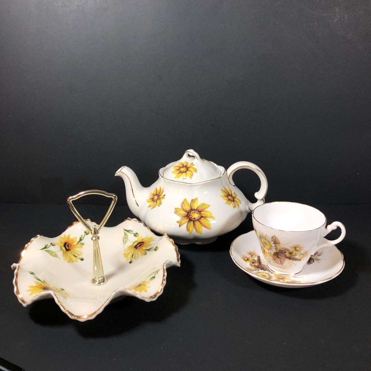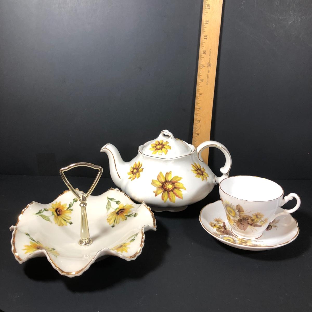 LOT 124K: Sunflower China - Wood & Sons Tea Pot, Bel-Tenn 22kt Gold Accented Tray & Royal Ascot Teacup w/ Saucer
