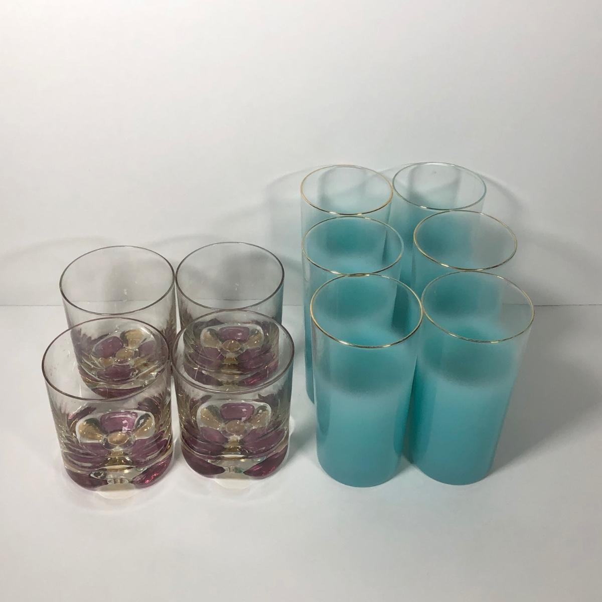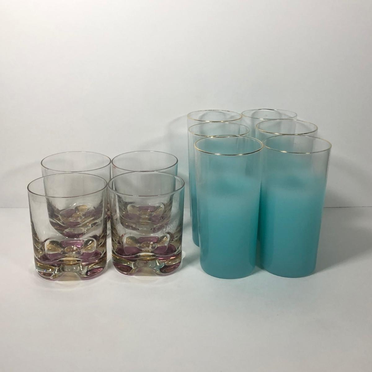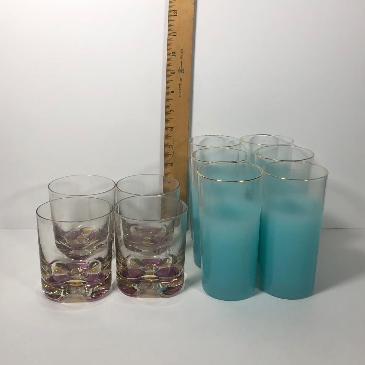 LOT 128K: Vintage Blue Frosted Gold Rim Glasses (6) & Amethyst Purple Rocks Glasses (4)