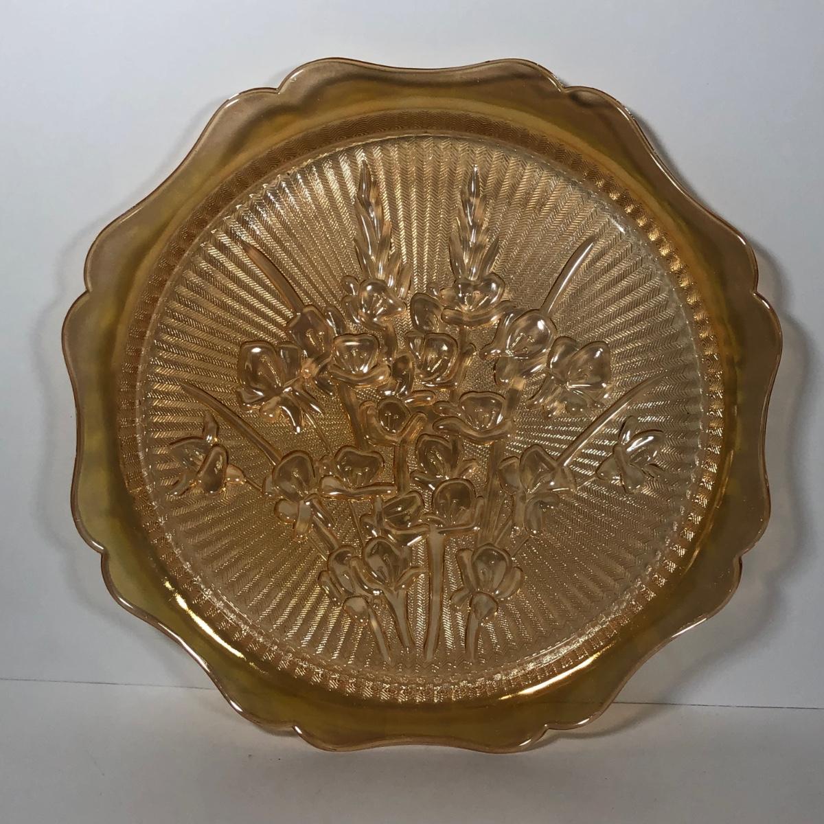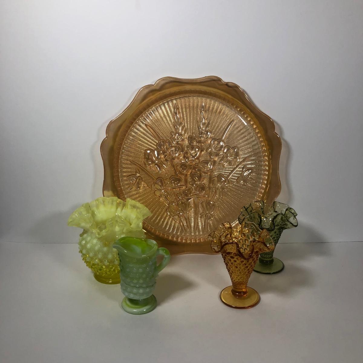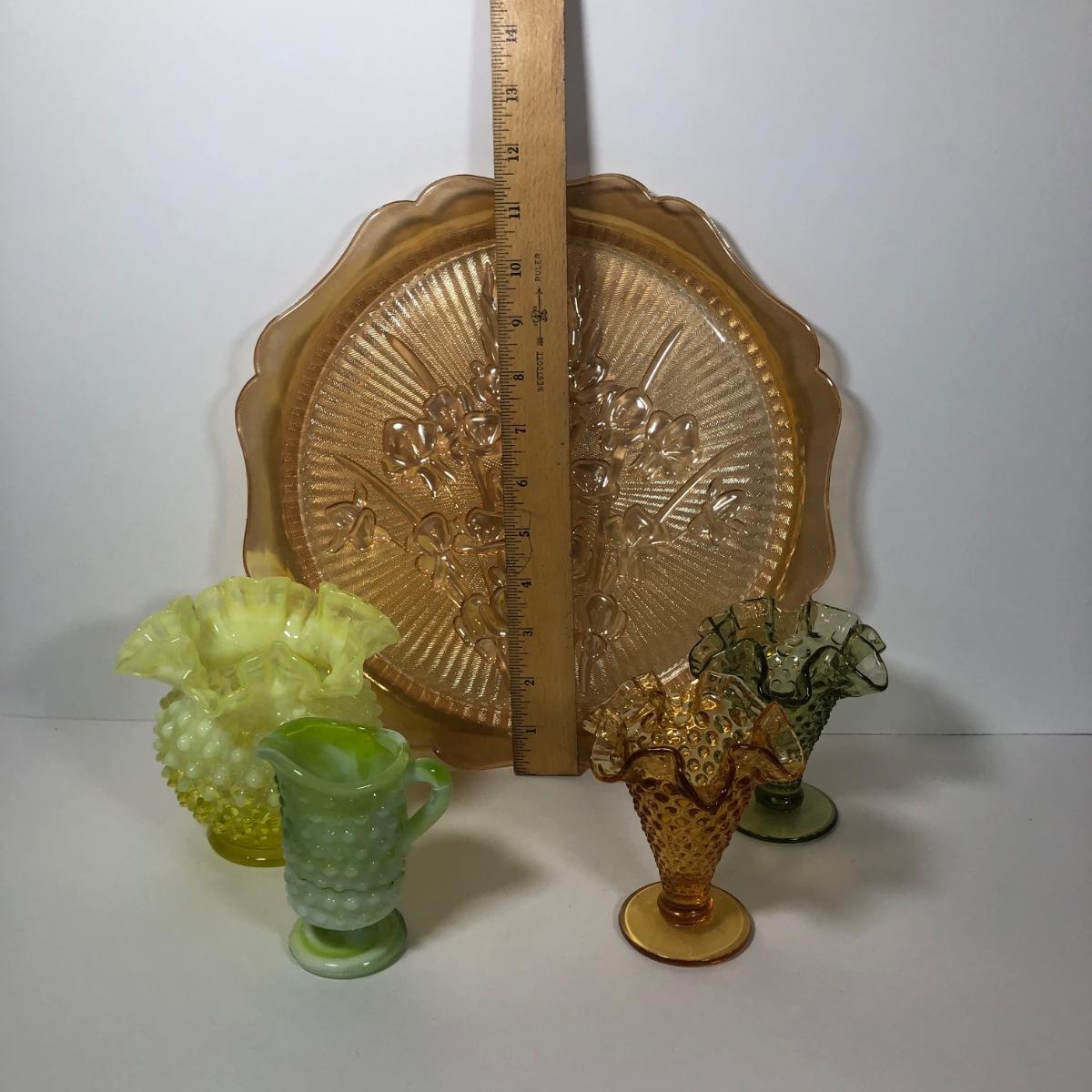 LOT 132K: Vintage Glass - Jeannette Iridescent Marigold Carnival Glass Iris & Herringbone 12" Plate, Fenton Style Ruffle Top Hobnail Opalescent Vaseline Yellow Vase & More