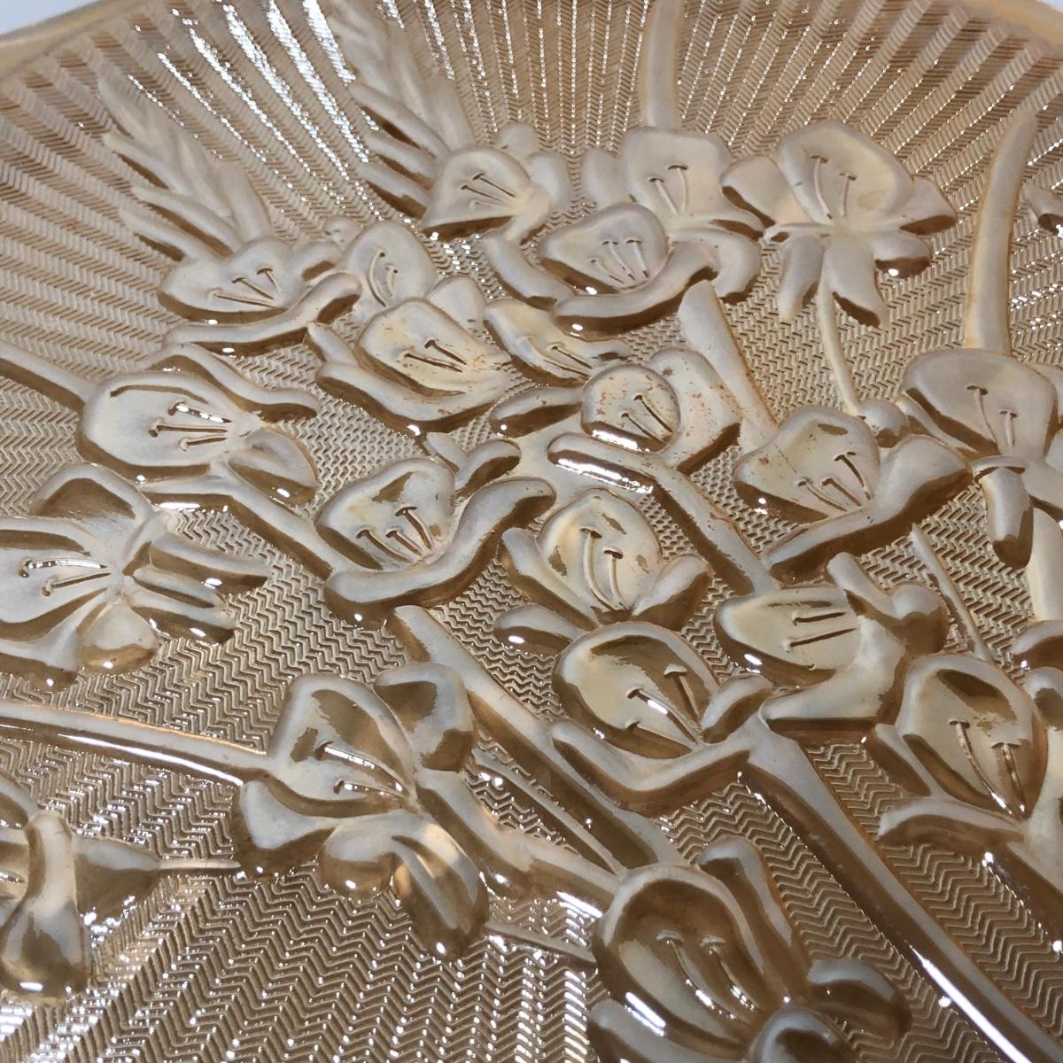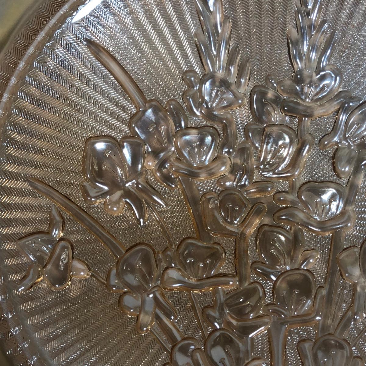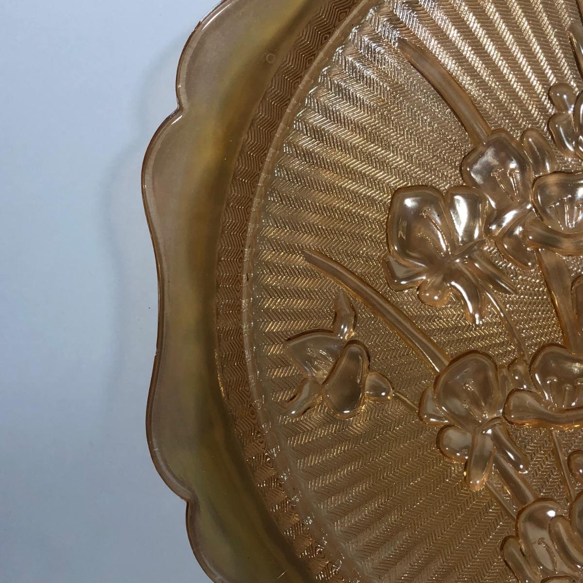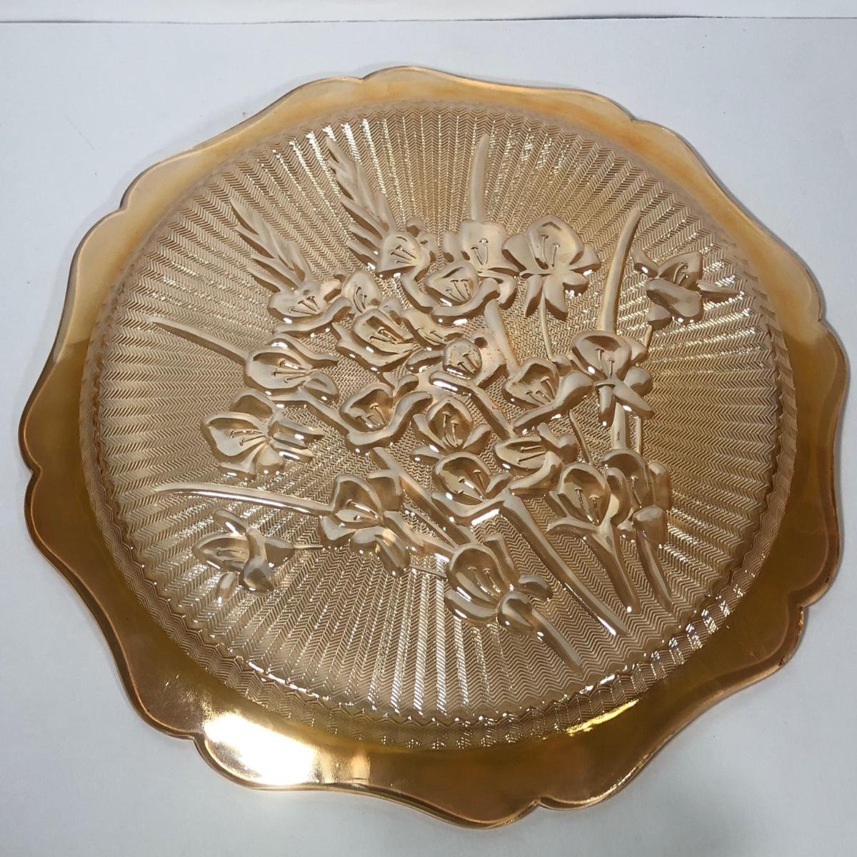 LOT 132K: Vintage Glass - Jeannette Iridescent Marigold Carnival Glass Iris & Herringbone 12" Plate, Fenton Style Ruffle Top Hobnail Opalescent Vaseline Yellow Vase & More