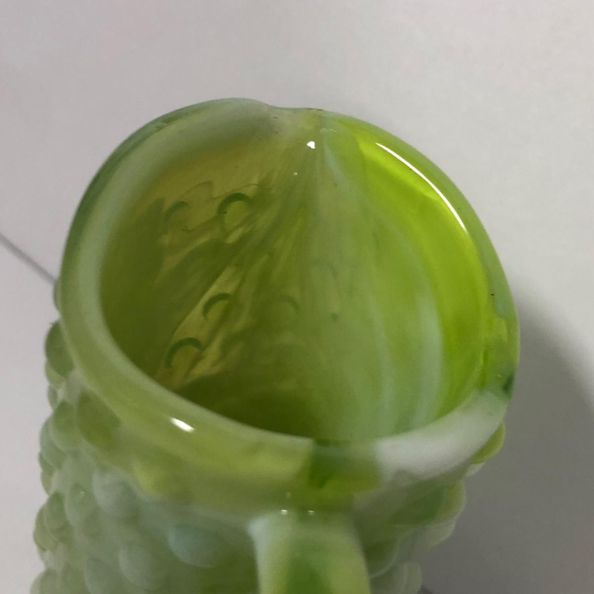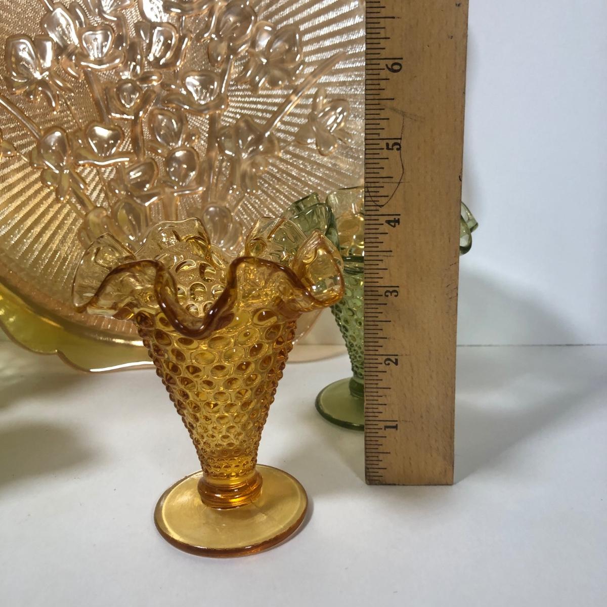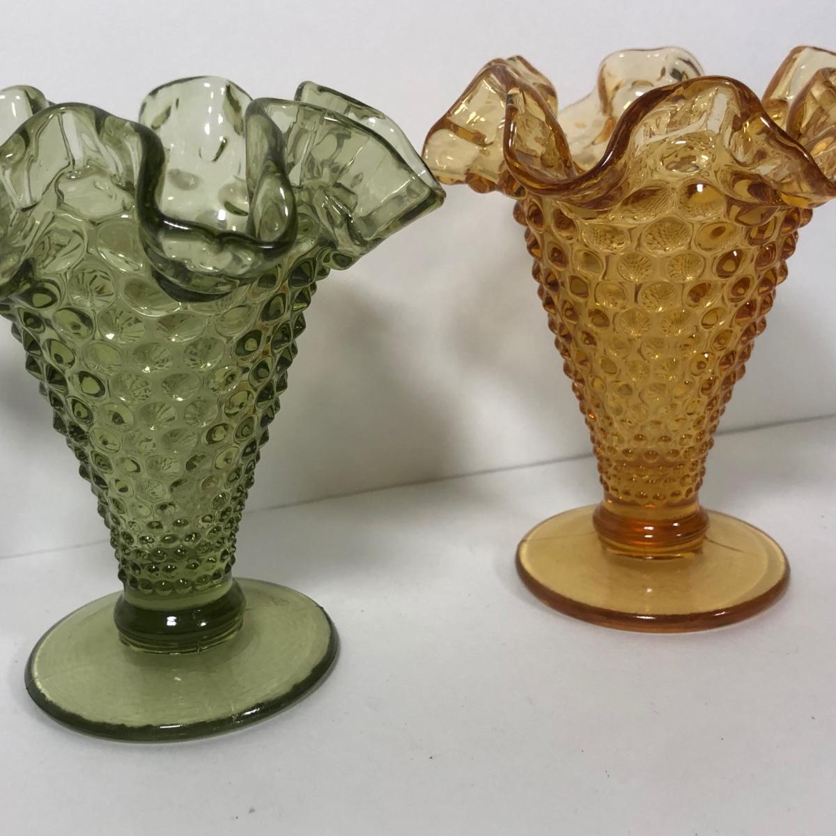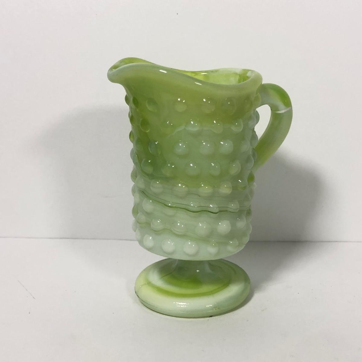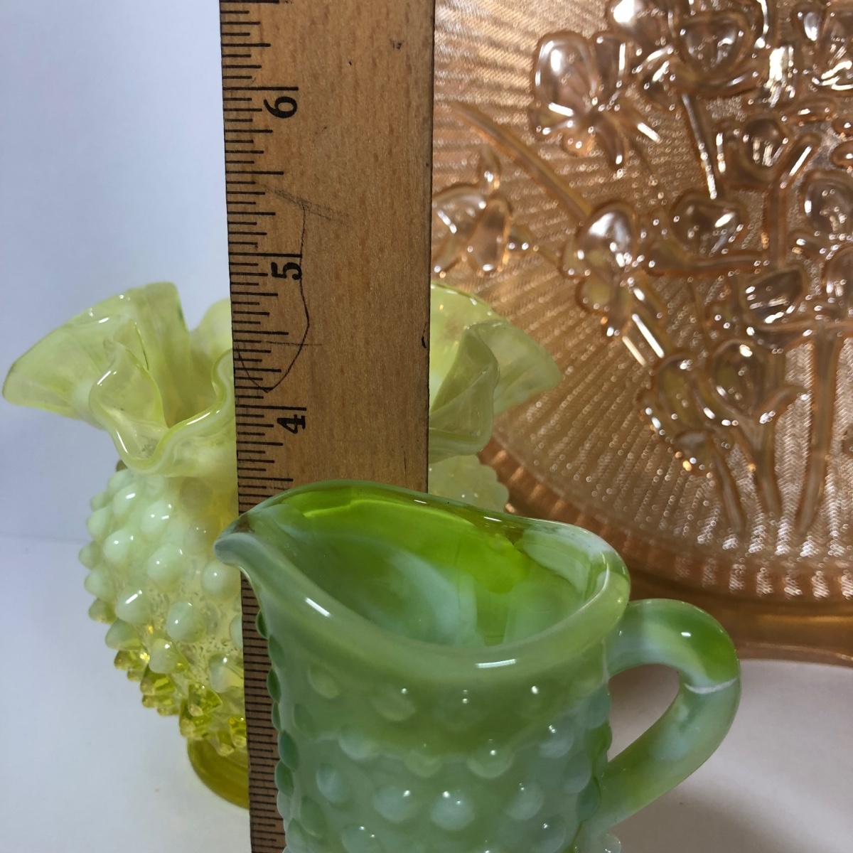 Also includes 2 Fenton style hobnail footed vases (green & amber) and a milky green hobnail swirl pitcher.
