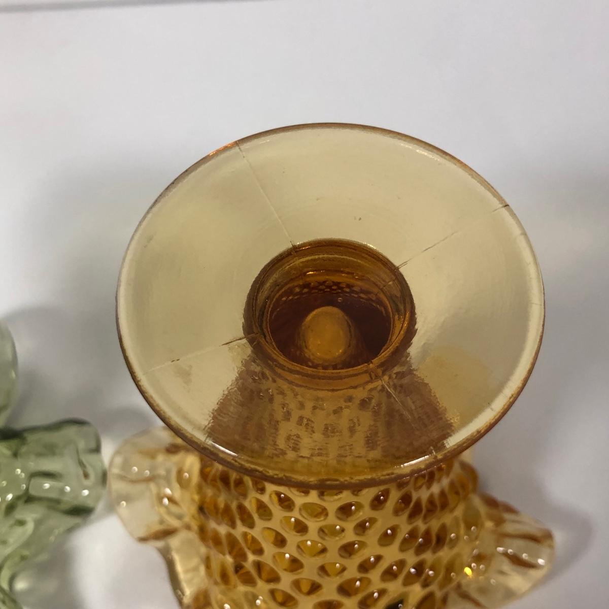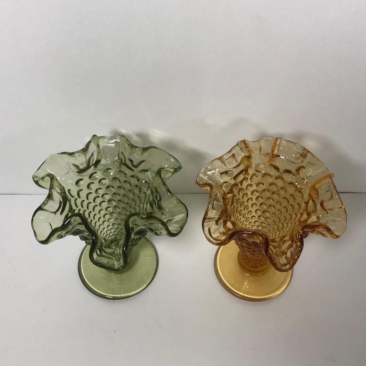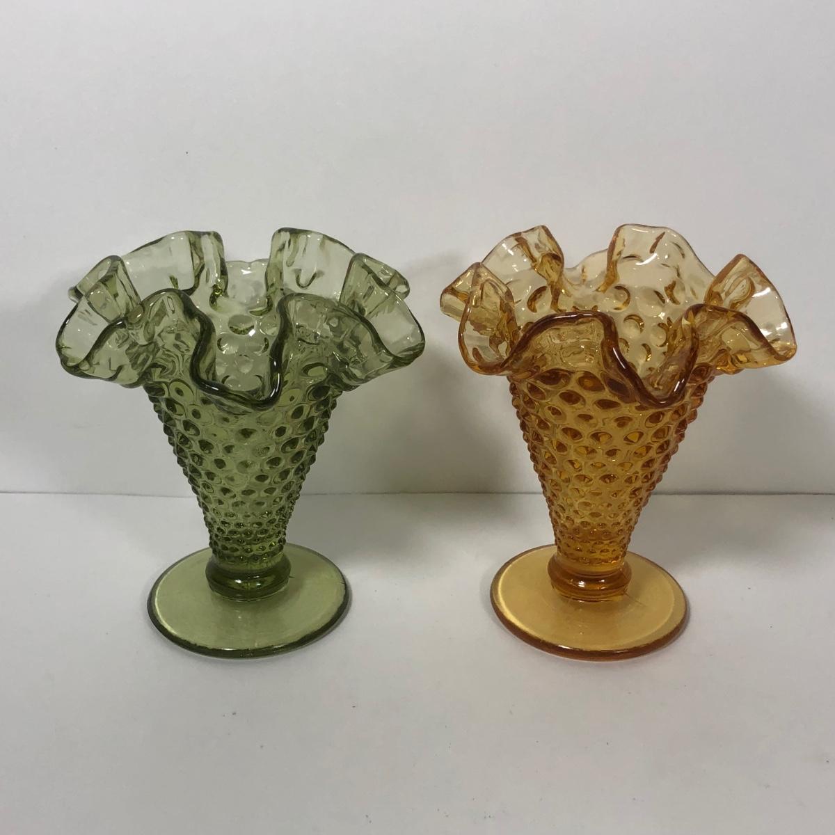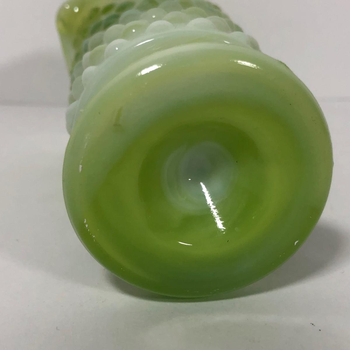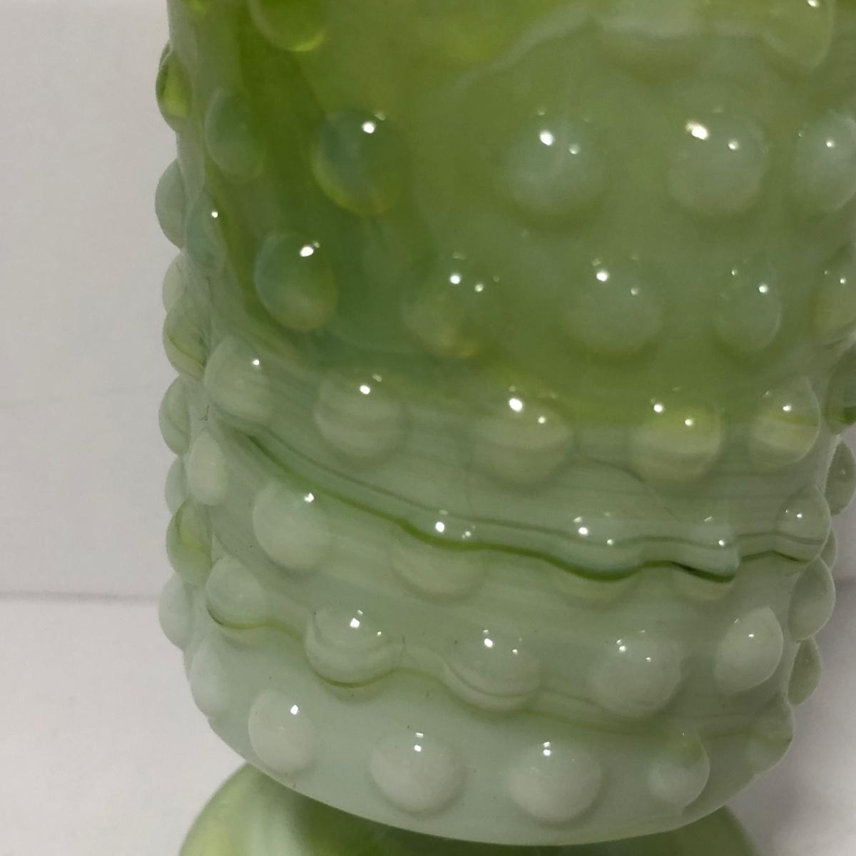 Also includes 2 Fenton style hobnail footed vases (green & amber) and a milky green hobnail swirl pitcher.