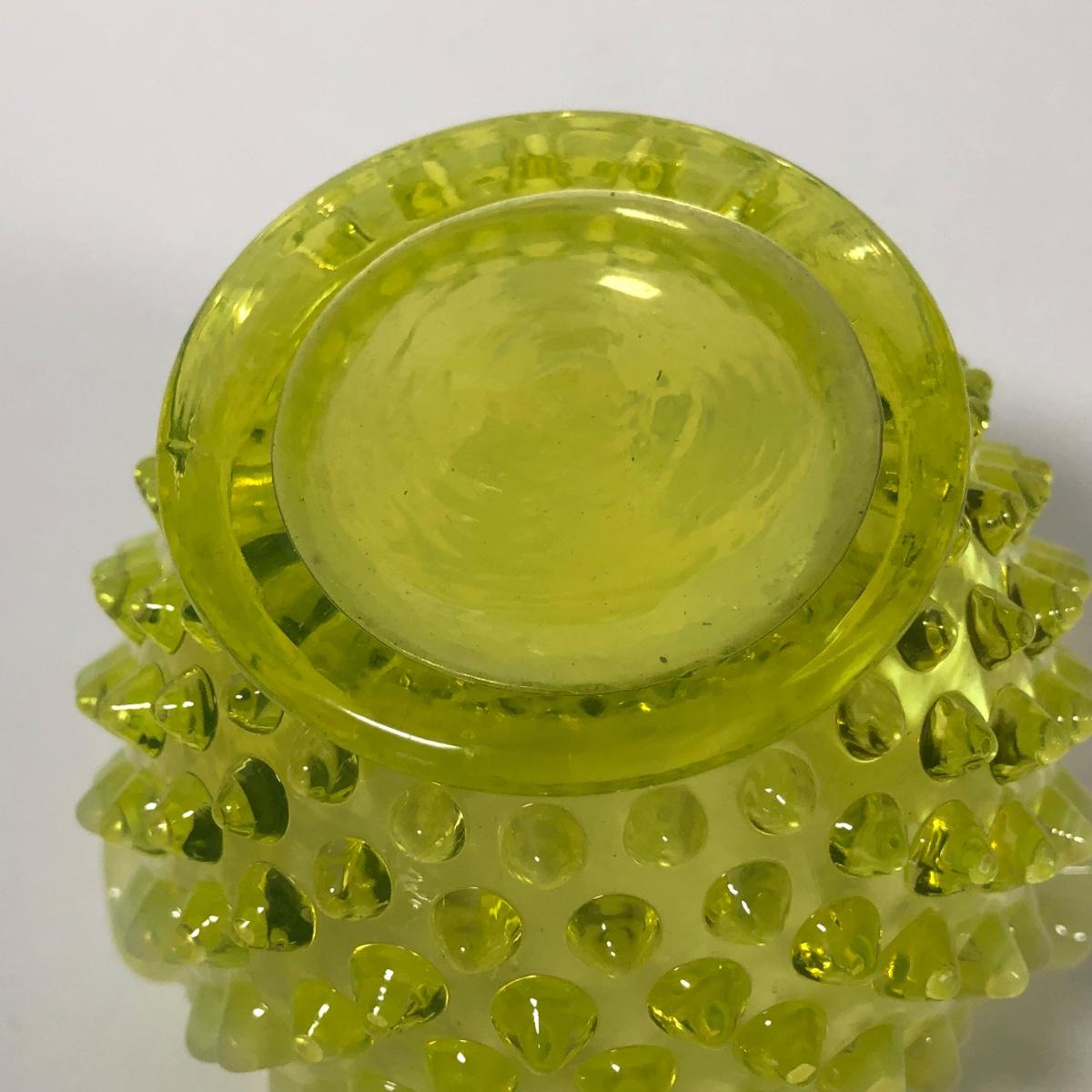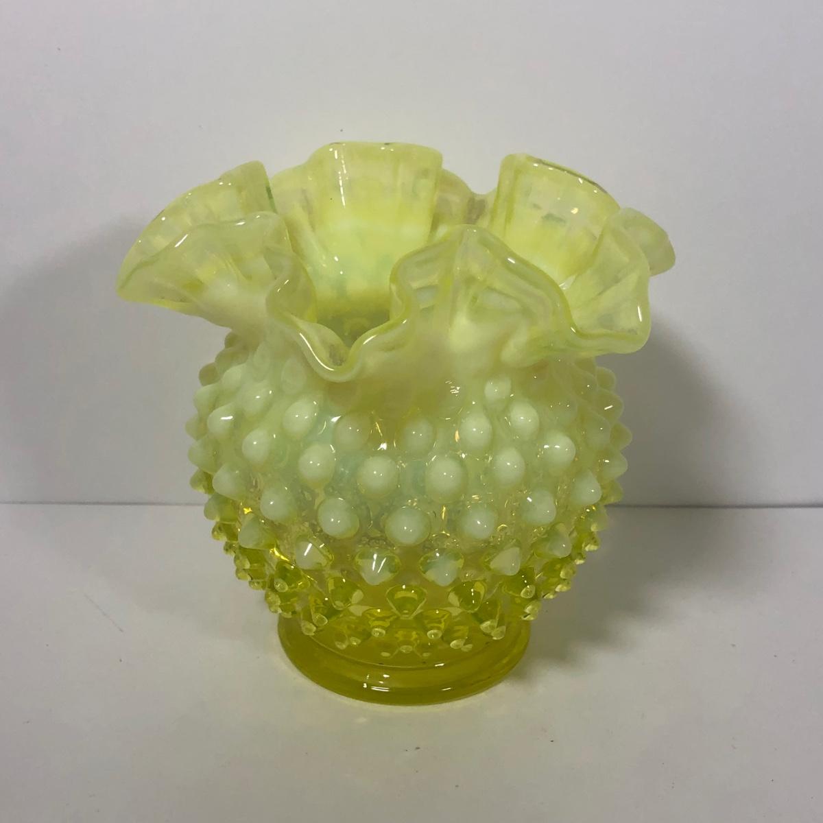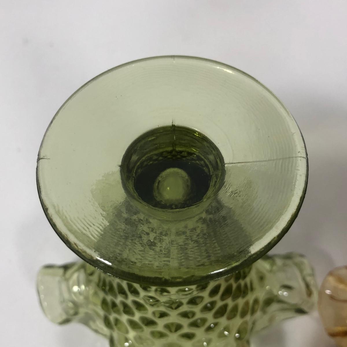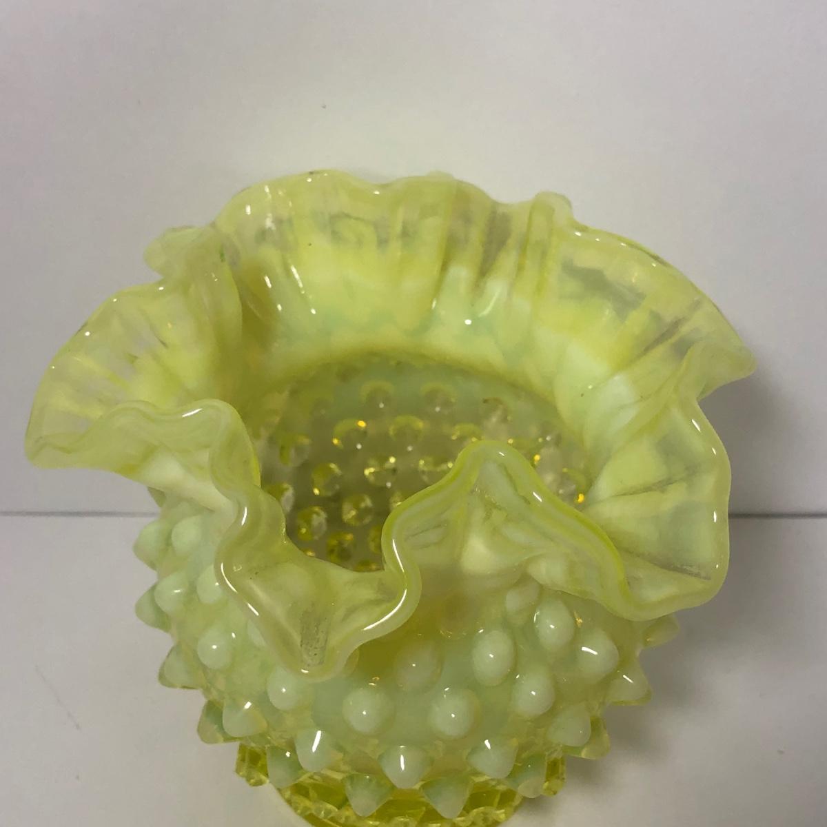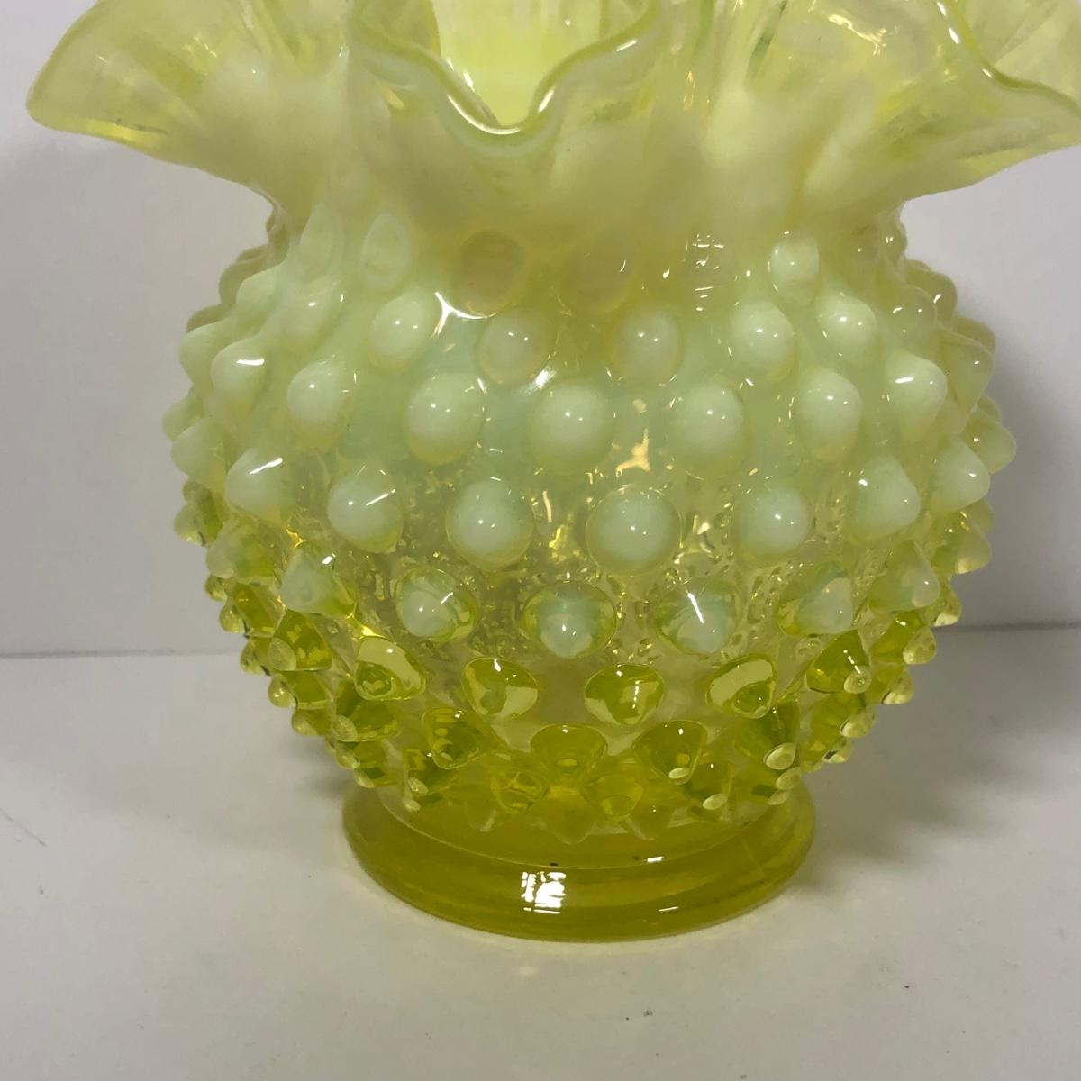 Also includes 2 Fenton style hobnail footed vases (green & amber) and a milky green hobnail swirl pitcher.