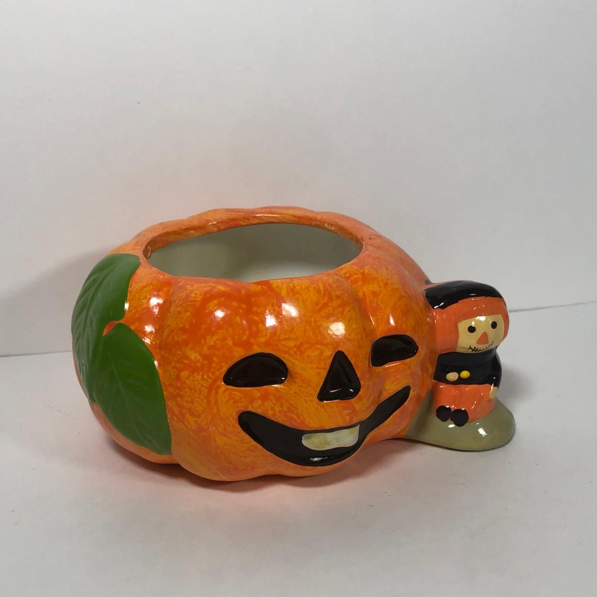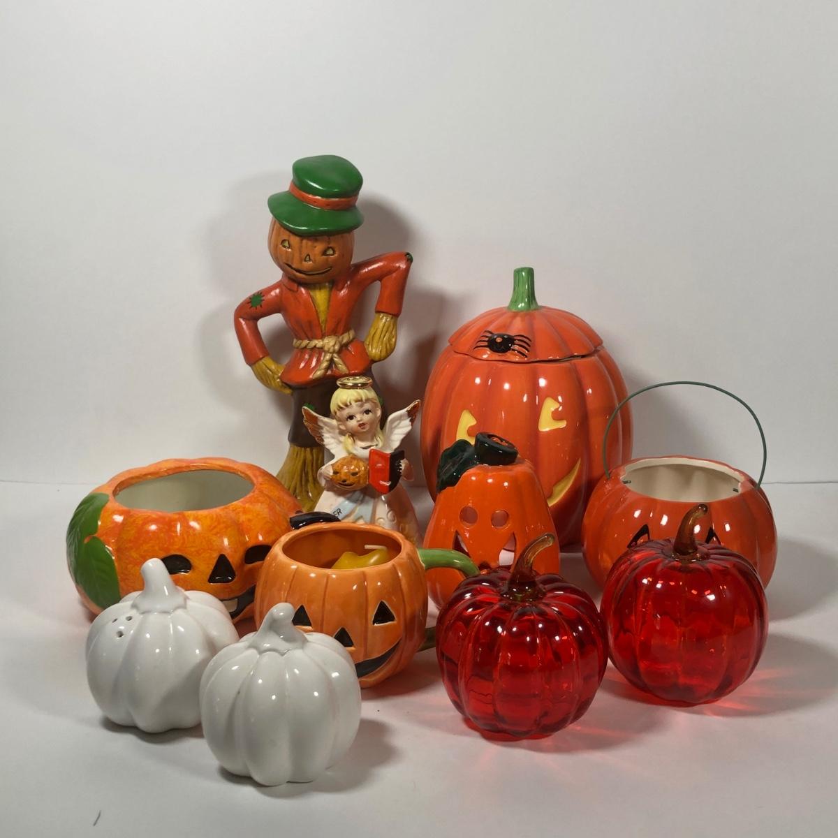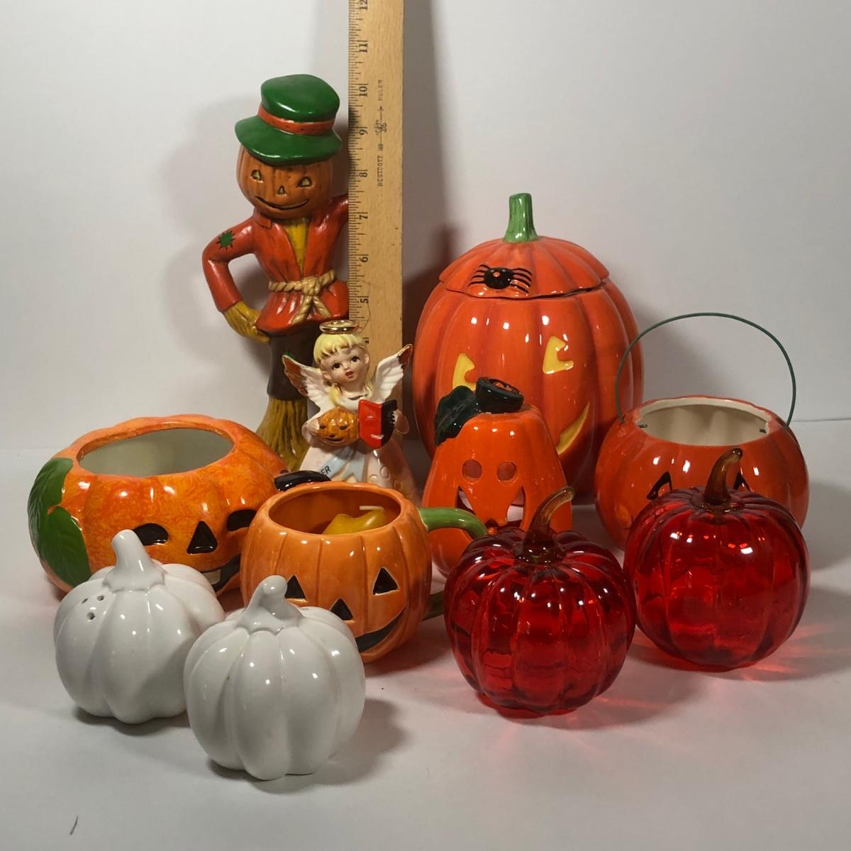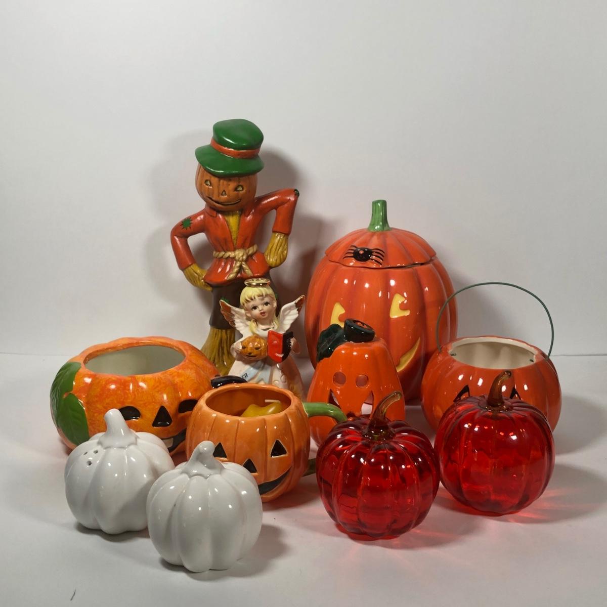 LOT 133K: Halloween Pumpkin Decor - Vintage October Angel, Glass Pumpkins, S&P Shaker, Ceramic Scarecrow, Candle Holders & More