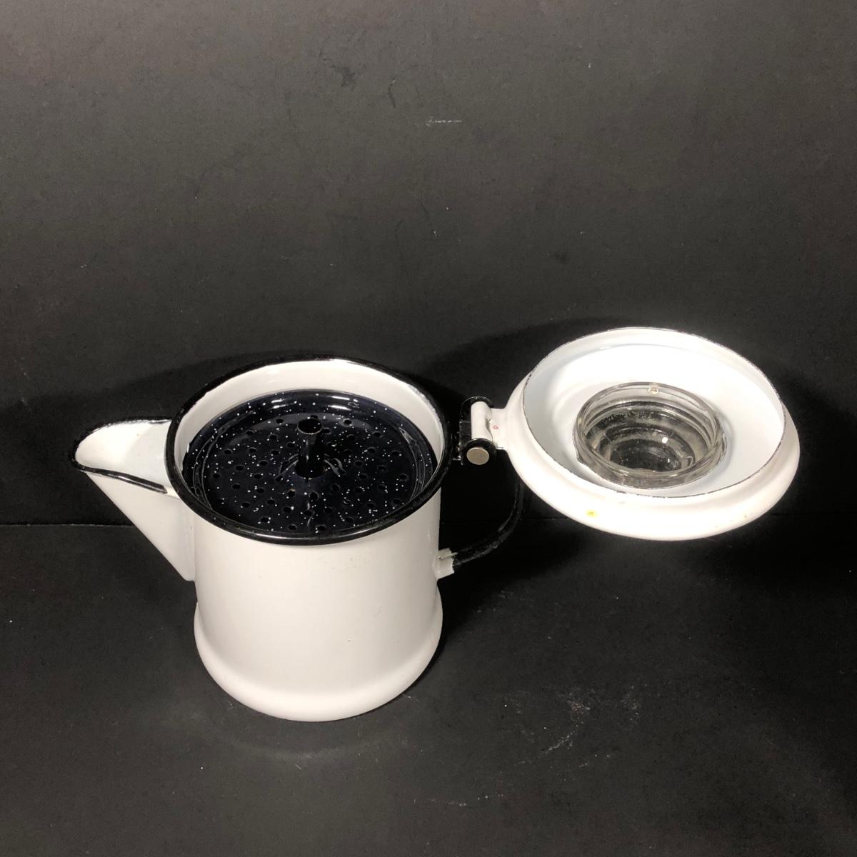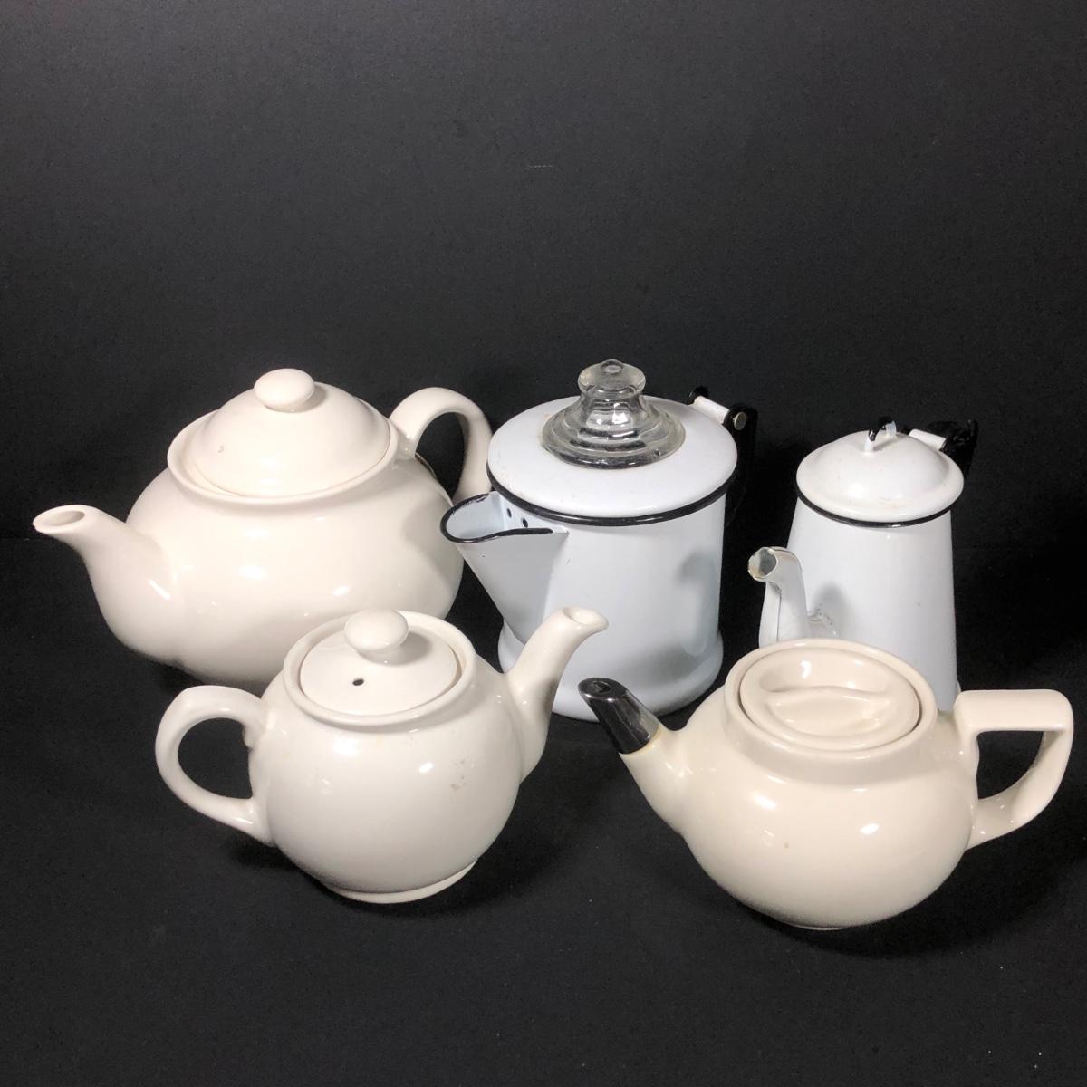 LOT 137K: Enamel Percolator & Tea Pot w/ Ceramic Tea Pots incl. Hall & Cook's Club