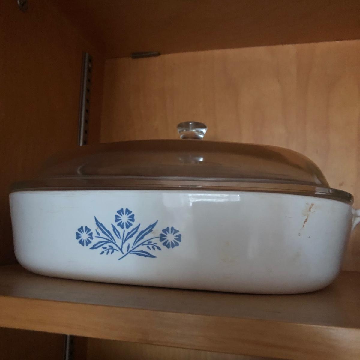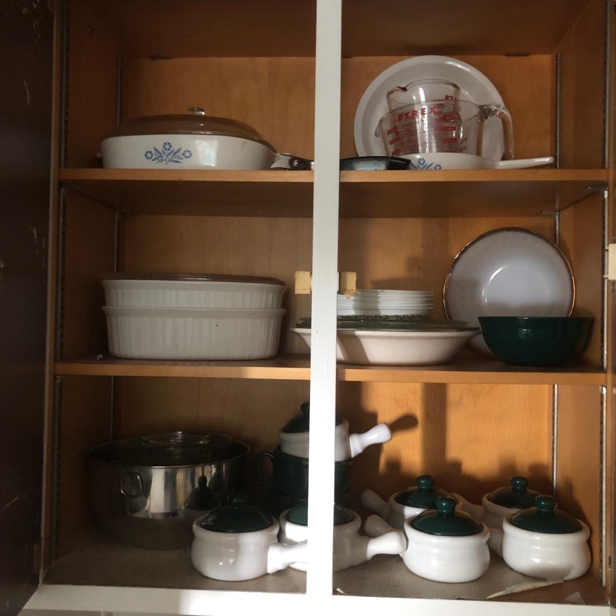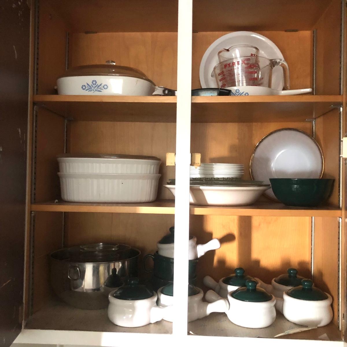LOT 140K: Kitchen Cabinet - Pyrex, Blue Cornflower Corningware, Corelle, Fire King & More