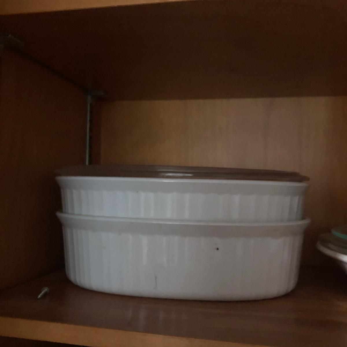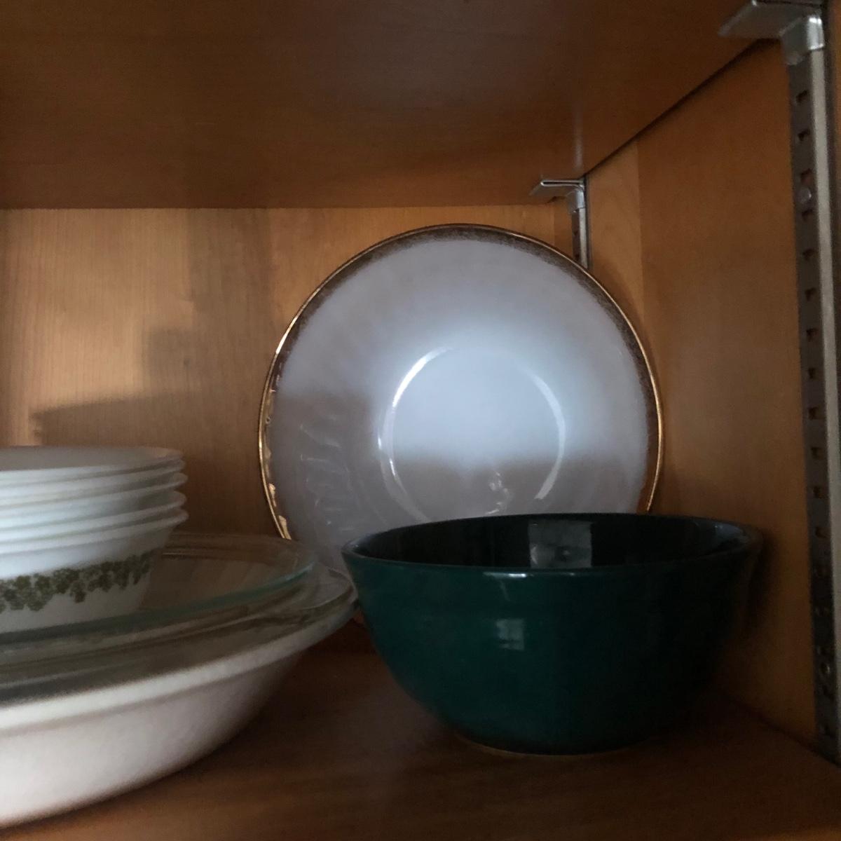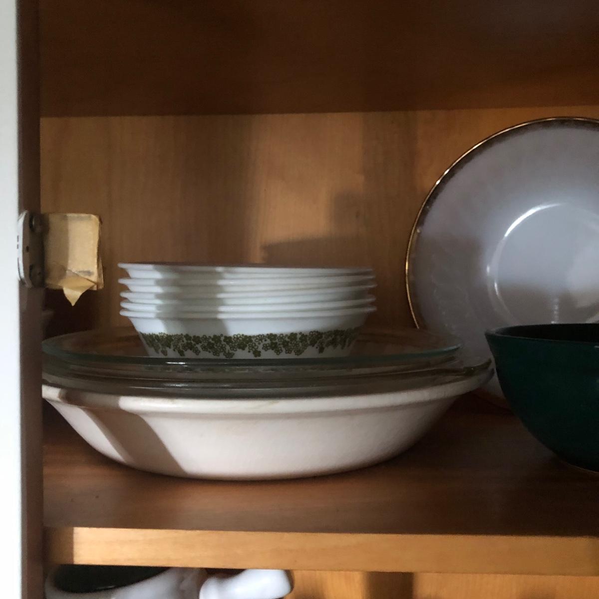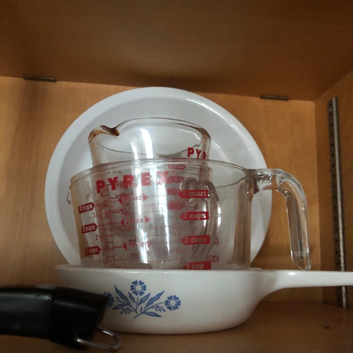 LOT 140K: Kitchen Cabinet - Pyrex, Blue Cornflower Corningware, Corelle, Fire King & More